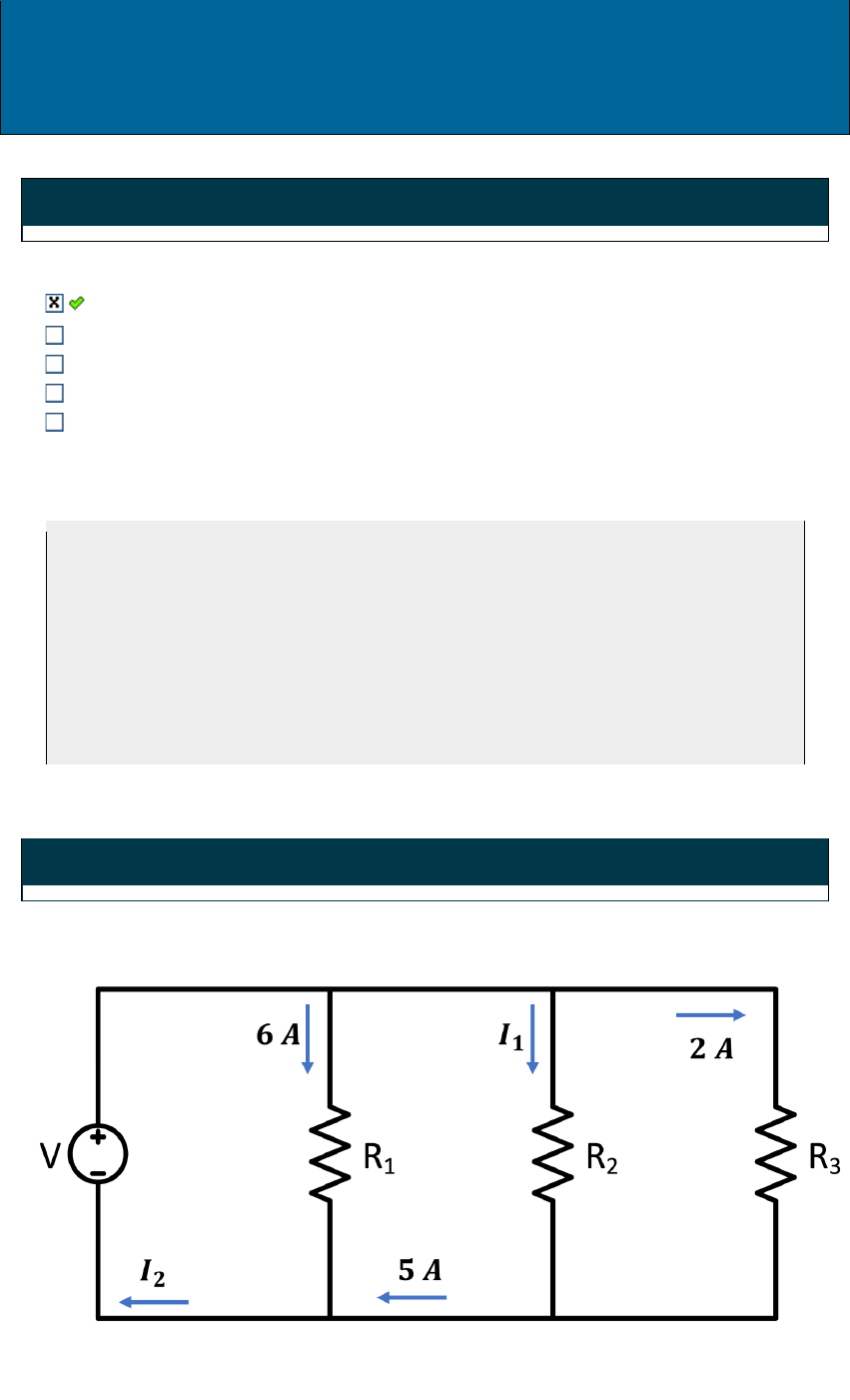 Disc.: ELETRICIDADE APLICADA Aluno(a): Acertos: 2,0 de 2,0 22/11/2023 1a Questão / Acerto: 0,2 / 0,2 (AGECOM / 2010) Em se tratando de corrente, é correto afirmar que: A unidade de medida é o Ampere. Pode ser medida com um voltímetro. É a potência de um equipamento. Pode ser 110V ou 220V. É a diferença de potencial entre dois pontos. Respondido em 22/11/2023 15:52:49 Explicação: Justificativa: A diferença de potencial ou tensão elétrica se refere à diferença entre o potencial (elétrico) entre dois pontos. A unidade de medida desta grandeza é o volt. Assim, a ddp se refere à tensão, podendo, dessa forma, se afirmar que corrente elétrica não é ddp, e sim que ela ocorre devido à existência desta. A corrente se refere ao fluxo ordenado de partículas, quando há potencial elétrico. Esta, por sua vez, é medida em ampere, que é simbolizado pela opção "a unidade de medida é o Ampere". 2a Questão / Acerto: 0,2 / 0,2 Com base na Lei de Kirchhoff das correntes, pode-se afirmar que as correntes I1�1 e I2�2 descritas no circuito da figura valem respectivamente Fonte: Autora 2A e 9A. 9A e 2A. 4A e 7A. 11A e 3A. 3A e 11A. Respondido em 22/11/2023 15:58:03 Explicação: Justificativa: A corrente I2�2 refere-se à corrente total do circuito, que retorna para a fonte. Aplicando a LKC na extremidade do ramo que contém o resistor R1�1, tem-se: I2=6+5=11A�2=6+5=11� Já para o ramo que contém o resistor R2�2, tem-se: 6=I1+2→I1=5−2=3A6=�1+2→�1=5−2=3� 3a Questão / Acerto: 0,2 / 0,2 (Fundação Getulio Vargas - FGV - 2013 - MPE/MS) A figura a seguir apresenta um circuito de corrente contínua, composto de uma fonte e três resistores. O circuito equivalente de Norton, visto pelo resistor R, entre os pontos A e B, é composto por: uma fonte de 3A e um resistor em série de 12Ω. uma fonte de 3A e um resistor em série de 50Ω. uma fonte de 6A e um resistor em série de 40Ω. uma fonte de 6A e um resistor em paralelo de 30Ω. uma fonte de 3A e um resistor em paralelo de 12Ω. Respondido em 22/11/2023 16:38:34 Explicação: Gabarito: uma fonte de 3A e um resistor em paralelo de 12Ω. Justificativa: RN=20x3050=12Ω��=20�3050=12Ω i=6050�=6050 Vth=60−20x65=36V��ℎ=60−20�65=36� V=Ri�=�� IN=3612=3A��=3612=3� 4a Questão / Acerto: 0,2 / 0,2 O circuito ilustrado na Figura 41 está ligado em triângulo. Os valores de R1�1, R2�2 e R3�3, referentes aos resistores de seu equivalente em estrela, são, respectivamente: Figura 41: Simulado - Exercício 4 - Fonte: Isabela Oliveira Guimarães 4Ω,4Ω,8Ω4Ω,4Ω,8Ω 4Ω,4Ω,4Ω4Ω,4Ω,4Ω 8Ω,8Ω,8Ω8Ω,8Ω,8Ω 8Ω,8Ω,4Ω8Ω,8Ω,4Ω 8Ω,4Ω,4Ω8Ω,4Ω,4Ω Respondido em 22/11/2023 16:50:11 Explicação: Com base nas equações de transformação do circuito triângulo para estrela, tem-se: R1=RBRCRA+RB+RC=24×2424+24+24=8Ω�1=������+��+��=24×2424+24+24=8Ω R2=RARCRA+RB+RC=24×2424+24+24=8Ω�2=������+��+��=24×2424+24+24=8Ω R3=RARBRA+RB+RC=24×2424+24+24=8Ω�3=������+��+��=24×2424+24+24=8Ω Observa-se, portanto, que o circuito é equilibrado e seu equivalente em triângulo poderia ser facilmente encontrado pela equação: RY=RΔ3=243=8Ω��=�Δ3=243=8Ω 5a Questão / Acerto: 0,2 / 0,2 (Prefeitura de Colônia Leopoldina - AL / 2019) Leia as afirmativas a seguir: I. Os fios e os cabos são os tipos mais conhecidos de condutores elétricos. II. O condutor elétrico é o produto destinado a conduzir a corrente elétrica. III. Isolantes são materiais que não conduzem corrente elétrica. Marque a alternativa correta: A afirmativa II é verdadeira, I e III são falsas. A afirmativa III é verdadeira, I e II são falsas. As três afirmativas são verdadeiras. As três afirmativas são falsas. A afirmativa I é verdadeira, II e III são falsas. Respondido em 22/11/2023 16:50:52 Explicação: Justificativa: A alternativa correta é "as três afirmativas são verdadeiras", pois a corrente elétrica é conduzida por fios e cabos, o que depende da aplicação, sendo estes de material condutor. Os isolantes, por sua vez, não conduzem corrente elétrica. 6a Questão / Acerto: 0,2 / 0,2 Considere o circuito da figura. A partir dos conceitos da Lei de Kirchhoff das correntes (LKC), o valor das correntes I1�1 a I4�4, ilustradas na figura, são, respectivamente: Fonte: Alexander; Sadiku (2013, p. 60) I1=10A,I2=−10A,I3=8A,I4=−6A�1=10�,�2=−10�,�3=8�,�4=−6� I1=8A,I2=−5A,I3=3A,I4=2A�1=8�,�2=−5�,�3=3�,�4=2� I1=6A,I2=5A,I3=−4A,I4=7A�1=6�,�2=5�,�3=−4�,�4=7� I1=12A,I2=−10A,I3=5A,I4=−2A�1=12�,�2=−10�,�3=5�,�4=−2� I1=12A,I2=10A,I3=5A,I4=−8A�1=12�,�2=10�,�3=5�,�4=−8� Respondido em 22/11/2023 16:53:52 Explicação: Justificativa: Aplicando a LKC: Nó 2: 3+7+I2=0→I2=−10A3+7+�2=0→�2=−10� Nó 1: I1+I2=2→I1=2−I2=12A�1+�2=2→�1=2−�2=12� Nó 4: 2=I4+4→I4=2−4=−2A2=�4+4→�4=2−4=−2� Nó 3: 7+I4=I3→I3=7−2=5A7+�4=�3→�3=7−2=5� 7a Questão / Acerto: 0,2 / 0,2 (MPE - GO / 2010) Com relação aos teoremas de Thévenin e Norton, assinale a alternativa correta. A aplicação do teorema de Norton resulta em uma fonte de corrente em série com uma resistência. O teorema de Thévenin somente pode ser aplicado a circuitos capacitivos. Para um mesmo circuito em que esses teoremas sejam válidos, a resistência equivalente calculada pelos teoremas de Thévenin e Norton é a mesma. A aplicação do teorema de Thévenin resulta em uma fonte de tensão em paralelo com uma resistência. O teorema de Norton somente pode ser aplicado a circuitos indutivos. Respondido em 22/11/2023 17:15:12 Explicação: Gabarito: Para um mesmo circuito em que esses teoremas sejam válidos, a resistência equivalente calculada pelos teoremas de Thévenin e Norton é a mesma. Justificativa: • O teorema de No