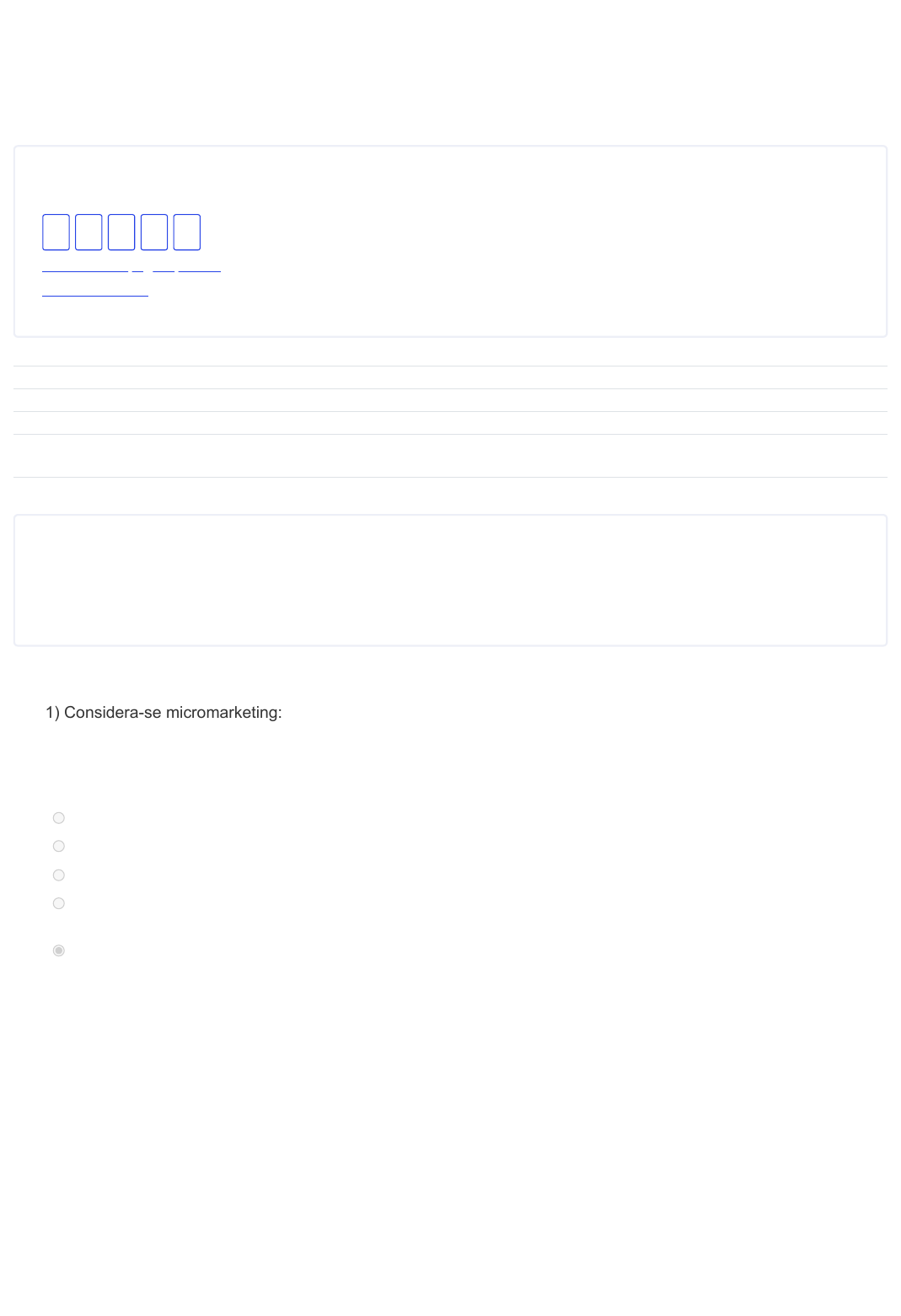 Iniciado em segunda-feira, 6 nov. 2023, 22:46 Estado Finalizada Concluída em segunda-feira, 6 nov. 2023, 22:53 Tempo empregado 6 minutos 28 segundos Avaliar 10,0 de um máximo de 10,0(100%) QUESTÃO Correto Atingiu 2,0 de 2,0 Navegação do questionário Mostrar uma página por vez Terminar revisão 1 2 3 4 5 1 1) Considera-se micromarketing: Escolha uma opção: a. Descrição do que deve ser alcançado e onde e como o esforço de venda dos vendedores deve ser empregado. b. Ações de marketing que a empresa adotará nos próximos três, quatro ou cinco anos. c. Ações de marketing direcionadas as micro e pequenas empresas. d. As atividades relacionadas ao gerenciamento da loja e das mercadorias na loja que incluem determinação de preço de varejo, localização da loja, comunicação do varejo e mercadorias. e. Como uma organização direciona suas atividades de marketing e aloca seus recursos para beneficiar seus clientes. Sua resposta está correta. A resposta correta é: Como uma organização direciona suas atividades de marketing e aloca seus recursos para beneficiar seus clientes. QUESTIONÁRIO Exercício de Fixação : Entendendo o mundo das Micro e Pequenas Empresas https://www.certificacaotecnica.com.br/mod/quiz/review.php?attempt=5207194&cmid=55635&showall=0 https://www.certificacaotecnica.com.br/mod/quiz/view.php?id=55635 QUESTÃO Correto Atingiu 2,0 de 2,0 QUESTÃO Correto Atingiu 2,0 de 2,0 2 2) Ao elaborar a estratégia de marketing da sua microempresa, você é aconselhado a estruturar um plano de ação atrelado à necessidade de compreender o ambiente mercadológico em que ela está inserida. Você faz uma breve pesquisa e encontra um programa de marketing utilizado para alcançar os consumidores usando uma combinação de algumas ferramentas, chamado: Escolha uma opção: a. Integração vertical. b. 4P - Produto, Preço, Promoção e Praça (Distribuição). c. 5W2H - What, Why, Where, When, Who, How e How much. d. 5S - Seiri, Seiton, Seiso, Seiketsu, Shitsuke. e. 3M - Mercado, Marca e Mix de Marketing. Sua resposta está correta. A resposta correta é: 4P - Produto, Preço, Promoção e Praça (Distribuição). 3 3) São considerados fatores ambientais em uma decisão de marketing, exceto: Escolha uma opção: a. Legislação relacionada ao produto. b. Renda do consumidor. c. Equipe de trabalho. d. Cultura. e. Forças sociais. Sua resposta está correta. A resposta correta é: Equipe de trabalho. QUESTÃO Correto Atingiu 2,0 de 2,0 QUESTÃO Correto Atingiu 2,0 de 2,0 4 4) São características das microempresas, com exceção de: Escolha uma opção: a. Em geral, contam com no máximo dez empregados. b. Podem ser compostas de sociedade empresária, sociedade simples, empresa individual de responsabilidade limitada e por empresário. c. Podem optar pelo Sistema Integrado de Pagamento de Impostos e Contribuições. d. Devem auferir em cada ano-calendário a receita bruta igual ou inferior a R$ 360.000,00. e. Tem no máximo um empregado contratado que receba o salário mínimo ou o piso da categoria. Sua resposta está correta. A resposta correta é: Tem no máximo um empregado contratado que receba o salário mínimo ou o piso da categoria. 5 5) São formas de contratação de funcionários que você, empresário de um pequeno negócio, pode adotar, exceto: Escolha uma opção: a. Carteira assinada, sendo o empregador responsável pela garantia do 13º salário, FGTS, recolhimento de INSS, parcela do vale-transporte e de alimentação, além de férias. b. Estágio de no máximo seis horas diárias de carga de trabalho. c. Terceirização para reduzir os custos com mão de obra. d. Contratação temporária, com isenção de custos adicionais como férias, 13º salário, INSS e FGTS. e. Jovem aprendiz, independente do número prévio de funcionários. Sua resposta está correta. A resposta correta é: Jovem aprendiz, independente do número prévio de funcionários.