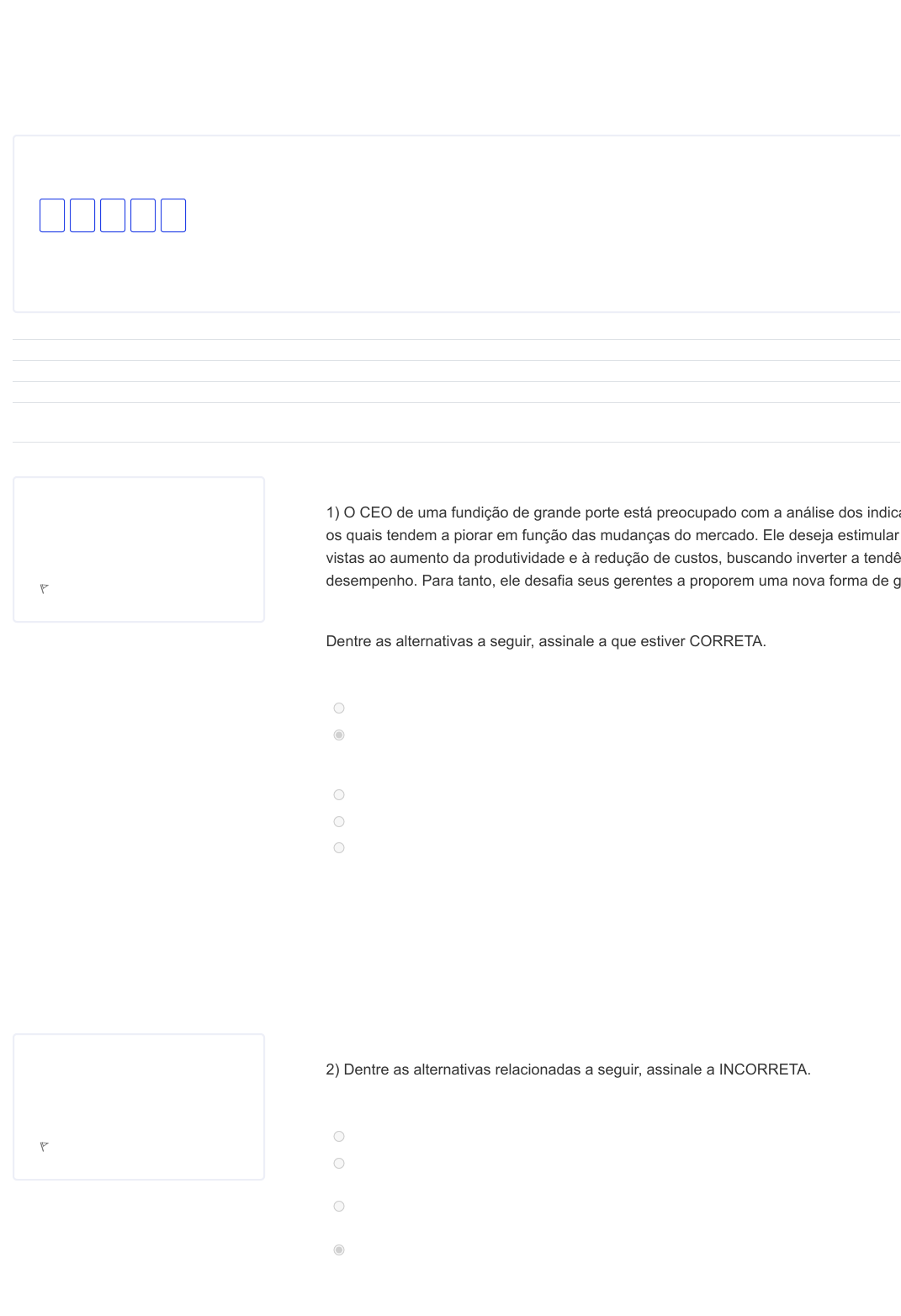 QUESTÃO Correto Atingiu 2,0 de 2,0 Marcar questão QUESTÃO Correto Atingiu 2,0 de 2,0 Marcar questão Iniciado em quarta-feira, 8 nov. 2023, 14:10 Estado Finalizada Concluída em quarta-feira, 8 nov. 2023, 14:14 Tempo empregado 3 minutos 29 segundos Avaliar 10,0 de um máximo de 10,0(100%) Navegação do questionário Mostrar uma página por vez Terminar revisão 1 2 3 4 5 1 1) O CEO de uma fundição de grande porte está preocupado com a análise dos indica os quais tendem a piorar em função das mudanças do mercado. Ele deseja estimular vistas ao aumento da produtividade e à redução de custos, buscando inverter a tendê desempenho. Para tanto, ele desafia seus gerentes a proporem uma nova forma de g Dentre as alternativas a seguir, assinale a que estiver CORRETA. Escolha uma opção: a. Permanecer no ambiente fabril e atuar de imediato nos problemas existentes, de forma a b. Realizar a coleta de dados por um período determinado para, a partir disso, realizar uma r colaboradores envolvidos a fim de planejar as ações a serem tomadas para eliminação do las e monitorá-las, fazendo as devidas correções quando necessário. c. Nenhuma das alternativas acima. d. Realizar reuniões semanais para identificar os problemas existentes e agir imediatamente e. Cobrar a solução dos problemas diretamente de cada um dos gerentes, de forma impositi reduzido para a solução. Sua resposta está correta. A resposta correta é: Realizar a coleta de dados por um período determinado para, a partir disso, rea colaboradores envolvidos a fim de planejar as ações a serem tomadas para eliminação dos problem las, fazendo as devidas correções quando necessário. 2 2) Dentre as alternativas relacionadas a seguir, assinale a INCORRETA. Escolha uma opção: a. A educação e o treinamento dos colaboradores de uma empresa são parte da etapa de ex b. Na etapa de planejamento do ciclo PDCA, são definidos metas e métodos para obtenção d organizacionais. c. A etapa de atuação corretiva do ciclo PDCA corresponde à ação no processo de produção distorções e direcionar o processo para o atingimento da meta da empresa. d. A etapa de planejamento do ciclo PDCA é a mais importante. QUESTIONÁRIO Exercício de Fixação : O Ciclo PDCA https://www.certificacaotecnica.com.br/mod/quiz/review.php?attempt=5218370&cmid=55278&showall=0 https://www.certificacaotecnica.com.br/mod/quiz/view.php?id=55278 QUESTÃO Correto Atingiu 2,0 de 2,0 Marcar questão QUESTÃO Correto Atingiu 2,0 de 2,0 Marcar questão e. A acurácia dos dados coletados é importante para a etapa de verificação do ciclo PDCA, po correta dos dados em relação às metas estabelecidas na empresa. Sua resposta está correta. A resposta correta é: A etapa de planejamento do ciclo PDCA é a mais importante. 3 3) O método dos métodos, como é conhecido o ciclo PDCA, tem como objetivo busca organizacionais por meio da implantação de melhorias e mantê-los ao longo do tempo Assinale abaixo a alternativa que NÃO corresponde à realidade. Escolha uma opção: a. Ao utilizar o ciclo PDCA em sua forma de gestão, a empresa demonstra um eficiente sistem atingimento de suas metas organizacionais. b. Após a obtenção de melhores resultados organizacionais, deve-se padronizar o processo e que os resultados alcançados não retroajam. c. Além do treinamento dos colaboradores, a etapa de execução compreende a realização do planejado e a coleta dos respectivos dados para análise posterior. d. A etapa de ação do ciclo PDCA é sempre realizada quando ocorrem desvios em relação às da realização de ações de melhoria. e. Uma vez aplicado o ciclo PDCA e padronizados os procedimentos e ações de melhorias im necessidade de repetição frequente do ciclo. Sua resposta está correta. A resposta correta é: Uma vez aplicado o ciclo PDCA e padronizados os procedimentos e ações de m necessidade de repetição frequente do ciclo. 4 4) Com relação ao ciclo PDCA, assinale verdadeiro ou falso. ( ) Dependendo do ramo de atividade da empresa, ela só deve aplicar a etapa de plan PDCA. ( ) O ciclo PDCA é um método utilizado para gerenciar os processos, objetivando a me por meio da manutenção de padrões existentes ou criação de novos padrões. ( ) O ciclo PDCA só se aplica em organizações da área do comércio ou da indústria, p ferramentas estatísticas que não se aplicam em outras áreas. ( ) O ciclo PDCA é composto por quatro etapas, sendo que a empresa deve escolher e melhor se adapta a sua realidade e metas organizacionais. Escolha uma opção: a. F-V-V-F. b. F-V-F-V. c. Todas alternativas são falsas. d. V-V-F-F. e. F-V-F-F. Sua resposta está correta. A resposta correta é: F-V-F-F. QUESTÃO Correto Atingiu 2,0 de 2,0 Marcar questão 5 5) Pode-se afirmar que a frase “Diga-me como gerencias a tua fábrica que eu te direi verdadeira, uma vez que o resultado organizacional é função direta da forma como é empresa. Dentre as alternativas a seguir, assinale a forma de gestão que NÃO está alinhada co organizacionais. Escolha uma opção: a. Um gerente deve estar sempre disponível para apagar incêndios. b. Outra atividade inerente ao gerente é aplicar o ciclo PDCA em suas quatro etapas (planeja em sua área de responsabilidade. c. A gerência deve realizar sua gestão com base em um método de análise e solução de prob exemplo, o ciclo PDCA. d. O gerente deve aplicar um método de análise e solução de problemas para que a recorrên cada vez menor. e. Entre as responsabilidades básicas de um gerente, inclui-se a garantia de que os processo operações sejam estáveis e confiáveis. Sua resposta está correta. A resposta correta é: Um gerente deve estar sempre disponível para apagar incêndios.