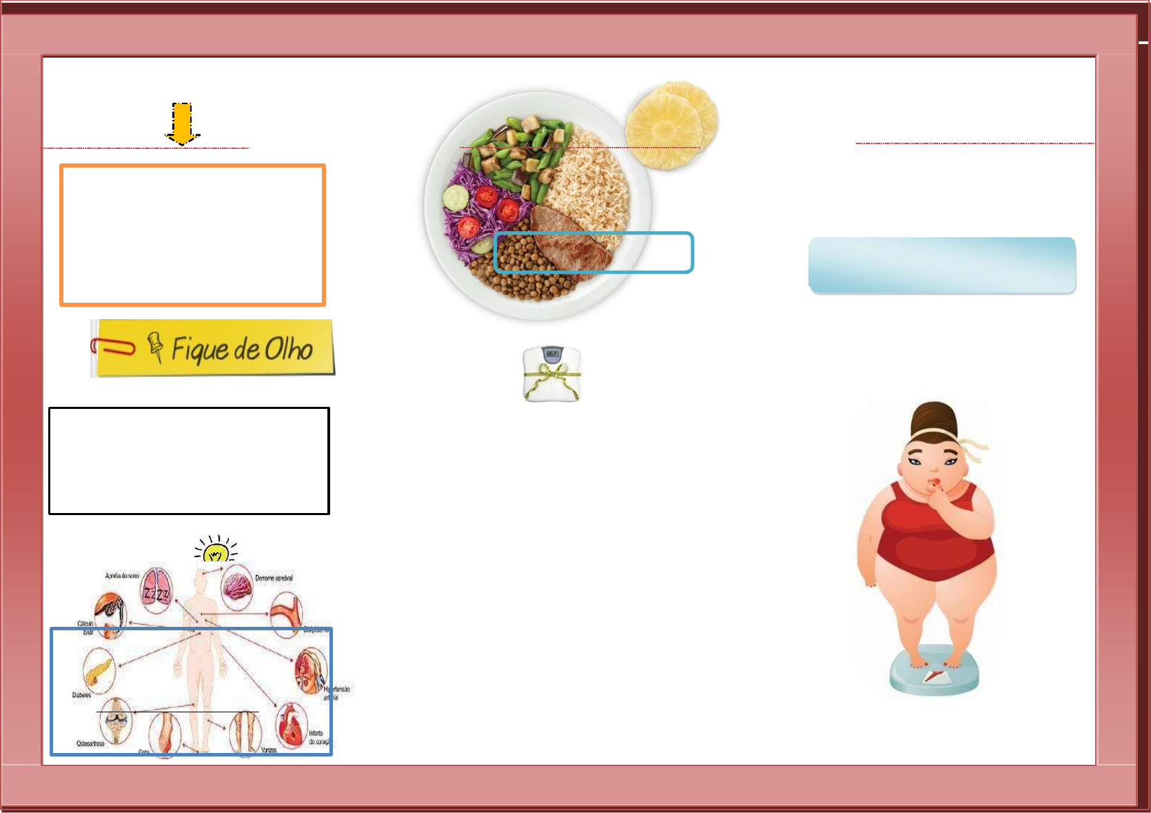 Atenção!Cada organismo reage de maneira diferenciada à ingestão de alimentos, ao tratamento medicamentoso e a prática de exercícios físicos, por isso, cada tratamento se dá de maneira única e individualizada! Lembre-seSe você está acima do peso, dirija-se a uma Unidade Básica de Saúde para se consultar com um médico e/ou nutricionista. Sempre... “Que seu remédio seja seu alimento, e que seu alimento seja seu remédio” Hipócrates. Obesidade Como tratar? Não existe mágica! Para manter o peso dentro dos valores desejáveis e controlar a obesidade, a melhor opção é ter uma alimentação balanceada e praticar atividades físicas regularmente. O que é Obesidade? · É uma doença de causa multifatorial decorrente do desequilíbrio entre a ingestão e o gasto de energia, em que o excesso de energia consumida da alimentação leva a um aumento da gordura corporal. · Constitui uma grande preocupação na área de saúde pública. · É fator de risco para uma série de doenças crônicas não transmissíveis, como: Hipertensão arterial, Diabetes Mellitus, Doenças cardiovasculares. · Principais comorbidades associadas à obesidade Como saber se estou Obeso? Para adultos, o padrão internacional para diagnóstico de obesidade é o Índice de Massa Corporal (IMC): IMC= peso÷altura² IMC (kg/m²) Diagnóstico Nutricional ≥18,5 e < 24,9 Adequado ou Eutrófico ≥25 e <30 Sobrepeso ≥30 Obesidade Estou Obeso! E agora? O tratamento da obesidade fundamenta-se em intervenções para: · Modificação do estilo de vida; · Orientação dietoterápica, incluindo Plano Alimentar que contemple adequação nutricional, variedade de alimentos e maior adesão, resultando em perda de peso saudável; · Aumento da prática de atividade física; · Mudanças comportamentais. E na hora de se Alimentar? · Fazer no mínimo, 3 refeições principais (café da manhã, almoço e jantar), intercaladas por pequenos lanches. · Evitar o consumo de grandes volumes de alimentos em uma única refeição e intervalos prolongados entre as refeições. · Consumir frequentemente cereais integrais. Estes alimentos são importantes fontes de fibras, e sempre que possível, devem fazer parte da alimentação diária. · Consumir diariamente, pelo menos 3 porções de frutas, legumes e verduras. Além disso, o consumo de verduras, legumes e frutas crus e cozidos, com casca e bagaço (daqueles que são comestíveis) e o seu aproveitamento integral devem ser estimulados. O uso deste grupo em preparações de massas, carnes e arroz torna a alimentação menos calórica. · Ingerir, pelo menos, 2 litros de água por dia, que correspondem a aproximadamente 8 copos americanos.