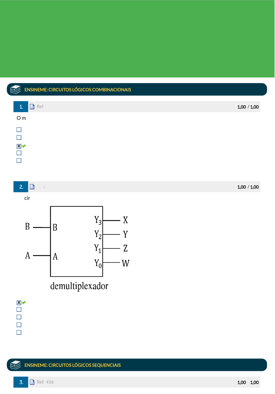 02/01/2024, 08:48 EPS https://simulado.estacio.br/alunos/ 1/4 Disciplina: ELETRÔNICA DIGITAL AV Aluno: VINÍCIUS FERREIRA DOS SANTOS 202209181541 Turma: 9001 DGT0120_AV_202209181541 (AG) 14/11/2023 13:05:49 (F) Avaliação: 10,00 pts Nota SIA: 10,00 pts Estação de trabalho liberada pelo CPF 08601339581 com o token 661420 em 14/11/2023 12:53:48. ENSINEME: CIRCUITOS LÓGICOS COMBINACIONAIS 1. Ref.: 3990182 Pontos: 1,00 / 1,00 O maior valor decimal que pode ser representado com 12 bits utilizando a codi�cação BCD é: 9999 99 999 1000 100 2. Ref.: 3990189 Pontos: 1,00 / 1,00 No circuito, a seguir, qual a saída (XYZW) quando B = 0 e A = 1? 0010 1101 1011 0001 0100 ENSINEME: CIRCUITOS LÓGICOS SEQUENCIAIS 3. Ref.: 4161258 Pontos: 1,00 / 1,00 javascript:alert('C%C3%B3digo da quest%C3%A3o: 3990182.'); javascript:alert('C%C3%B3digo da quest%C3%A3o: 3990182.'); javascript:alert('C%C3%B3digo da quest%C3%A3o: 3990189.'); javascript:alert('C%C3%B3digo da quest%C3%A3o: 3990189.'); javascript:alert('C%C3%B3digo da quest%C3%A3o: 4161258.'); javascript:alert('C%C3%B3digo da quest%C3%A3o: 4161258.'); 02/01/2024, 08:48 EPS https://simulado.estacio.br/alunos/ 2/4 Um contador crescente de 4 bits, com clear e load síncronos, oferece a saída Q3Q2Q1Q0. Sabendo-se que o número em binário 1000 está ligado à sua entrada paralela de carregamento, que a lógica (Q2.Q0) aciona o load e que a lógica (Q3.Q1) aciona o clear, o número de estados da sequência permanente é: 10 7 8 9 12 4. Ref.: 4158261 Pontos: 1,00 / 1,00 A seguir temos um contador digital implementado com 4 (quatro) �ip-�ops tipo JK. Informe se é verdadeiro (V) ou falso (F) o que se a�rma abaixo sobre o contador digital. ( ) É um contador modo 16. ( ) Quando a chave S1 está na posição T (tal como na �gura), é um contador modo 13. ( ) Quando a chave S1 está na posição W (posição outra que a da �gura), é um contador modo 10. ( ) Além dos estados �rmes que de�nem o modo do contador, esse contador apresenta um estado de transição. (F); (F); (V); (V) (F); (V); (V); (F) (V); (V); (F); (F) (V); (F); (F); (V) (F); (V); (F); (V) ENSINEME: DISPOSITIVOS DE MEMÓRIA 5. Ref.: 3992831 Pontos: 1,00 / 1,00 Marque a alternativa correta em relação a operação de refresh: É o procedimento de repotencialização de dados realizados nas memórias DRAM É o procedimento para apagar os dados de uma memória EPROM É a reinserção de dados após uma leitura realizada nas memórias dinâmicas javascript:alert('C%C3%B3digo da quest%C3%A3o: 4158261.'); javascript:alert('C%C3%B3digo da quest%C3%A3o: 4158261.'); javascript:alert('C%C3%B3digo da quest%C3%A3o: 3992831.'); javascript:alert('C%C3%B3digo da quest%C3%A3o: 3992831.'); 02/01/2024, 08:48 EPS https://simulado.estacio.br/alunos/ 3/4 É o procedimento para acessar um endereço especí�co numa memória SPROM É o procedimento de realizado para escrever dados em uma memória SRAM 6. Ref.: 3992834 Pontos: 1,00 / 1,00 Em informática, memória é um termo genérico utilizado para especi�car dispositivos capazes de armazenar dados ou programas, de forma permanente ou temporária. No que se refere ao uso de energia para manter a informação, as memórias são comumente classi�cadas como voláteis e não voláteis. Assinale a alternativa que apresenta SOMENTE memórias voláteis. DRAM e SRAM RAM ROM e EEPROM EPROM E DRAM RAM e FLASH ENSINEME: FLIP-FLOPS 7. Ref.: 3990392 Pontos: 1,00 / 1,00 Marque a alternativa que preenche as lacunas corretamente e em ordem: I - Nos ________ a saída, em geral, só se modi�ca em instantes especí�cos de tempo II - O sinal de _________ irá colocar a saída do �ip-�op em 0 assim que for ativado III - Para inverter a saída de um �ip-�op a entrada deve ser _______ . �ip-�ops, clear e 11 circuitos sequenciais, preset, 1 latches, clear e 1 �ip-�ops, relógio e 1 circuitos sequenciais, clear e 11 8. Ref.: 3990391 Pontos: 1,00 / 1,00 O circuito representado tem como função o acionamento de uma fechadura pela sequência de senhas digitadas a partir do teclado. A fechadura é aberta quando Q2 é igual a 1. Para isso ocorrer, deve-se digitar o primeiro número, que é convertido em BCD, dar um pulso de clock na entrada ENTER e repetir o processo para o segundo número. Q JK JK JK X X X javascript:alert('C%C3%B3digo da quest%C3%A3o: 3992834.'); javascript:alert('C%C3%B3digo da quest%C3%A3o: 3992834.'); javascript:alert('C%C3%B3digo da quest%C3%A3o: 3990392.'); javascript:alert('C%C3%B3digo da quest%C3%A3o: 3990392.'); javascript:alert('C%C3%B3digo da quest%C3%A3o: 3990391.'); javascript:alert('C%C3%B3digo da quest%C3%A3o: 3990391.'); 02/01/2024, 08:48 EPS https://simulado.estacio.br/alunos/ 4/4 O bit D é o mais signi�cativo (MSB) e bit A o menos signi�cativo (LSB). A sequência de dígitos que deve ser digitada para abrir a fechadura é: 7 e 3 5 e 8 3 e 7 8 e 5 7 e 1 ENSINEME: SISTEMAS DE NUMERAÇÃO, ÁLGEBRA BOOLEANA E SIMPLIFICAÇÃO DE CIRCUITOS LÓGICOS 9. Ref.: 3989714 Pontos: 1,00 / 1,00 Seja dada a expressão: Observando os teoremas da álgebra de Boole e os teoremas de De Morgan, é correto a�rmar que: 10. Ref.: 3989735 Pontos: 1,00 / 1,00 Qual a expressão simpli�cada do mapa abaixo? ¯̄¯̄ AB+ ¯̄¯̄ A ¯̄¯̄ C + ¯̄̄ ¯̄ DEF ¯̄¯̄ AB+ ¯̄¯̄ A ¯̄¯̄ C + ¯̄̄ ¯̄ DE + ¯̄̄ ¯̄ DF A ¯̄¯̄ B +AC +D ¯̄¯̄ E +D ¯̄¯̄ F ¯̄¯̄ A B ¯̄¯̄ C + ¯̄̄ ¯̄ D E + ¯̄̄ ¯̄ D F ¯̄¯̄ A ¯̄¯̄ B + ¯̄¯̄ A C +DEF ¯̄̄ ¯̄ D ¯̄¯̄ B + CDA ¯̄¯̄ B + ¯̄¯̄ CDAB ¯̄̄ ¯̄ D ¯̄¯̄ B + CA ¯̄¯̄ B +DB ¯̄̄ ¯̄ D ¯̄¯̄ B + C ¯̄¯̄ B + ¯̄¯̄ CDAB ¯̄̄ ¯̄ D ¯̄¯̄ B + CA ¯̄¯̄ B + ¯̄¯̄ CDAB ¯̄̄ ¯̄ D ¯̄¯̄ A ¯̄¯̄ B + ¯̄̄ ¯̄ D A ¯̄¯̄ B + CA ¯̄¯̄ B + ¯̄¯̄ C DAB+ CD ¯̄¯̄ AB javascript:alert('C%C3%B3digo da quest%C3%A3o: 3989714.'); javascript:alert('C%C3%B3digo da quest%C3%A3o: 3989714.'); javascript:alert('C%C3%B3di