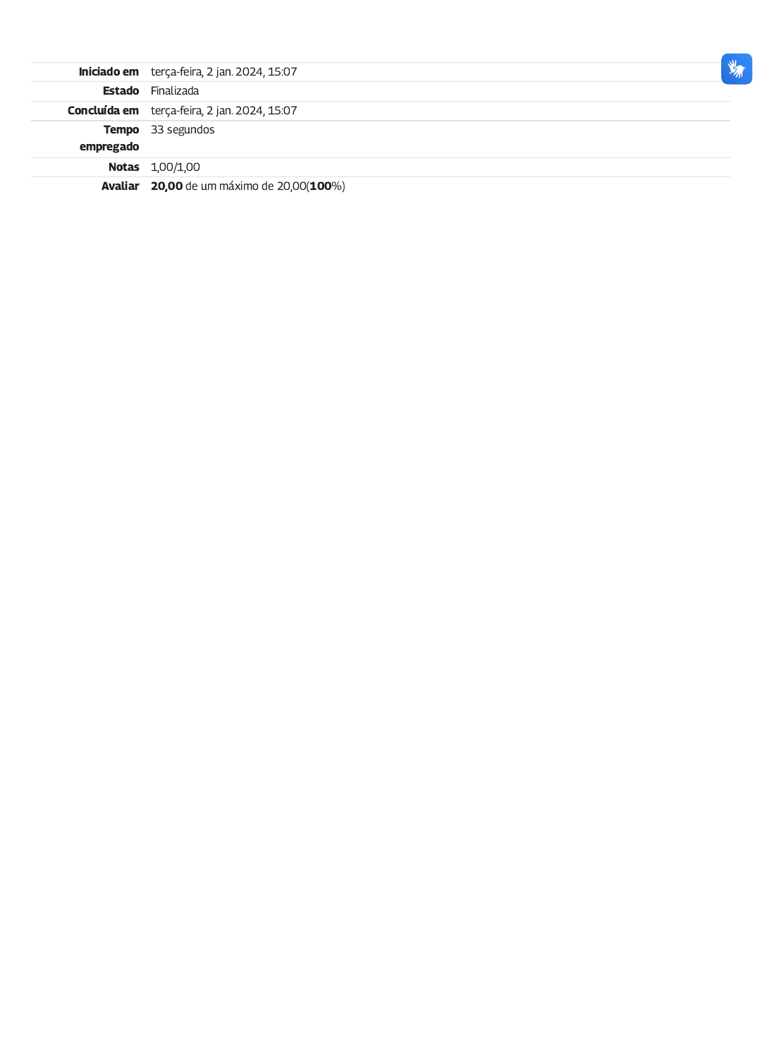 02/01/2024, 15:10 Exercício avaliativo - Módulo 4: Revisão da tentativa https://mooc41.escolavirtual.gov.br/mod/quiz/review.php?attempt=1107651&cmid=19570 1/2 Iniciado em terça-feira, 2 jan. 2024, 15:07 Estado Finalizada Concluída em terça-feira, 2 jan. 2024, 15:07 Tempo empregado 33 segundos Notas 1,00/1,00 Avaliar 20,00 de um máximo de 20,00(100%) 02/01/2024, 15:10 Exercício avaliativo - Módulo 4: Revisão da tentativa https://mooc41.escolavirtual.gov.br/mod/quiz/review.php?attempt=1107651&cmid=19570 2/2 Questão 1 Correto Atingiu 1,00 de 1,00 O design de serviços utiliza várias técnicas e uma abordagem integrada e colaborativa para desenhar ou redesenhar serviços públicos, projetando o modo como ele será entregue ao cidadão. Ajuda a desenhar as conexões e interdependências entre os componentes do serviço, como os processos, as tecnologias e os recursos, empregando em geral os princípios da abordagem do design centrado no humano. Quais são os principais objetivos ao se utilizar design de serviços em serviços públicos? Escolha uma opção: a. Ouvir os usuários em pesquisas de campo a �m de desenhar um serviço público que esteja de acordo com as suas necessidades e com os seus desejos. b. Garantir que o usuário tenha a melhor experiência de usabilidade em relação ao serviço público. c. Gerar experiências signi�cativas, propostas úteis e desejáveis para os cidadãos, melhorando a qualidade de serviços, bem como, que sejam viáveis, e�cientes e e�cazes para as organizações públicas. d. Entender as necessidades dos usuários e desenhar serviços para as pessoas e não necessariamente com as pessoas. e. Identi�car e compreender, analisar e problematizar, conceitualizar e formalizar, testar e iterar, e implementar e avaliar. Sua resposta está correta. A alternativa correta é a letra “c”. Gerar experiências signi�cativas, propostas úteis e desejáveis para os cidadãos, melhorando a qualidade de serviços, bem como, que sejam viáveis, e�cientes e e�cazes para as organizações públicas. O Design de serviços é a prática de desenhar ou redesenhar serviços, de modo colaborativo com usuários e atores envolvidos, projetando o modo como ele será entregue ao cidadão visando à qualidade, e�ciência e e�cácia em todo o processo. Envolve as fases de identi�car e compreender, analisar e problematizar, conceitualizar e formalizar, testar e iterar, e implementar e avaliar, utilizando diferentes técnicas e ferramentas do design. O objetivo de seu emprego no setor público não é apenas ouvir e atender às necessidades dos usuários, visto que há restrições, requisitos técnicos, objetivos organizacionais e diretrizes de políticas públicas que devem ser consideradas. O uso da metodologia de Design de serviços tem como foco gerar valor público tanto para o provedor do serviço, como para o cidadão, buscando-se como objetivos criar experiências signi�cativas por meio de propostas úteis e desejáveis para os cidadãos, melhorando a qualidade, bem como, que sejam e�cientes e e�cazes para as organizações. A resposta correta é: Gerar experiências signi�cativas, propostas úteis e desejáveis para os cidadãos, melhorando a qualidade de serviços, bem como, que sejam viáveis, e�cientes e e�cazes para as organizações públicas.