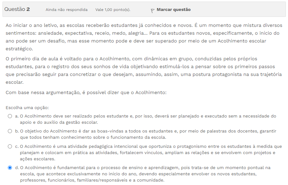 a. Acolhimento deve ser realizado pelos estudante e, por isso, deverá ser planejado e executado sem a necessidade do apoio e do auxílio da gestão escolar. b. objetivo do Acolhimento é dar as boas-vindas a todos os estudantes e, por meio de palestras dos docentes, garantir que todos tenham conhecimento sobre funcionamento da escola. c. Acolhimento é uma atividade pedagógica intencional que oportuniza o protagonismo entre os estudantes à medida que planejam e colocam em prática as fortalecem vínculos, ampliam as relações e se envolvem com projetos e ações. d. Acolhimento é fundamental para processo de ensino e aprendizagem, pois trata-se de um momento pontual na escola, que acontece exclusivamente no início do ano, devendo especialmente envolver os novos estudantes, professores, funcionários, familiares/responsáveis e a comunidade escolar.