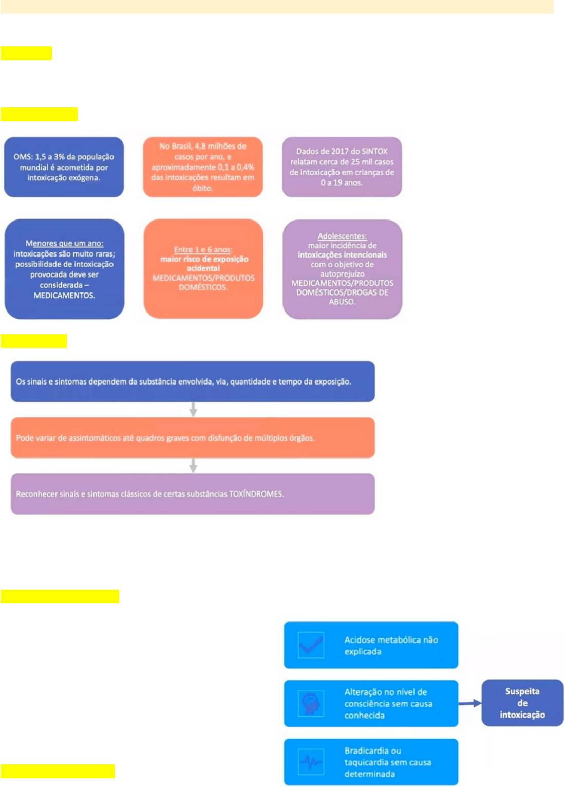 MANEJO DE INTOXICAÇÃO E ENVENENAMENTO NA INFÂNCIA EMERGÊNCIA DEFINIÇÃO AS INTOXICAÇÕES EXÓGENAS AGUDAS SÃO DEFINIDAS COMO AS CONSEQUÊNCIAS CLÍNICAS E/OU BIOQUÍMICAS DE EXPOSIÇÃO AGUDA A SUBSTÂNCIAS ENCONTRADAS NO AMBIENTE. EPIDEMIOLOGIA DIAGNÓSTICO TODA INTOXICAÇÃO AGUDA: É NOTIFICAÇÃO COMPULSÓRIA. TODA A TENTATIVA DE AUTOEXTERMÍNIO DEVE-SE SER NOTIFICADO EM ATÉ 24H NOTIFICAÇÃO COMPULSÓRIA IMEDIATA AVALIAÇÃO SISTEMÁTICA · AVALIAÇÃO CLÍNICA INICIAL · ESTABILIZAÇÃO · RECONHECIMENTO DA TOXÍNDROME · IDENTIFICAÇÃO DO AGENTE CAUSAL · DESCONTAMINAÇÃO · ADMINISTRAÇÃO DE ANTÍDOTOS · AUMENTO DA ELIMINAÇÃO DO TÓXICO ABSORVIDO · TRATAMENTO SINTOMÁTICO ABCDE – ESTABILIZAÇÃO AVALIAÇÃO PRIMÁRIA SE CONVUÇÃO POR INTOXICAÇÃO: BENZODIAZEPÍNICO (DIAZEPAM) NÃO MELHOROU: FENOBARBITAL NÃO MELHOROU FENITOINA AVALIAÇÃO SECUNDÁRIA: DESCONTAMINAÇÃO TOXÍNDROME COMPLEXO DE SINAIS E SINTOMAS PRODUZIDOS POR DOSES TÓXICAS DE SUBSTÂNCIAS QUÍMICAS. O RECONHECIMENTO DA SÍNDROME PERMITE A IDENTIFICAÇÃO MAIS RÁPIDA DO GENTE CAUSAL E, CONSEQUENTEMENTE, A REALIZAÇÃO DO TRATAMENTO ADEQUADO. EXAME FÍSICO DETALHADO: SINAIS VITAIS, CARACTERÍSTICAS DA PELE, MUCOSA, HÁLITO, BOCA, OLHOS, CONJUNTIVA, ESTADO NEUROMUSCULAR, PADRÃO RESPIRATÓRIO. PARACETAMOL CONCLUSÃO PUNÇÃO LIQUÓRICA · SÓ PROTEÍNA ALTA: DOENÇA DESMIELINIZANTE · SE PROTEÍNA ALTA E GLICOSE BAIXA: INFECÇÃO BACTERIANA MANEJO DA DESIDRATAÇÃO DESIDRATAÇÃO NA CRIANÇA - TBL OMS MS RESUMO SIMULAÇÕES ACIDENTE OFÍDICO COBRA – APLICA ANTES O FERNEGAM (ANTIALÉRGICO): 25 A 50MG IM Fosseta loreal (narinas – consegue perceber sangue circulando a distância) – presente só em cobras peçonhentas Tipos de ação dos venenos: Ação hemorrágica Ação hemorrágica TRATAMENTO GERAL · Manter elevado e estendido o segmento picado; · Emprego de analgésicos para alívio da dor; · Hidratação: manter o paciente hidratado, com diurese entre 30 a 40 ml/hora no adulto, e 1 a 2 ml/kg/hora na criança; · Antibioticoterapia apenas em evidencias de infecção. · As bactérias mais frequentes: Morganella morganii, Escherichia coli, Providentia sp e Streptococo do grupo D, geralmente sensíveis ao cloranfenicol. · Dependendo da evolução clínica, poderá ser indicada a associação de clindamicina com aminoglicosídeo. DIAGNÓSTICO -> CLÍNICO · Não existe exame laboratorial para determinar o tipo de envenenamento ofídico, sendo o diagnóstico eminentemente clinico-epidemiológico. · Nos acidentes botrópicos, laquéticos e crotálicos, exames de coagulação devem ser realizados para a confirmação diagnóstica e avaliação da eficácia da soroterapia. · O tempo de coagulação (TC), simples e de fácil execução, pode ser feito nos locais que não dispõem de laboratório. Acidente brotrópico – Jararaca (90% dos casos do Brasil) · Mecanismo de ação: Proteolítica(inflamatória) / Coagulante / Hemorrágica Lesões locais: Edema, Bolhas e Necrose COMPLICAÇÕES LOCAIS · Síndrome Compartimental: Decorre da compressão do feixe vásculo-nervoso consequente ao grande edema que se desenvolve no membro atingido, produzindo isquemia de extremidades. As manifestações mais importantes são a dor intensa, parestesia, diminuição da temperatura do segmento distal, cianose e déficit motor. · Abscesso: sua ocorrência tem variado de 10 a 20%. A ação “proteolítica” do veneno botrópico favorece o aparecimento de infecções locais. · Necrose: é devida à ação “proteolítica” do veneno, associada à isquemia local decorrente de lesão vascular e de outros fatores como infecção, trombose arterial, síndrome de compartimento ou uso indevido de torniquetes. O risco é maior nas picadas em extremidades (dedos) Abre para reduzir a pressão sobre os vasos decorrente ao edema local e enfaixa para reduzir a contaminação TRATAMENTO ESPECÍFICO A aplicação dos soros deve ser por via intravenosa, podendo ser diluídos ou não, em solução fisiológica ou glicosada. SAB- soro anti-botrópico: (OBS: De moderado a grave serve também para laquético) · 1)Leve: quadro discreto com sangramento em pele ou mucosas e distúrbio de coagulação = 2 a 4 ampolas. · 2) Moderada: edema e equimose evidente com distúrbio de coagulação = 5 a 8 ampolas. · 3) Grave: alterações locais intensa, hemorragia grave, hipotensão e anúria = 12 ampolas. A) Acidente Crotálico – cascavel · Mecanismo de ação: Coagulante / Miotóxico / proteolítico · Quadro clínico: Fácies miastênica (ptose palpebral uni ou bilateral); Flacidez da musculatura da fece; alteração do diâmetro pupilar; incapacidade de movimentação do globo ocular (oftalmoplegia); visão turva e/ou diplopia ; Menos frequente: Paralisia velopalatina com dificuldade de deglutir; diminuição dos reflexos de vômito, alterações do paladar e olfato COMPLICAÇÕES LOCAIS · Locais: raros pacientes evoluem com parestesias locais duradouras, porém reversíveis após algumas semanas. · Sistêmicas: a principal complicação do acidente crotálico, em nosso meio, é a insuficiência renal aguda (IRA), com necrose tubular geralmente de instalação nas primeiras 48 horas. TRATAMENTO ESPECÍFICO O SORO ANTICROTÁLICO (SAC) DEVE SER ADMINISTRADO INTRAVENOSAMENTE. Acidente leve: alterações neuroparalíticas discretas, sem mialgias, sem manifestações vagais = 5 ampolas; Acidentes moderados: alterações neuroparalíticas evidentes, mialgias e mioglobinúria discreta = 10 ampolas; Acidente grave: alterações neuroparalíticas evidentes, mialgias e mioglobinúria intensa, oligúria = 20 ampolas. B) Acidente Laquético (surucucu) · Mecanismo de Ação: Proteolítica / Coagulante / Hemorrágica / Neurotóxica Manifestações Locais · São semelhantes às descritas no acidente botrópico. · Dor e edema, que podem progredir para todo o membro. · Vesículas e bolhas de conteúdo seroso ou sero-hemorrágico nas p
