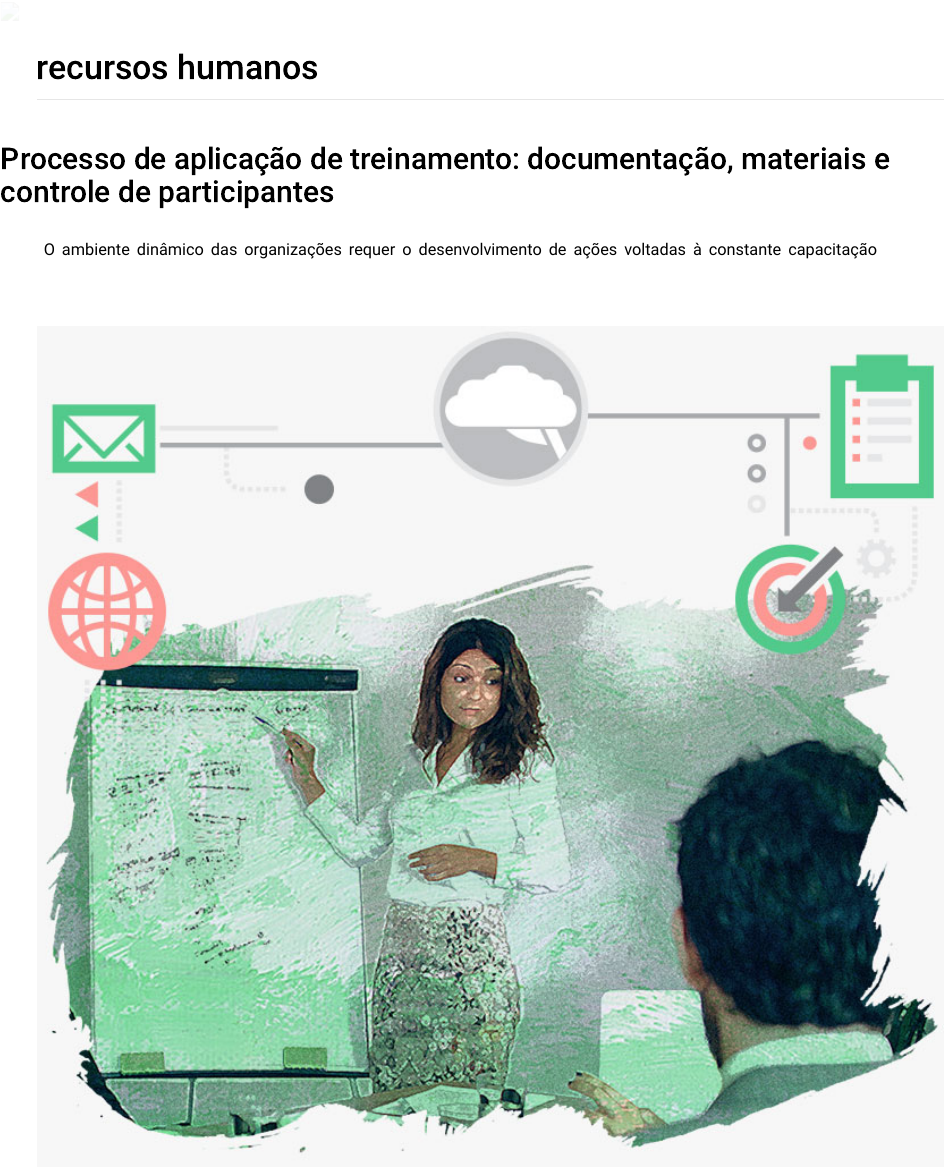 recursos humanos Processo de aplicação de treinamento: documentação, materiais e controle de participantes O ambiente dinâmico das organizações requer o desenvolvimento de ações voltadas à constante capacitação das pessoas paratorná-las mais eficientes e eficazes naquilo que fazem. Diante deste dinamismo, um dos objetivos das empresas é oferecer para os colaboradores treinamentos constantes, voltados à aprendizagem e proporcionando mudanças no comportamento das pessoas por meio da incorporação de novos conhecimentos, habilidades e atitudes, tornando-as, assim, mais produtivas e inovadoras. Desta forma, compreender sobre o processo de aplicação do treinamento, levando em contaa documentação envolvida, os materiais e o controle dos participantes, exige um olhar abrangente, que envolve toda a organização, dos profissionais de recursos humanos. Processo de aplicação das ações de treinamento Você já sabe que o treinamento envolve um processo composto por quatro etapas, tais como: Figura 1 –Etapas que compõem o treinamento. O papel do facilitador é o de preparar as condições necessárias para que o treinamento alcance o objetivo esperado, seguindo cada etapa de modo que as experiências vivenciadas durante as atividades possam realmente oferecer oportunidades no desenvolvimento dos colaboradores. Neste sentido, o treinamento deve ter objetivos bem definidos focados na transmissão de informações, construção dos conhecimentos, para o desenvolvimento de novas habilidades e atitudes. O treinamento não pode ser realizado apenas para solucionar problemas imediatos, ele deve proporcionar oportunidades para o contínuo desenvolvimento pessoal, não apenas em seus cargos atuais, mas também para outras atribuições para as quais o colaborador possa assumir, aumentando assim sua motivação em um clima de interação entre todos. E como deve ser esse treinamento? Veja a figura abaixo, pois ela mostra na prática como deve funcionar as ações de treinamento. Figura 2 – Ações/conteúdo de treinamento Materiais envolvidos no processo de treinamento Para atingir os objetivos do treinamento existem diversos materiais que podem ser utilizados. Estes materiais são fundamentais em todo o processo pois facilita a comunicação, tornando o treinamento mais eficiente e eficaz. Estes materiais servem de direcionadores no processo didático e, quando bem utilizados, auxiliam na concentração dos colaboradores e da compreensão do assunto proposto. Que materiais são esses? Veremos alguns deles a seguir. Quadro magnético O quadro magnético é confeccionado com um laminado de superfície lisa e de cor branca. Estes quadros também podem ser de material ferroso com o objetivo de fixar imãs em sua superfície. Figura 3 – Quadro magnético Fonte: <http://www.archiexpo.fr/prod/planning-sisplamo/product-52643-1145057.html>. Caneta especial para o quadro Para escrever no quadro branco existe um tipo especial de caneta hidrográfica, em que a tinta é de fácil remoção. As canetas são encontradas em diversas cores, com pontas grossas e finas, possibilitando uma escrita mais legível. Figura 4 – Canetas para quadro magnético Fonte: <https://lousas.com.br/produtos>. Flip chart O flip chart é um bloco de papel em tamanho grande preso a um cavalete ou tripémuito utilizado nos treinamentos para expor as apresentações. Quando uma folha está cheia, o instrutor apenas passa para a próxima. Este recurso permite que, após o treinamento,se crie um mural dos dados apresentados. Figura 5 – Flip chart (bloco de papel) Fonte: <http://www.red17.co.uk/conference-pro-flip-chart-easel.html>. Projetor multimídia O projetor multimídia é também é chamado de datashow. É um equipamento que projeta as imagens utilizando uma tecnologia baseada em uma lâmpada geralmente de mercúrio. É necessária uma entrada de vídeo (computador e/ou televisão) para realizar as devidas apresentações. Figura 6 – Projetor multimídia (datashow) Fonte: <http://www.conceptimportados.com.br/epson projetorpowerlitex12.html>. Computador Os computadores são utilizados praticamente em todos os treinamentos corporativos, principalmente nos treinamentos de modalidade a distância (EAD). É uma tecnologia que auxilia em todo o processo. Figura 7 – Computador Fonte: <http://www.o-que-e-computador.html>. Televisão É um recurso audiovisual muito utilizado nos treinamentos e na educação corporativa, utilizado para apresentar aos treinandos imagens, vídeos, slides etc. Figura 8 – Televisão Fonte: <http://www.rentalbr.com.br/produto/televisao>. Apostilas A apostila auxilia na aprendizagem e serve de material de apoio para futuras consultas. Figura 9 – Apostilas impressas e encadernadas Fonte: <http://copyserv.com.br/site/apostilas-encadernacao-espiral/>. Caneta e lápis Caneta e lápis são fundamentais em qualquer treinamento. São materiais de apoio que os colaboradores utilizam para as devidas anotações. Figura 10 – Caneta e lápis Fonte: <http://www.meuingles/caneta-ou-lapis/>. Controle dos participantes O controle dos participantes que realizaram o treinamento também faz parte do processo. Tudo começa no levantamento das necessidades de treinamento, em que se observa quem deve participar do treinamento. (objetos/info1-480.png) Estas informações contribuem para o alcance dos objetivos esperados e auxiliam na análise dos indicadores da área de recursos humanos, na elaboração da lista de presença, na elaboração dos certificados dos participantes e no controle dos custos. Estes dados são digitados e parametrizados em planilhas eletrônicas ou sistemas de gestão e servem de documentos para a gestão de todo o processo. Em breve, veremos na prática uma planilha de controle dos participantes. https://senac.blackboard.com/bbcswebdav/pid-10479896-dt-content-rid-275189127_1/institution/Senac%20RS/_cursos_tecnicos/TRH/UC08/conteudo/8_processo/objetos/info1-480.png Documentos en