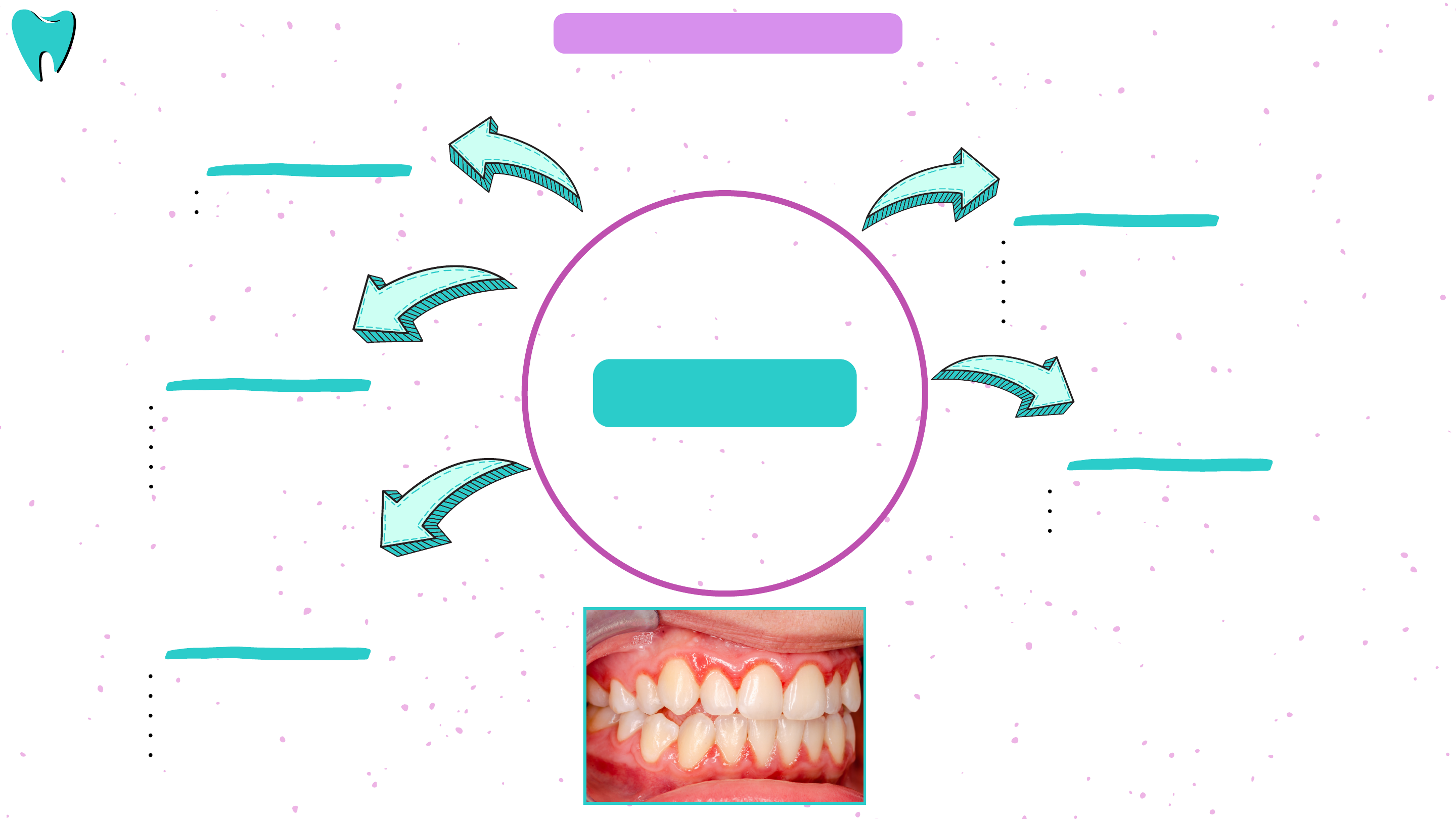 DEFINIÇÃO Inflamação da gengiva. Estágio inicial da doença periodontal. CAUSAS Acúmulo de placa bacteriana. Má higiene bucal. Fatores genéticos. Tabagismo. Diabetes. TRATAMENTO Raspagem. Antibióticos, se necessário. Instruções sobre higiene bucal PREVENÇÃO Escovação regular. Uso de fio dental. Visitas regulares ao dentista. Dieta saudável. Evitar tabagismo. ASPECTOS CLÍNICOS Gengivas vermelhas e inchadas. Sangramento durante a escovação. Mau hálito. Possível retração gengival. Sensibilidade gengival. GENGIVITE DOENÇA PERIODONTAL