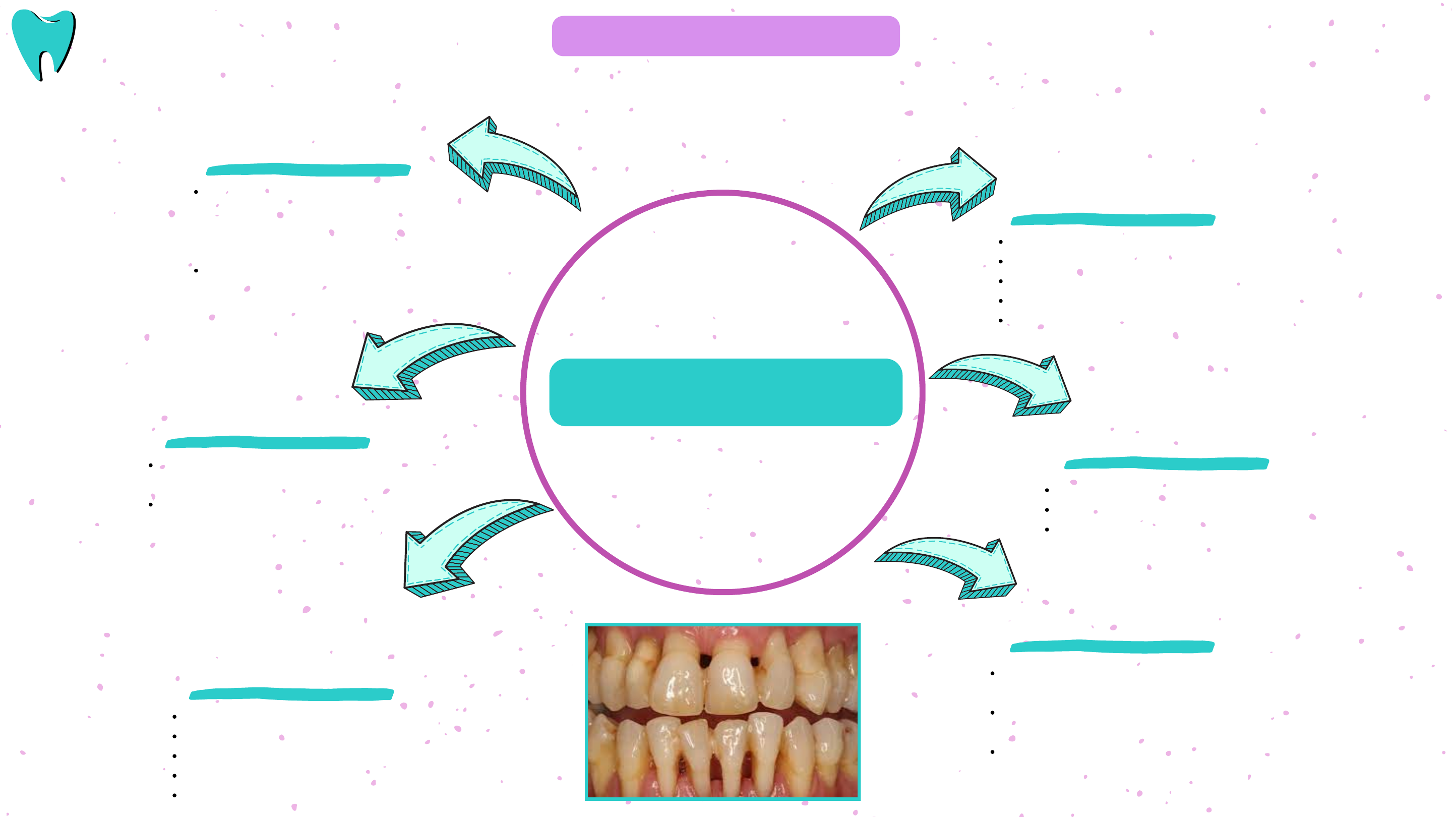 DEFINIÇÃO Inflamação avançada dos tecidos de suporte dos dentes, incluindo gengivas, osso alveolar e ligamentos periodontais. Surge como uma progressão não tratada da gengivite, envolvendo destruição do osso alveolar. CAUSAS Originada do acúmulo de placa bacteriana abaixo da linha da gengiva. Contribuições de fatores genéticos, comprometimento do sistema imunológico, tabagismo e diabetes. TRATAMENTO Raspagem. Cirurgia periodontal. As vezes, antibióticos. PREVENÇÃO Escovação regular. Uso de fio dental. Visitas regulares ao dentista. Dieta saudável. Evitar tabagismo. ASPECTOS CLÍNICOS Perda óssea, Formação de bolsas periodontais Possível presença de pus. Mudança na posição dos dentes Potencial perda dentária. SINTOMAS Gengivas vermelhas, inchadas e sensíveis. Sangramento durante escovação e uso do fio dental. Mau hálito persistente, retração gengival e mobilidade dentária. PERIODONTITE DOENÇA PERIODONTAL