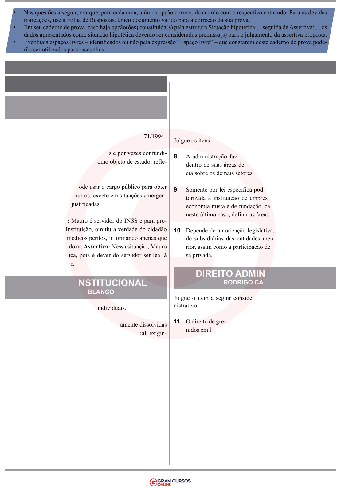 SIMULADO INSS – TÉCNICO DO SEGURO SOCIAL SIMULADO INSS – TÉCNICO DO SEGURO SOCIAL • Nas questões a seguir, marque, para cada uma, a única opção correta, de acordo com o respectivo comando. Para as devidas marcações, use a Folha de Respostas, único documento válido para a correção da sua prova. • Em seu caderno de prova, caso haja opção(ões) constituída(s) pela estrutura Situação hipotética:... seguida de Assertiva:..., os dados apresentados como situação hipotética deverão ser considerados premissa(s) para o julgamento da assertiva proposta. • Eventuais espaços livres – identificados ou não pela expressão “Espaço livre” – que constarem deste caderno de prova pode- rão ser utilizados para rascunhos. � Baseado no formato de prova � aplicado pela banca Cebraspe CONHECIMENTOS BÁSICOS ÉTICA KÁTIA LIMA Julgue os itens a seguir sobre ética geral, ética no serviço público, ética e função pública, tendo como base o Decreto n. 1.171/1994. 1 Ética e moral são termos relacionados e por vezes confundi- dos, porém a ética tem a moral como objeto de estudo, refle- xão e julgamento crítico. 2 O servidor público não pode usar o cargo público para obter favores para si ou para outros, exceto em situações emergen- ciais e concretamente justificadas. 3 Situação hipotética: Mauro é servidor do INSS e para pro- teger a imagem da Instituição, omitiu a verdade do cidadão sobre a ausência de médicos peritos, informando apenas que o sistema estava fora do ar. Assertiva: Nessa situação, Mauro não cometeu falta ética, pois é dever do servidor ser leal à Instituição a que servir. DIREITO CONSTITUCIONAL RICARDO BLANCO Julgue o item em relação aos direitos individuais. 4 As associações só poderão ser compulsoriamente dissolvidas ou ter suas atividades suspensas por decisão judicial, exigin- do-se, no segundo caso, o trânsito em julgado. Julgue o item em relação aos remédios constitucionais. 5 O mandado de segurança coletivo pode ser impetrado por partido político com representação no Congresso Nacional, organização sindical, entidade de classe ou associação legal- mente constituída e em todos os casos eles devem comprovar pelo menos 1 ano de exercícios. Julgue o item em relação à nacionalidade. 6 Será declarada a perda da nacionalidade do brasileiro que tiver cancelada sua naturalização, por sentença judicial, em virtude do cometimento de crime culposo. Julgue o item em relação aos direitos políticos. 7 A soberania popular será exercida pelo sufrágio universal e pelo voto direto e secreto, com valor igual para todos, e, nos termos da lei complementar, mediante: plebiscito; referendo; iniciativa popular. Julgue os itens em relação à Administração Pública. 8 A administração fazendária e seus servidores fiscais terão, dentro de suas áreas de competência e jurisdição, precedên- cia sobre os demais setores administrativos, na forma da lei. 9 Somente por lei específica poderá ser criada autarquia e au- torizada a instituição de empresa pública, de sociedade de economia mista e de fundação, cabendo à lei complementar, neste último caso, definir as áreas de sua atuação. 10 Depende de autorização legislativa, em cada caso, a criação de subsidiárias das entidades mencionadas no inciso ante- rior, assim como a participação de qualquer delas em empre- sa privada. DIREITO ADMINISTRATIVO RODRIGO CARDOSO Julgue o item a seguir considerando aspectos do Direito Admi- nistrativo. 11 O direito de greve será exercido nos termos e nos limites defi- nidos em lei ordinária específica. A exigência da edição de lei compreende o conteúdo do princípio da reserva legal. Sobre a teoria dos atos administrativos, julgue os seguintes itens. 12 O ato discricionário permite valoração subjetiva do agente, dentro dos limites impostos pela lei. Por esse motivo, é apli- cável a teoria dos motivos determinantes nos atos vinculados e discricionários. 13 A autorização, por ser ato vinculado e definitivo, deverá ser expedida caso o administrado venha a cumprir todos os re- quisitos exigidos por lei. Mas nada impede que esse ato seja cassado posteriormente caso o beneficiado venha a descum- prir disposição legal. SIMULADO INSS – TÉCNICO DO SEGURO SOCIAL Sobre o direito administrativo, julgue os itens. 14 O poder disciplinar sempre deriva do poder hierárquico mes- mo se a penalidade for aplicada ao particular que estiver sob tutela da Administração. 15 O decreto de execução é considerado ato primário e o decreto autônomo, ato secundário. Ainda, é possível afirmar que a Constituição permite a delegação da competência para editar decreto autônomo para Ministro de Estado. 16 Os princípios que norteiam a Administração Pública são re- gras básicas que servem de interpretação das demais normas jurídicas. Em relação aos princípios que norteiam a Admi- nistração Pública, é correto afirmar que o princípio da im- pessoalidade, que é desvinculado do princípio da legalidade, condiciona a atividade administrativa ao interesse público. Sobre a organização administrativa, julgue o item a seguir. 17 Considere que o estado “Y” pretenda criar uma entidade administrativa com objetivo de fiscalizar o patrimônio am- biental, bem como expedir ato normativo para regulamentar o assunto. A estrutura a ser criada terá personalidade jurí- dica própria e será dirigida por um colegiado com mandato fixo. Assertiva: pode-se afirmar que foi criada uma agência executiva. GRAMÁTICA E TEXTO LUCAS LEMOS O Marajá 1 A família toda ria de dona Morgadinha e dizia que ela estava sempre esperando a visita de alguém ilustre. Dona Morgadinha não podia ver uma coisa fora do lugar, uma ponta de poeira em seus móveis ou uma mancha em seus 5 vidros e cristais. Gemia baixinho quando alguém esquecia um sapato no corredor, uma toalha no quarto ou – ai, ai, ai – uma almofada for