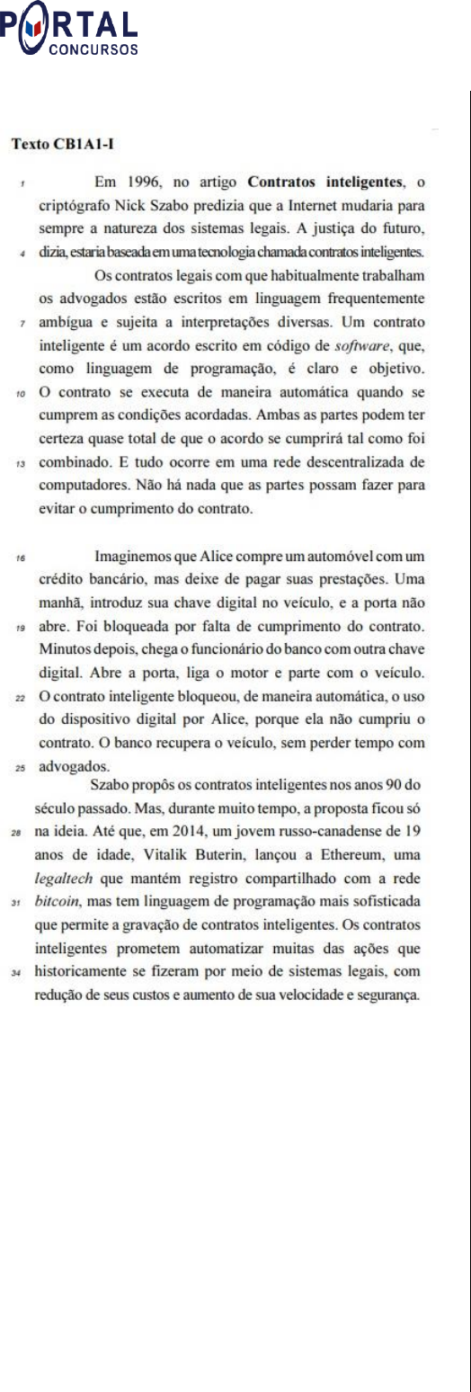 PORTUGUÊS PROF. ANDERSON OLIVEIRA www.cursosdoportal.com.br TEXTO 01 Questão 01 Desde 1996, o criptógrafo Nick Szabo defende a ideia de que sistemas legais, sem alteração de sua essência, podem ser aperfeiçoados com recursos da tecnologia da informação. ( ) CERTO ( ) ERRADO Questão 02 As soluções de aperfeiçoamento de contratos legais baseadas em tecnologia da informação tornam mais dispendioso o acompanhamento do cumprimento das cláusulas contratuais. ( ) CERTO ( ) ERRADO Questão 03 Infere-se das informações do terceiro parágrafo do texto que o segmento “Foi bloqueada” (ℓ.19) refere-se a “chave digital” (ℓ.18). ( ) CERTO ( ) ERRADO Questão 04 A expressão “Ainda que” (ℓ.36) poderia ser substituída por Embora, sem alteração dos sentidos e da correção gramatical do texto. ( ) CERTO ( ) ERRADO Questão 05 Os contratos inteligentes diferem dos contratos legais clássicos, entre outras razões, por não utilizarem linguagem imprecisa. ( ) CERTO ( ) ERRADO Questão 06 A tecnologia abre possibilidades para que os contratos sejam cumpridos em função da ação rápida de advogados. ( ) CERTO ( ) ERRADO Questão 07 O texto indica dois desafios para a implantação dos contratos inteligentes: a falta de desenvolvimento de pesquisas na área da economia compartilhada e o ambiente regulatório do setor. ( ) CERTO ( ) ERRADO PORTUGUÊS PROF. ANDERSON OLIVEIRA www.cursosdoportal.com.br Questão 08 Infere-se do texto que Nick Szabo somente concretizou sua proposta de contratos inteligentes em 2014. ( ) CERTO ( ) ERRADO Questão 09 Conforme o último parágrafo do texto, ainda não há certeza de que carros, casas e outros ativos da economia compartilhada realmente vão interagir com a rede universal de compartilhamento desenvolvida pela Slock.it. ( ) CERTO ( ) ERRADO