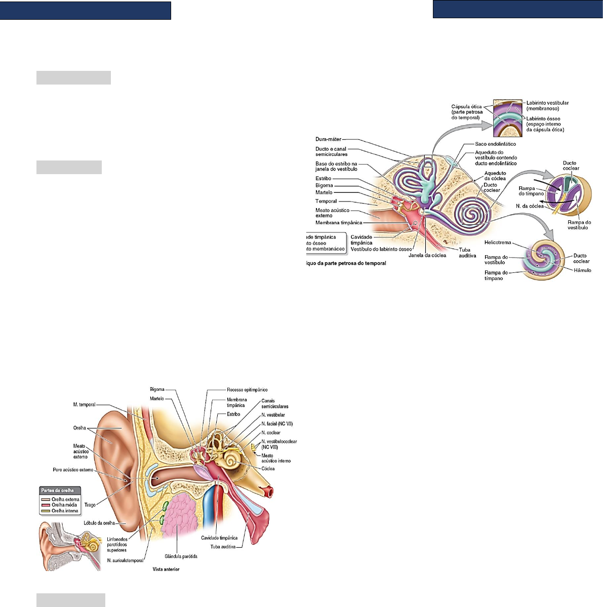 Camila Anacleto Sistema Auditivo Anatomia Orelha externa: constituída pelo pavilhão auditivo, meato acústico externo(canal auditivo) e membrana timpânica A membrana timpânica separa a orelha externa da orelha média e se preende ao cabo do martelo Orelha media: é uma cavidade na porção petrosa do osso temporal e nela se localizam 3 ossículos ( martelo, bigorna e estribo) ligados por articulações sinoviais e 2 músculos (tensor do tímpano e estapédio). Tensor do Tímpano inervado pelo ramo mandibular do nervo trigêmeo se liga ao martelo.Estapédio inervado pelo nervo facial se liga ao estribo Além disso, contínua a cavidade timpânica existe a tuba auditiva que comunica orelha média e nasofaringe servindo para equalizar com a pressão atmosférica durante deglutição e bocejo. Local, também, que serve de rota para patógenos da garganta para ouvido ocasionando otite. Orelha Interna: constituída de um labirinto ósseo e um labirinto membranoso. É separada da orelha média pela janela vestibular conectada ao estribo e a janela coclear recoberta pela membrana timpânica secundaria. Labirinto Ósseo: consiste em uma série de cavidades divididas em vestíbulo, canais semicirculares e cóclea. São revestidas por um periósteo e preenchidas por perilinfa (mesma composição do liquor) Labirinto Membranoso: composto por sáculo, utrículo, ductos semicirculares e ducto coclear e preenchidos por endolinfa (rico em K+) Vestíbulo câmara que se abre pela janela do vestíbulo e contém saculo, utrículo e o aparelho vestibular (estruturas do sistema do equilíbrio). Anteriormente é contínuo com a cóclea e posteriormente com os canais semicirculares. Canais Semicirculares: tubos ósseos que fazem um ângulo reto entre si e alojam os ductos semicirculares. Cóclea cavidade espiralada realiza duas voltas ao redor de seu centro ósseo, o modíolo. Formada pela rampa vestibular e rampa timpânica continuas ao labirinto ósseo e preenchidas por perilinfa e a rampa ou ducto coclear continua ao labirinto membranoso e contendo endolinfa. Ducto coclear se separa da rampa vestibular pela membrana vestibular e separada da rampa timpânica pela lâmina basilar. Entretando, se comunicam em uma abertura no ápice da cóclea, helicotrema No ducto coclear repousando sobre a lâmina basilar se ancora o órgão de corti. Camila Anacleto Órgão de Corti consiste no receptor auditivo formado por células ciliadas com estereocilios e células de sustentação. As ciliadas se dividem em externas e internas. Ciliadas internas: são os receptores que convertem vibrações mecânicas em sinais sensitivos e fazem sinapses com neurônios sensitivos do nervo coclear, cujos corpos se localizam no gânglio espiral. Ciliadas externas: não servem como receptores tedno função apenas como modificadores da sensibilidade nas ciliadas internas recebendo aferência dos neurônios motores do nervo coclear (retroalimentação). Fisiologia da Audição Pavilhão auditivo recebe ondas sonoras que trafegam pelo meato acústico externo ate a membrana timpânica A membrana vibra para a frente e pra trás, lentamente em resposta a baixa frequência e rapidamente a alta frequência, transmitindo para ossículos. Os ossiculos ampliam as vibrações cerca de 20 vezes, da membrana timpânica para a janela oval. O estribo move a janela vestibular para frente e para trás criando ondas no perilinfa que se transmitem até a rampa timpânica projetando a janela da cóclea para fora. A movimentação da membrana vestibular cria ondas no endolinfa e fazem a lamina basilar vibrar movendo as células ciliadas que se flexionam contra membrana tectorial e gerando impulsos para o primeiros neurônios. Transdução Sonora Os canais de K são unidos aos estereocilios mais altos por proteínas de ligação de ponta. Essa ligação traciona a abertura dos canais mantendo-os levemente abertos quando em repouso, assim uma pequena quantidadede k do endolinfa influi por eles causando uma despolarização fraca. Já quando a lâmina basilar é flexionada e os cílios menores se curvam sobre os maiores, a proteína é tracionada e os canais se abrem completamente permitindo uma maior despolarização com a entrada de mais K. A alteração da voltagem abre canais de Ca voltagem dependente e Ca entra na célula. A entrada de Ca leva a exocitose de vesículas de neurotransmissor, provavelmente o glutamato. Mas quando os estereocilios maiores se curvam sobre os menores, ou seja, para o lado oposto, as proteínas se tornam frouxas e cobrem os canais levando a uma hiperpolarização. Camila Anacleto Frequência sonora As diferentes frequências fazem vibrar diferentes regiões da lâmina basilar. Na base da cóclea, próxima a janela do vestibular a lâmina é mais estreita e rígida, por isso ela detecta sons de alta frequência, já o ápice da lamina é mais largo e flexível e detecta sons de baixa frequência. A altura do som depende da intensidade das ondas sonoras, quanto maiores as vibrações na lâmina mais alto é o som. Teste do Ouvidinho: Possível devido a capacidade das células ciliadas externas de produzir sons, em resposta a aferencia de neurônios motores elas se dobram e estendem alterando rigidez na membrana tectorial para aumentar sensibilidade das células ciliadas internas enquanto fazem isso emitem sons denominados emissões otoacusticas geralmente inaldivel, mas quando colocado um microfone ele detecta os sons. Em recém-nascidos surdos, esses sons não são emitidos. Via Auditiva O primeiro neurônio se origina do órgão de corti e transmite através da parte coclear do nervo vestibulococlear as informações para os núcleos cocleares no bulbo, saindo dele parte das fibras cruzam nas medulas e ascendem pelo trato lateral ate o coliculo inferior contralateral, enquanto parte chegam ate o núcleo olivar superior de ambos os lados e depois seguem pra o coliculo inferior. Dele iniciasse o segundo neurônio que transmite a