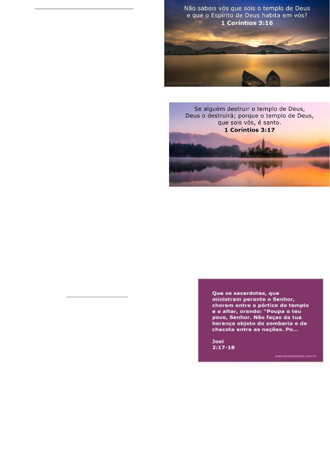 1 Coríntios 3:16-17(ACF) ¹⁶ Não sabeis vós que sois o templo de Deus e que o Espírito de Deus habita em vós? A expressão não é “sois templos”, mas sim “sois o templo” coletivamente e “pedras vivas (1Pe 2:5) individualmente ou seja há uma divisão para igreja universal e o crente, ser humano. ¹⁷ Se alguém destruir o templo de Deus, Deus o destruirá; porque o templo de Deus, que sois vós, é santo. Não sabeis que sois o templo>. Sabem e devem sempre se lembrar vocês são a classe mais nobre no edifício, um “templo de Deus”. Todos os cristãos juntos formam um vasto templo. Veja bem a expressão é “sois ou somos o templo” estando juntos e “pedras vivas” individualmente. Duas palavras gregas se referindo a templo. Uma (hieron) que é o edifício feito de pedra, cimento etc, e a outra (nãos) que é o Santo dos santos e também a cada cristão no qual Deus habita (1Cr6:19). Paulo enfatiza que o Senhor leva muito à sério as nossas ações na igreja e como Igreja (nosso corpo). Nenhum “templo” literal é reconhecido pelo Novo Testamento na igreja cristã. O único que é aceito é o templo espiritual, todos os adoradores crentes em Jesus nos quais habita o Espírito Santo. Destruir> Quem tenta dividir a Igreja (nós), com fofocas, maldades e outros atos prejudiciais está pedindo a disciplina de Deus. Os destruidores aqui citados, atacaram com falsos ensinos e, portanto, serão destruídos. Joel 2:17-18(ACF) 17 Chorem os sacerdotes, ministros do Senhor, entre o alpendre e o altar, e digam: Poupa a teu povo, ó Senhor, e não entregues a tua herança ao opróbrio, O povo reunido em oração juntamente com seus líderes, arrependidos suplicando uma renovação verdadeira, Deus poderia evitar os terríveis acontecimentos futuros. para que os gentios o dominem; por que diriam entre os povos: Onde está o seu Deus? A pergunta é uma retórica com a intenção de induzir Deus a ajudar o povo, pois se não viesse em socorro de Judá, os outros povos zombariam Dele. 18 Então o Senhor se mostrou zeloso da sua terra, e compadeceu-se do seu povo. O imenso amor de Deus pela terra de Israel caminha de mãos dadas com Seu amor eterno (compadecerá) pelo Seu povo. A cada situação de dificuldades de Israel, Deus julgou a terra, houve esperança de que, um dia, Seu zelo pela terra levaria a uma renovação da benção.