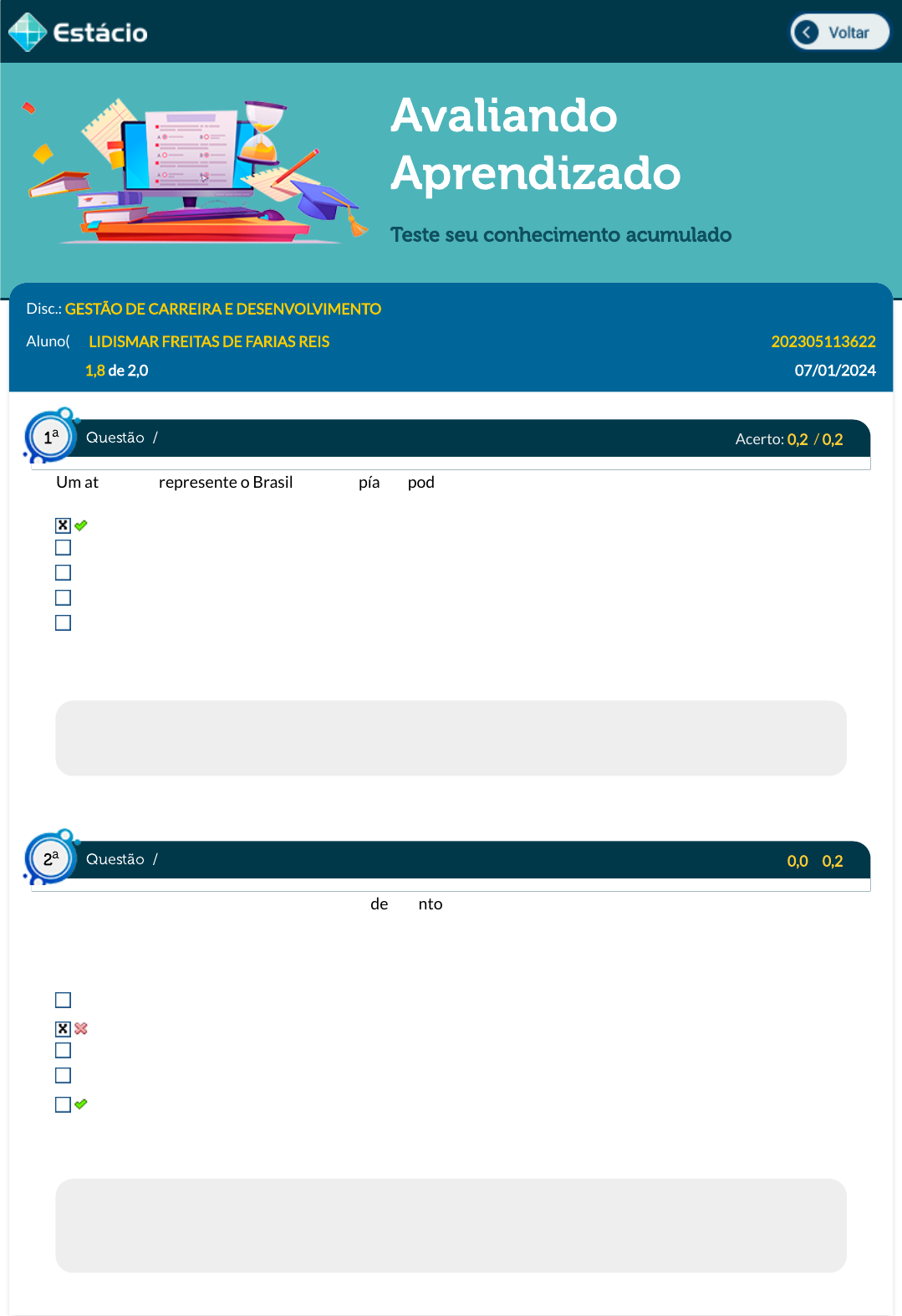 07/01/2024, 15:32 Estácio: Alunos https://simulado.estacio.br/alunos/ 1/5 Avaliando Aprendizado Teste seu conhecimento acumulado Disc.: GESTÃO DE CARREIRA E DESENVOLVIMENTO Aluno(a): LIDISMAR FREITAS DE FARIAS REIS 202305113622 Acertos: 1,8 de 2,0 07/01/2024 Acerto: 0,2 / 0,2 Um atleta que represente o Brasil nas Olimpíadas pode ser considerado como: Agente credenciado Agente político Agente honorí�co Servidor público Agente temporário Respondido em 07/01/2024 15:19:19 Explicação: A resposta correta é: Agente credenciado Acerto: 0,0 / 0,2 A Gamma Inc. enfrenta desa�os na retenção de talentos da Geração Z. Eles buscam criar um ambiente de trabalho que seja mais atraente para esta geração, valorizando suas expectativas e necessidades. Qual estratégia a Gamma Inc. deve adotar para reter talentos da Geração Z? Priorizar altos salários em detrimento do equilíbrio entre vida pessoal e pro�ssional. Enfatizar a estabilidade no emprego a longo prazo. Manter estruturas hierárquicas rígidas para clareza organizacional. Limitar o uso de tecnologia para aumentar a interação pessoal. Oferecer oportunidades constantes de aprendizado e desenvolvimento. Respondido em 07/01/2024 15:22:08 Explicação: A Geração Z valoriza o aprendizado contínuo e o desenvolvimento pessoal e pro�ssional. Portanto, para a Gamma Inc. reter esses talentos, é essencial oferecer oportunidades constantes nesse sentido. Questão / 1 a Questão / 2 a https://simulado.estacio.br/alunos/inicio.asp https://simulado.estacio.br/alunos/inicio.asp javascript:voltar(); javascript:voltar(); 07/01/2024, 15:32 Estácio: Alunos https://simulado.estacio.br/alunos/ 2/5 Acerto: 0,2 / 0,2 Um novo servidor público inicia sua jornada em uma agência governamental. Diferente do setor privado, onde a seleção pode ser mais subjetiva, seu ingresso ocorreu por meio de um processo objetivo e regulamentado. Como é caracterizado o processo de seleção para ingresso no setor público brasileiro? Avaliação de desempenho anterior. Processo seletivo baseado em concurso público. Avaliação baseada em experiência pro�ssional. Recomendações de empregadores anteriores. Entrevistas pessoais com gestores. Respondido em 07/01/2024 15:23:16 Explicação: O ingresso no setor público brasileiro é geralmente realizado por meio de concursos públicos, que são processos seletivos objetivos e regulamentados. Diferente do setor privado, onde fatores como entrevistas pessoais, recomendações e experiência pro�ssional anterior podem ter um peso maior, no setor público, o concurso público prevalece como o principal meio de seleção. Acerto: 0,2 / 0,2 A carreira proteana tem como objetivo o sucesso psicológico, que é o sucesso interno ao indivíduo. Assinale a alternativa que caracteriza essa espécie de carreira. Apresenta a possibilidade de que a competição por vagas de emprego seja constante e leva a pessoa a concorrer todo o tempo por uma remuneração elevada. Tem como critério de sucesso a remuneração. Pode ser redirecionada por conta de necessidades pessoais e por circunstâncias ambientais, e a pessoa busca por autorrealização. É moldada mais pela organização do que pela pessoa e direcionada pelos gerentes das empresas. Tem a empresa como um elemento essencial às escolhas de carreira Respondido em 07/01/2024 15:24:46 Explicação: A resposta correta é: Pode ser redirecionada por conta de necessidades pessoais e por circunstâncias ambientais, e a pessoa busca por autorrealização. Acerto: 0,2 / 0,2 Uma das funções que um servidor em cargo em comissão pode ocupar é a de direção. Indique o principal objetivo dessa função administrativa: Avaliar o desempenho. Colocar em prática o que foi planejado. Fornecer feedback. Organizar recursos. Dimensionar a força de trabalho. Respondido em 07/01/2024 15:25:23 Questão / 3 a Questão / 4 a Questão / 5 a 07/01/2024, 15:32 Estácio: Alunos https://simulado.estacio.br/alunos/ 3/5 Explicação: A respsota correta é: Colocar em prática o que foi planejado. Acerto: 0,2 / 0,2 Na estrutura de carreira em W, é possível promover a multifuncionalidade. Além disso, podemos dizer que esse tipo de estrutura aumenta a barreira entre especialização e gestão. proporciona a formação de pro�ssionais mais completos. limita o desenvolvimento de gerentes em suas capacidades técnicas. impede os pro�ssionais de exercerem funções diferentes umas das outras. prioriza o crescimento para cargos técnicos. Respondido em 07/01/2024 15:25:57 Explicação: A resposta correta é: proporciona a formação de pro�ssionais mais completos. Acerto: 0,2 / 0,2 Um servidor pode ser nomeado para ocupar um cargo comissionado a �m de exercer a função de assessoria. Aponte a atividade que não está vinculada à de assessoria. Presidir uma autarquia Consultoria jurídica Relações públicas Apoio administrativo Consultoria técnica Respondido em 07/01/2024 15:26:31 Explicação: A resposta correta é: Presidir uma autarquia Acerto: 0,2 / 0,2 A Delta Services está avaliando o desempenho de seus colaboradores. O objetivo é identi�car aqueles com alto potencial para assumir futuras posições de liderança e desenvolvê-los adequadamente. Qual é o foco principal da avaliação de desempenho da Delta Services? Reconhecer colaboradores com maior tempo de serviço. Premiar os colaboradores mais populares entre a equipe. Questão / 6 a Questão / 7 a Questão / 8 a 07/01/2024, 15:32 Estácio: Alunos https://simulado.estacio.br/alunos/ 4/5 Identi�car colaboradores com habilidades técnicas excepcionais. Identi�car e desenvolver talentos para futuras lideranças. Avaliar a conformidade dos colaboradores com as normas da empresa. Respondido em 07/01/2024 15:29:07 Explicação: O foco da Delta Services na avaliação de desempenho é identi�car colaboradores com alto potencial e prepará-los para assumir posições de liderança no futuro. Acerto: 0,2 / 0,2 Carlos, u