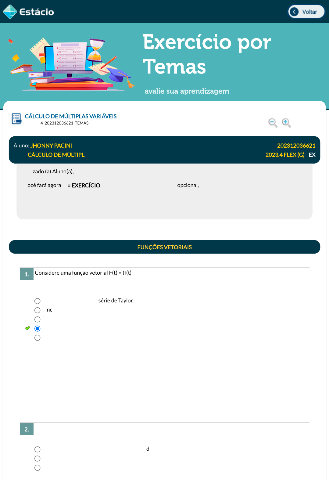 03/01/2024, 12:17 Estácio: Alunos https://simulado.estacio.br/alunos/ 1/4 Exercício por Temas avalie sua aprendizagem Considere uma função vetorial F(t) = (f(t), g(t), h(t)), em que f(t), g(t) e h(t) são funções componentes dependendo do parâmetro t. Para determinar o limite dessa função vetorial quando t se aproxima de um determinado valor, pode- se utilizar o seguinte método: Uma pessoa está caminhando em um parque, seguindo uma trilha sinuosa que segue as direções indicadas por setas. Esse exemplo ilustra um conceito fundamental em vetores, que é: CÁLCULO DE MÚLTIPLAS VARIÁVEIS Lupa DGT0234_202312036621_TEMAS Aluno: JHONNY PACINI Matr.: 202312036621 Disc.: CÁLCULO DE MÚLTIPL 2023.4 FLEX (G) / EX Prezado (a) Aluno(a), Você fará agora seu EXERCÍCIO! Lembre-se que este exercício é opcional, mas não valerá ponto para sua avaliação. O mesmo será composto de questões de múltipla escolha. Após responde cada questão, você terá acesso ao gabarito comentado e/ou à explicação da mesma. Aproveite para se familiarizar com este modelo de questões que será usado na sua AV e AVS. FUNÇÕES VETORIAIS 1. Utilizar a expansão em série de Taylor. Encontrar a derivada da função vetorial. Aplicar o teorema fundamental do cálculo. Obter o limite de cada uma das funções componentes. Utilizar a regra de L'Hôpital. Data Resp.: 03/01/2024 12:16:16 Explicação: O limite de uma função vetorial pode ser obtido calculando o limite de cada uma de suas funções componentes. Portanto, para determinar o limite da função vetorial F(t) = (f(t), g(t), h(t)) quando t se aproxima de um determinado valor, é necessário calcular individualmente o limite de f(t), g(t) e h(t). 2. O vetor como uma quantidade aleatória de deslocamento. O vetor como uma quantidade puramente numérica. O vetor como uma grandeza escalar. javascript:voltar(); javascript:voltar(); javascript:voltar(); javascript:voltar(); javascript:diminui(); javascript:diminui(); javascript:aumenta(); javascript:aumenta(); 03/01/2024, 12:17 Estácio: Alunos https://simulado.estacio.br/alunos/ 2/4 Na física, ao estudar o movimento de uma partícula em um campo vetorial, é comum utilizar um vetor especial chamado versor. Esse versor é de�nido como: Considere uma função vetorial F(t) = (f(t), g(t), h(t)), em que f(t), g(t) e h(t) são funções componentes dependendo do parâmetro t. Para determinar se essa função é diferenciável em um intervalo, é necessário veri�car: Qual é o valor de para que a função seja contínua em t = 0? O vetor como uma medida de distância percorrida. O vetor como uma quantidade vetorial com direção e sentido. Data Resp.: 03/01/2024 12:16:21 Explicação: O vetor é de�nido não apenas por seu valor (módulo), mas também por sua direção e seu sentido. Ele representa uma quantidade que possui uma orientação especí�ca no espaço. 3. Um vetor com magnitude igual ao produto das coordenadas componentes. Um vetor com magnitude igual a 2. Um vetor com magnitude igual a 1. Um vetor com magnitude igual a zero. Um vetor com magnitude variável dependendo do campo vetorial. Data Resp.: 03/01/2024 12:16:26 Explicação: O versor é um vetor unitário, ou seja, um vetor com módulo igual a 1. O versor é utilizado para indicar apenas a direção e o sentido de um vetor, sem levar em consideração sua magnitude. As outras alternativas não correspondem à de�nição de versor como vetor unitário. 4. A existência do limite da função F(t) em todo o intervalo. A derivabilidade das funções componentes f(t), g(t) e h(t) em todo o intervalo. A existência da derivada parcial de F(t) em relação a t em todo o intervalo. A continuidade da função F(t) em todo o intervalo. A existência do limite da derivada de F(t) em todo o intervalo. Data Resp.: 03/01/2024 12:16:32 Explicação: Para uma função vetorial F(t) ser diferenciável em um intervalo, é necessário que suas funções componentes f(t), g(t) e h(t) sejam deriváveis em todos os pontos desse intervalo. Portanto, para determinar se F(t) é diferenciável em um intervalo, é necessário veri�car a derivabilidade das funções componentes em todo o intervalo. As outras alternativas não abordam corretamente o critério de diferenciabilidade de uma função vetorial. 5. →G (0) →G (t) = ⟨ , , ⟩e t t+1 √t+1 −1 t 2 sen t t ⟨1, , 2⟩1 2 ⟨0, , 2⟩1 2 ⟨1, 0, 0 ⟩ 03/01/2024, 12:17 Estácio: Alunos https://simulado.estacio.br/alunos/ 3/4 A área de�nida pela equação , para o intervalo 0 < < , com > 0, vale . Qual é o valor de ? Sabendo que m(u) = , assinale a alternativa que apresenta a derivada da função no ponto u = 4: Qual é a equação polar da curva de�nida pela função , com u>0 ? Data Resp.: 03/01/2024 12:16:40 Explicação: A resposta certa é 6. Data Resp.: 15/12/2023 06:36:40 Explicação: A resposta correta é 7. Data Resp.: 03/01/2024 12:17:03 Explicação: A resposta correta é 8. ⟨2, − , 1 ⟩1 2 ⟨1, 2, 1 ⟩ ⟨1, , 2⟩1 2 ρ = cos 3θ θ κ κ π 16 κ π 16 π 4 π 8 π 32 π 2 π 4 →F (u) = ⟨u3 + 2u, 6, √u ⟩ √u →G (u) = 32 →F (m(u)) ⟨200, 0, 1 ⟩ ⟨1600, 0, 8 ⟩ ⟨100, 6, 8 ⟩ ⟨200, 6, 1 ⟩ ⟨500, 0, 2 ⟩ ⟨200, 0, 1 ⟩ →G (u) = ⟨2u, 2u⟩ ρ = cosθ ρ = θ ρ = 2 θ = π 4 03/01/2024, 12:17 Estácio: Alunos https://simulado.estacio.br/alunos/ 4/4 Um objeto percorre uma curva de�nida pela função . Assinale a alternativa que apresenta o valor da componente normal da aceleração no ponto (x,y,z) = (2,4,6): Data Resp.: 03/01/2024 12:17:08 Explicação: A resposta correta é 9. Data Resp.: 15/12/2023 06:39:04 Explicação: A resposta correta é Não Respondida Não Gravada Gravada Exercício por Temas inciado em 15/12/2023 06:35:53. ρ = 1 + senθ θ = π 4 →F (u) = ⎧ ⎨⎩ x = 1 + u2 y = u3 + 3, u ≥ 0 z = u2 + 5 3√34 34 6√34 17 √34 17 5√17 17 3√17 17 6√34 17