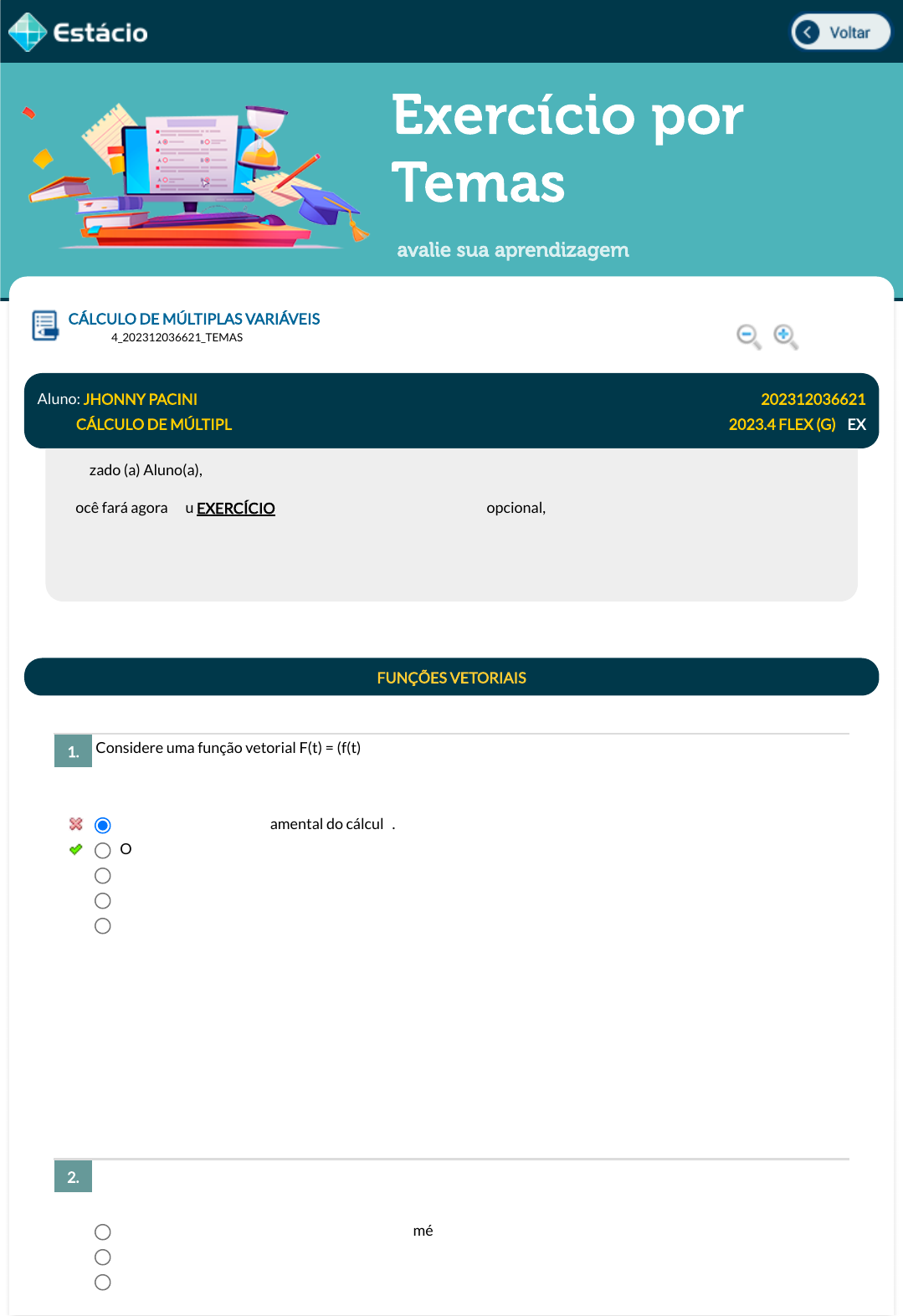 03/01/2024, 12:48 Estácio: Alunos https://simulado.estacio.br/alunos/ 1/4 Exercício por Temas avalie sua aprendizagem Considere uma função vetorial F(t) = (f(t), g(t), h(t)), em que f(t), g(t) e h(t) são funções componentes dependendo do parâmetro t. Para determinar o limite dessa função vetorial quando t se aproxima de um determinado valor, pode- se utilizar o seguinte método: Uma pessoa está caminhando em um parque, seguindo uma trilha sinuosa que segue as direções indicadas por setas. Esse exemplo ilustra um conceito fundamental em vetores, que é: CÁLCULO DE MÚLTIPLAS VARIÁVEIS Lupa DGT0234_202312036621_TEMAS Aluno: JHONNY PACINI Matr.: 202312036621 Disc.: CÁLCULO DE MÚLTIPL 2023.4 FLEX (G) / EX Prezado (a) Aluno(a), Você fará agora seu EXERCÍCIO! Lembre-se que este exercício é opcional, mas não valerá ponto para sua avaliação. O mesmo será composto de questões de múltipla escolha. Após responde cada questão, você terá acesso ao gabarito comentado e/ou à explicação da mesma. Aproveite para se familiarizar com este modelo de questões que será usado na sua AV e AVS. FUNÇÕES VETORIAIS 1. Aplicar o teorema fundamental do cálculo. Obter o limite de cada uma das funções componentes. Utilizar a expansão em série de Taylor. Utilizar a regra de L'Hôpital. Encontrar a derivada da função vetorial. Data Resp.: 03/01/2024 12:47:46 Explicação: O limite de uma função vetorial pode ser obtido calculando o limite de cada uma de suas funções componentes. Portanto, para determinar o limite da função vetorial F(t) = (f(t), g(t), h(t)) quando t se aproxima de um determinado valor, é necessário calcular individualmente o limite de f(t), g(t) e h(t). 2. O vetor como uma quantidade puramente numérica. O vetor como uma quantidade aleatória de deslocamento. O vetor como uma medida de distância percorrida. javascript:voltar(); javascript:voltar(); javascript:voltar(); javascript:voltar(); javascript:diminui(); javascript:diminui(); javascript:aumenta(); javascript:aumenta(); 03/01/2024, 12:48 Estácio: Alunos https://simulado.estacio.br/alunos/ 2/4 Na física, ao estudar o movimento de uma partícula em um campo vetorial, é comum utilizar um vetor especial chamado versor. Esse versor é de�nido como: Considere uma função vetorial F(t) = (f(t), g(t), h(t)), em que f(t), g(t) e h(t) são funções componentes dependendo do parâmetro t. Para determinar se essa função é diferenciável em um intervalo, é necessário veri�car: Qual é a equação polar da curva de�nida pela função , com u>0 ? O vetor como uma grandeza escalar. O vetor como uma quantidade vetorial com direção e sentido. Data Resp.: 03/01/2024 12:47:55 Explicação: O vetor é de�nido não apenas por seu valor (módulo), mas também por sua direção e seu sentido. Ele representa uma quantidade que possui uma orientação especí�ca no espaço. 3. Um vetor com magnitude igual a 1. Um vetor com magnitude igual a 2. Um vetor com magnitude igual a zero. Um vetor com magnitude variável dependendo do campo vetorial. Um vetor com magnitude igual ao produto das coordenadas componentes. Data Resp.: 03/01/2024 12:48:02 Explicação: O versor é um vetor unitário, ou seja, um vetor com módulo igual a 1. O versor é utilizado para indicar apenas a direção e o sentido de um vetor, sem levar em consideração sua magnitude. As outras alternativas não correspondem à de�nição de versor como vetor unitário. 4. A existência da derivada parcial de F(t) em relação a t em todo o intervalo. A existência do limite da derivada de F(t) em todo o intervalo. A existência do limite da função F(t) em todo o intervalo. A continuidade da função F(t) em todo o intervalo. A derivabilidade das funções componentes f(t), g(t) e h(t) em todo o intervalo. Data Resp.: 03/01/2024 12:48:07 Explicação: Para uma função vetorial F(t) ser diferenciável em um intervalo, é necessário que suas funções componentes f(t), g(t) e h(t) sejam deriváveis em todos os pontos desse intervalo. Portanto, para determinar se F(t) é diferenciável em um intervalo, é necessário veri�car a derivabilidade das funções componentes em todo o intervalo. As outras alternativas não abordam corretamente o critério de diferenciabilidade de uma função vetorial. 5. Data Resp.: 03/01/2024 12:48:13 →G (u) = ⟨2u, 2u⟩ ρ = θ ρ = 1 + senθ θ = π 4 ρ = cosθ ρ = 2 03/01/2024, 12:48 Estácio: Alunos https://simulado.estacio.br/alunos/ 3/4 Sabendo que m(u) = , assinale a alternativa que apresenta a derivada da função no ponto u = 4: A área de�nida pela equação , para o intervalo 0 < < , com > 0, vale . Qual é o valor de ? Qual é o valor de para que a função seja contínua em t = 0? Explicação: A resposta correta é 6. Data Resp.: 03/01/2024 12:48:20 Explicação: A resposta correta é 7. Data Resp.: 03/01/2024 12:48:26 Explicação: A resposta correta é 8. θ = π 4 →F (u) = ⟨u3 + 2u, 6, √u ⟩ √u →G (u) = 32 →F (m(u)) ⟨200, 0, 1 ⟩ ⟨1600, 0, 8 ⟩ ⟨200, 6, 1 ⟩ ⟨100, 6, 8 ⟩ ⟨500, 0, 2 ⟩ ⟨200, 0, 1 ⟩ ρ = cos 3θ θ κ κ π 16 κ π 4 π 16 π 8 π 32 π 2 π 4 →G (0) →G (t) = ⟨ , , ⟩e t t+1 √t+1 −1 t 2 sen t t ⟨0, , 2⟩1 2 ⟨1, 0, 0 ⟩ ⟨1, , 2⟩1 2 ⟨1, 2, 1 ⟩ ⟨2, − , 1 ⟩1 2 03/01/2024, 12:48 Estácio: Alunos https://simulado.estacio.br/alunos/ 4/4 Um objeto percorre uma curva de�nida pela função . Assinale a alternativa que apresenta o valor da componente normal da aceleração no ponto (x,y,z) = (2,4,6): Data Resp.: 03/01/2024 12:48:33 Explicação: A resposta certa é 9. Data Resp.: 03/01/2024 12:48:42 Explicação: A resposta correta é Não Respondida Não Gravada Gravada Exercício por Temas inciado em 03/01/2024 12:47:25. ⟨1, , 2⟩1 2 →F (u) = ⎧ ⎨⎩ x = 1 + u2 y = u3 + 3, u ≥ 0 z = u2 + 5 3√34 34 6√34 17 3√17 17 5√17 17 √34 17 6√34 17
