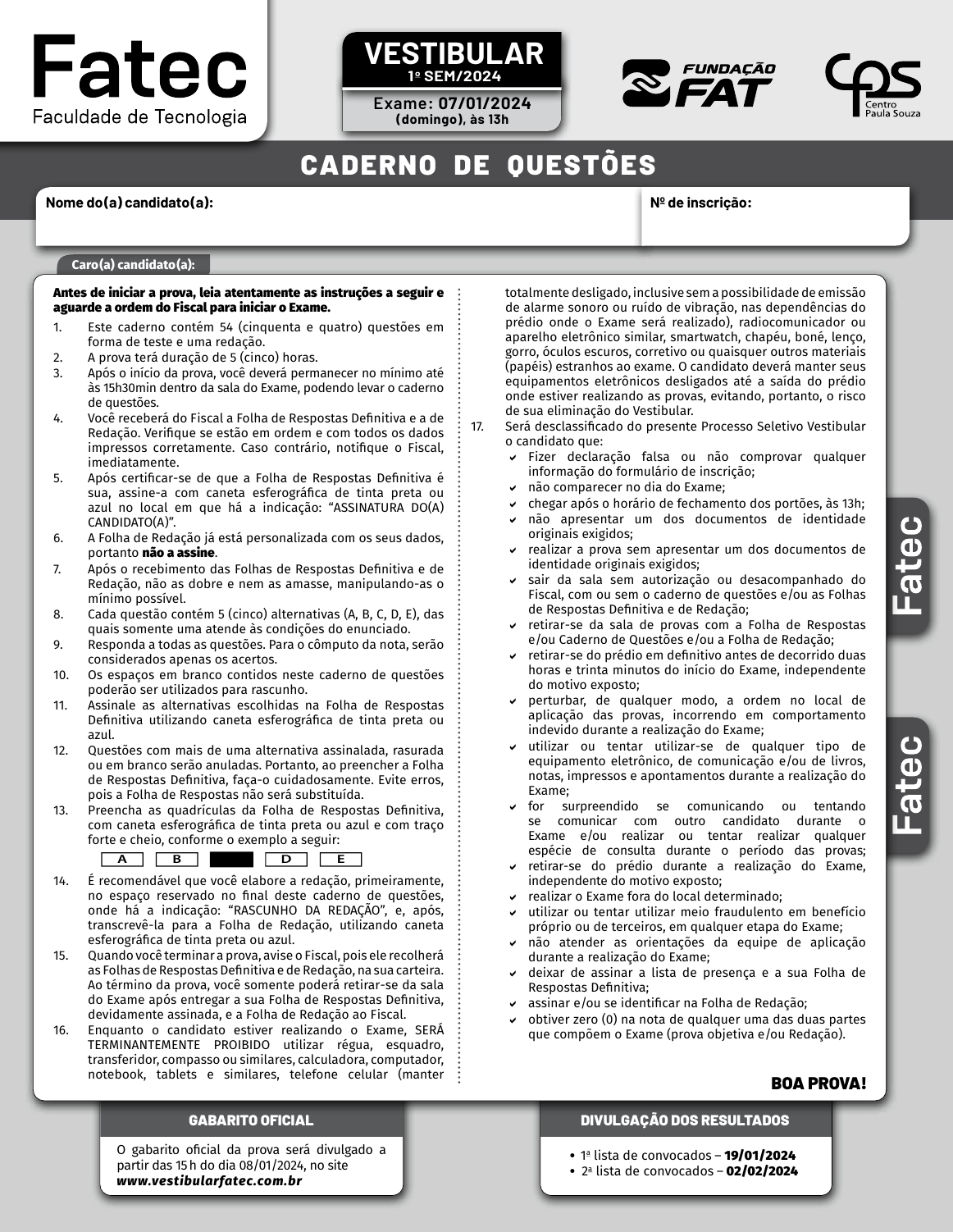 Caro(a) candidato(a): CADERNO DE QUESTÕES O gabarito oficial da prova será divulgado a partir das 15 h do dia 08/01/2024, no site www.vestibularfatec.com.br GABARITO OFICIAL • 1a lista de convocados – 19/01/2024 • 2a lista de convocados – 02/02/2024 DIVULGAÇÃO DOS RESULTADOS BOA PROVA! A B D E Antes de iniciar a prova, leia atentamente as instruções a seguir e Antes de iniciar a prova, leia atentamente as instruções a seguir e aguarde a ordem do Fiscal para iniciar o Exame.aguarde a ordem do Fiscal para iniciar o Exame. 1. Este caderno contém 54 (cinquenta e quatro) questões em 1. Este caderno contém 54 (cinquenta e quatro) questões em forma de teste e uma redação.forma de teste e uma redação. 2. A prova terá duração de 5 (cinco) horas.2. A prova terá duração de 5 (cinco) horas. 3. Após o início da prova, você deverá permanecer no mínimo até 3. Após o início da prova, você deverá permanecer no mínimo até às 15h30min dentro da sala do Exame, podendo levar o caderno às 15h30min dentro da sala do Exame, podendo levar o caderno de questões.de questões. 4. Você receberá do Fiscal a Folha de Respostas Definitiva e a de 4. Você receberá do Fiscal a Folha de Respostas Definitiva e a de Redação. Verifique se estão em ordem e com todos os dados Redação. Verifique se estão em ordem e com todos os dados impressos corretamente. Caso contrário, notifique o Fiscal, impressos corretamente. Caso contrário, notifique o Fiscal, imediatamente.imediatamente. 5. Após certificar-se de que a Folha de Respostas Definitiva é 5. Após certificar-se de que a Folha de Respostas Definitiva é sua, assine-a com caneta esferográfica de tinta preta ou sua, assine-a com caneta esferográfica de tinta preta ou azul no local em que há a indicação: “ASSINATURA DO(A) azul no local em que há a indicação: “ASSINATURA DO(A) CANDIDATO(A)”.CANDIDATO(A)”. 6. A Folha de Redação já está personalizada com os seus dados, 6. A Folha de Redação já está personalizada com os seus dados, portanto portanto não a assinenão a assine.. 7. Após o recebimento das Folhas de Respostas Definitiva e de 7. Após o recebimento das Folhas de Respostas Definitiva e de Redação, não as dobre e nem as amasse, manipulando-as o Redação, não as dobre e nem as amasse, manipulando-as o mínimo possível.mínimo possível. 8. Cada questão contém 5 (cinco) alternativas (A, B, C, D, E), das 8. Cada questão contém 5 (cinco) alternativas (A, B, C, D, E), das quais somente uma atende às condições do enunciado.quais somente uma atende às condições do enunciado. 9. Responda a todas as questões. Para o cômputo da nota, serão 9. Responda a todas as questões. Para o cômputo da nota, serão considerados apenas os acertos.considerados apenas os acertos. 10. Os espaços em branco contidos neste caderno de questões 10. Os espaços em branco contidos neste caderno de questões poderão ser utilizados para rascunho.poderão ser utilizados para rascunho. 11. Assinale as alternativas escolhidas na Folha de Respostas 11. Assinale as alternativas escolhidas na Folha de Respostas Definitiva utilizando caneta esferográfica de tinta preta ou Definitiva utilizando caneta esferográfica de tinta preta ou azul.azul. 12. Questões com mais de uma alternativa assinalada, rasurada 12. Questões com mais de uma alternativa assinalada, rasurada ou em branco serão anuladas. Portanto, ao preencher a Folha ou em branco serão anuladas. Portanto, ao preencher a Folha de Respostas Definitiva, faça-o cuidadosamente. Evite erros, de Respostas Definitiva, faça-o cuidadosamente. Evite erros, pois a Folha de Respostas não será substituída.pois a Folha de Respostas não será substituída. 13. Preencha as quadrículas da Folha de Respostas Definitiva, 13. Preencha as quadrículas da Folha de Respostas Definitiva, com caneta esferográfica de tinta preta ou azul e com traço com caneta esferográfica de tinta preta ou azul e com traço forte e cheio, conforme o exemplo a seguir:forte e cheio, conforme o exemplo a seguir: 14. É recomendável que você elabore a redação, primeiramente, 14. É recomendável que você elabore a redação, primeiramente, no espaço reservado no final deste caderno de questões, no espaço reservado no final deste caderno de questões, onde há a indicação: “RASCUNHO DA REDAÇÃO”, e, após, onde há a indicação: “RASCUNHO DA REDAÇÃO”, e, após, transcrevê-la para a Folha de Redação, utilizando caneta transcrevê-la para a Folha de Redação, utilizando caneta esferográfica de tinta preta ou azul.esferográfica de tinta preta ou azul. 15. Quando você terminar a prova, avise o Fiscal, pois ele recolherá 15. Quando você terminar a prova, avise o Fiscal, pois ele recolherá as Folhas de Respostas Definitiva e de Redação, na sua carteira. as Folhas de Respostas Definitiva e de Redação, na sua carteira. Ao término da prova, você somente poderá retirar-se da sala Ao término da prova, você somente poderá retirar-se da sala do Exame após entregar a sua Folha de Respostas Definitiva, do Exame após entregar a sua Folha de Respostas Definitiva, devidamente assinada, e a Folha de Redação ao Fiscal.devidamente assinada, e a Folha de Redação ao Fiscal. 16. Enquanto o candidato estiver realizando o Exame, SERÁ 16. Enquanto o candidato estiver realizando o Exame, SERÁ TERMINANTEMENTE PROIBIDO utilizar régua, esquadro, TERMINANTEMENTE PROIBIDO utilizar régua, esquadro, transferidor, compasso ou similares, calculadora, computador, transferidor, compasso ou similares, calculadora, computador, notebook, tablets e similares, telefone celular (manter notebook, tablets e similares, telefone celular (manter Nome do(a) candidato(a): Nº de inscrição: totalmente desligado, inclusive sem a possibilidade de emissão totalmente desligado, inclusive sem a possibilidade de emissão de alarme sonoro ou ruído de vibração, nas dependências do de al