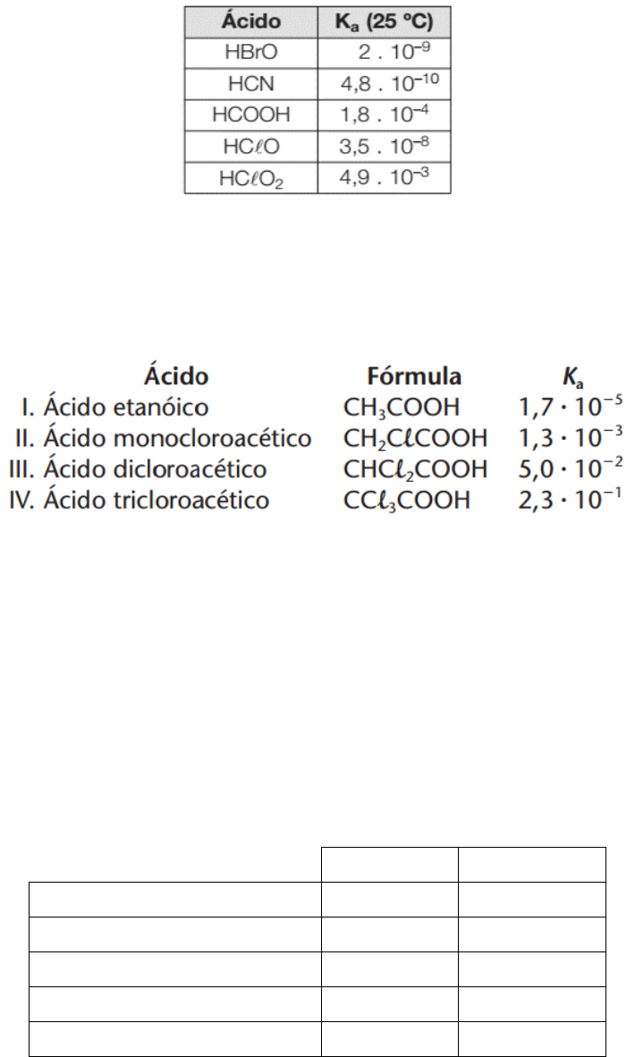 Química – Prof. Rafael – Equilíbrio iônico e pH Exercícios complementares 01. A seguir estão tabeladas as constantes de ionização (Ka) em solução aquosa a 25 ºC. Indique sua ordem crescente de acidez. 02. Considere volumes iguais de soluções 0,1 molL−1 dos ácidos listados a seguir, designados por I, II, III e IV e seus respectivos Ka: Classifique-as em ordem crescente de pH. 03. Determine o pH e o pOH de uma solução que possui [H+] = 10−4 mol.L−1 a 25 ºC. 04. Sabe-se que uma determinada solução aquosa apresenta uma concentração de hidroxila igual a 1,0.10-3 molL−1. Determine o pH dessa solução. 05. As concentrações de [H+] e de [OH−] típicas de algumas soluções encontradas em sua casa são apre- sentadas na tabela a seguir. Classifique-as em ácida, básica ou neutra a 25 ºC. 06. Uma solução 0,001 molar de hidróxido de sódio (NaOH) tem pH igual a: Considere a base toda dissociada ionicamente: NaOH(aq) → Na+(aq) + OH−(aq) Considere a temperatura de 25 ºC, assim pH = −log [H+], pOH = −log [OH−] e pH + pOH = 14; [H+] (mol.L-1) [OH-] (mol.L-1) Leite 10-7 10-7 Água de rejeito de lavanderia 10-12 10-2 Refrigerante 10-3 10-11 Suco de tomate 10-4 10-10 Urina 10-6 10-8 07. As leis de proteção ao meio ambiente proíbem que as indústrias lancem nos rios efluentes com pH menor que 5 ou superior a 8. Os efluentes das indústrias I, II e III apresentam as seguintes concen- trações (em molL−1) de H+ ou OH–: Indústria Concentração no efluente / mol.L-1 I [H+] = 10-3 II [OH-] = 10-5 III [OH-] = 10-8 Considerando apenas a restrição referente ao pH, podem ser lançados em rios, sem tratamento pré- vio, os efluentes? 08. As substâncias genéricas A, B e C, em solução aquosa, apresentam as concentrações mostradas no quadro: Pode-se afirmar que a ordem decrescente de acidez dessas substâncias a 25 °C é: a) B > C > A b) C > A > B c) A > C > B d) C > B > A e) A > B > C 09. Identifique os produtos abaixo com os conceitos: ácido, básico e neutro. Cerveja contendo [H+] = 10-4 M. Um café preparado contendo [H+] = 10-5 M. Leite contendo [H+] = 10-7 M. Leite de magnésia contendo [H+] = 10-8 M. A sequência correta, de cima para baixo, está na alternativa: a) ácido - básico - neutro - neutro b) básico - básico - ácido - neutro c) ácido - ácido - neutro - básico d) básico - neutro - ácido - neutro e) neutro - básico - ácido - neutro 10. Qual o pH de uma solução em que a concentração de íons H+ é igual a 2,0 · 10–4 mol.L-1? (Dado: log 2 = 0,30) 11. Considere a dissolução de 0,10 mol de cada um dos ácidos relacionados na tabela abaixo, separa- damente, em 1,0 litro de água. De acordo com as informações da tabela e com base nos conhecimentos sobre ácidos fracos e pH, compare os três ácidos entre si e considere as seguintes afirmativas: 1. O ácido acético pode ser considerado o ácido mais forte, pois apresenta o menor valor de Ka. 2. O ácido fluorídrico é um ácido inorgânico, que possui o maior valor de Ka; portanto, é o ácido mais forte. 3. A solução de ácido fórmico exibirá o menor valor de pH. 4. A solução de ácido acético apresentará o maior valor de pH. Assinale a alternativa correta. a) Somente a afirmativa 4 é verdadeira. b) Somente as afirmativas 1 e 2 são verdadeiras. c) Somente as afirmativas 3 e 4 são verdadeiras. d) Somente as afirmativas 2 e 4 são verdadeiras. e) Somente as afirmativas 1, 2 e 3 são verdadeiras.