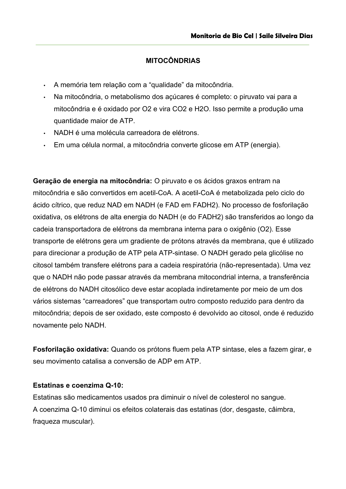 Monitoria de Bio Cel | Saile Silveira Dias MITOCÔNDRIAS • A memória tem relação com a “qualidade” da mitocôndria. • Na mitocôndria, o metabolismo dos açúcares é completo: o piruvato vai para a mitocôndria e é oxidado por O2 e vira CO2 e H2O. Isso permite a produção uma quantidade maior de ATP. • NADH é uma molécula carreadora de elétrons. • Em uma célula normal, a mitocôndria converte glicose em ATP (energia). Geração de energia na mitocôndria: O piruvato e os ácidos graxos entram na mitocôndria e são convertidos em acetil-CoA. A acetil-CoA é metabolizada pelo ciclo do ácido cítrico, que reduz NAD em NADH (e FAD em FADH2). No processo de fosforilação oxidativa, os elétrons de alta energia do NADH (e do FADH2) são transferidos ao longo da cadeia transportadora de elétrons da membrana interna para o oxigênio (O2). Esse transporte de elétrons gera um gradiente de prótons através da membrana, que é utilizado para direcionar a produção de ATP pela ATP-sintase. O NADH gerado pela glicólise no citosol também transfere elétrons para a cadeia respiratória (não-representada). Uma vez que o NADH não pode passar através da membrana mitocondrial interna, a transferência de elétrons do NADH citosólico deve estar acoplada indiretamente por meio de um dos vários sistemas “carreadores” que transportam outro composto reduzido para dentro da mitocôndria; depois de ser oxidado, este composto é devolvido ao citosol, onde é reduzido novamente pelo NADH. Fosforilação oxidativa: Quando os prótons fluem pela ATP sintase, eles a fazem girar, e seu movimento catalisa a conversão de ADP em ATP. Estatinas e coenzima Q-10: Estatinas são medicamentos usados pra diminuir o nível de colesterol no sangue. A coenzima Q-10 diminui os efeitos colaterais das estatinas (dor, desgaste, câimbra, fraqueza muscular). Monitoria de Bio Cel | Saile Silveira Dias Essa coenzima (ubiquinona) existe no organismo mas pode ser obtida na alimentação e por suplementação. Tem efeito antioxidante, fornece energia, reestruturação muscular e prevenção cardiovascular. PAPEL DA MITOCÔNDRIA NO AGRAVAMENTO DE DOENÇAS: a mitocôndria é importante na produção de energia, e quando ocorre alguma mutação que impede essa função dela, o órgão fica com pouca energia e isso se torna um agravante da doença com o passar do tempo. Em indivíduos sedentários, não existe o estímulo à biogênese mitocondrial, elevando os níveis de reativos de oxigênio, responsáveis pela oxidação de estruturas celulares, causando o envelhecimento das células e desenvolvimento de doenças. MITOCÔNDRIAS NO ENVELHECIMENTO E NA INFLAMAÇÃO: baixa taxa de mitogênese mitocondrial reduz a produção de ATP e acelera o envelhecimento da célula, assim como gera reativos de oxigênio. COMO A ALIMENTAÇÃO PODE ALTERAR A ORGANIZAÇÃO QUÍMICA DA CÉLULA: a alimentação saudável estimula a biogênese mitocondrial, responsável por produzir novas células ou melhoras a qualidade das já existentes. *exercícios físicos e boa alimentação estimulam a biogênese mitocondrial *vitamina C não funciona quando tem açúcar no sangue *para aumentar cognição e memória, deve-se estimular a mitogênese mitocondrial *mitocôndrias estão relacionadas com longevidade *cortar o fluxo de açúcar na célula=cortar suprimento de energia da célula tumoral Seite 24 Seite 25