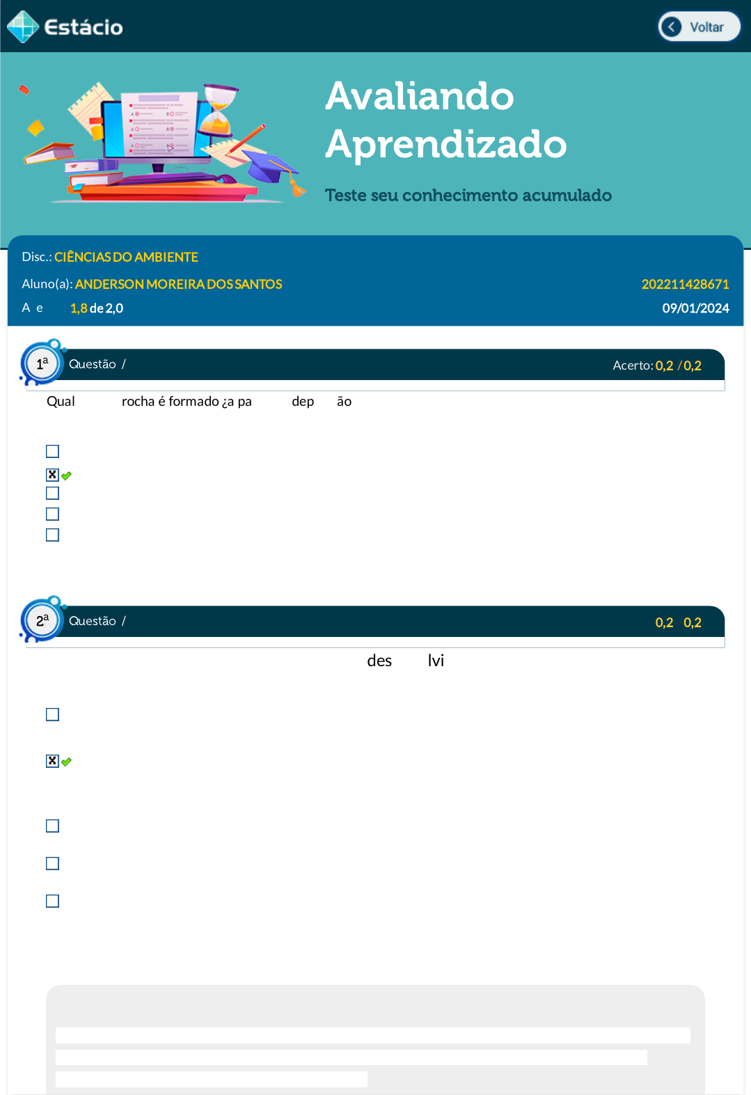 09/01/2024, 21:25 Estácio: Alunos https://simulado.estacio.br/alunos/ 1/5 Avaliando Aprendizado Teste seu conhecimento acumulado Disc.: CIÊNCIAS DO AMBIENTE Aluno(a): ANDERSON MOREIRA DOS SANTOS 202211428671 Acertos: 1,8 de 2,0 09/01/2024 Acerto: 0,2 / 0,2 Qual tipo de rocha é formado ¿a partir da deposição do material fragmentado, proveniente de qualquer tipo de rocha ou material, em diversos ambientes de sedimentação da superfície terrestre¿? Intrusivas Sedimentares Metamór�cas Ígneas Plutônicas Respondido em 09/01/2024 21:23:05 Acerto: 0,2 / 0,2 Um elemento fundamental para nossa vida e desenvolvimento do nosso planeta é a água. Com relação a esse elemento, assinale a alternativa correta. A água tem sido utilizada para a geração de energia elétrica, assegurando a sustentabilidade do meio ambiente. A água do planeta está sendo comprometida pela poluição doméstica, industrial e agrícola, além dos desequilíbrios ambientais resultantes dos desmatamentos e do uso indevido do solo. A diminuição da chuva no Brasil e no mundo tem sido o maior problema ligado à falta de água para abastecer as cidades. O Brasil possui pouca quantidade de água super�cial e subterrânea devido às suas características geológicas que não são tão dominantes. Desvios de água para projetos de irrigação, construção de hidrelétricas, consumo excessivo, desmatamento e poluição têm contribuído para a redução de con�itos entre usuários e empresas. Respondido em 09/01/2024 20:21:12 Explicação: as poluições doméstica (esgotos), industrial (resíduos tóxicos e poluentes em geral) e agrícola (insumos) acarretam para a inutilização de água potável, diminuindo a disponibilidade desse recurso ao homem. Questão / 1 a Questão / 2 a https://simulado.estacio.br/alunos/inicio.asp https://simulado.estacio.br/alunos/inicio.asp javascript:voltar(); javascript:voltar(); 09/01/2024, 21:25 Estácio: Alunos https://simulado.estacio.br/alunos/ 2/5 Apesar das políticas de exploração dos recursos naturais, ainda se reclama de sua falta, sobretudo da água. Tal problema é resultado dos desequilíbrios econômicos e da ausência de políticas que visem a superá-los. A construção de barragens para a geração de energia elétrica contribui mais para um desequilíbrio do meio ambiente local e até regional do que para a sua sustentabilida O Brasil possui abundante quantidade de água super�cial. O problema da falta d¿água no Brasil ¿ e no mundo ¿ não tem relação com a ocorrência das chuvas, e sim com a má utilização e distribuição desse importante recurso natural. Acerto: 0,2 / 0,2 Fazem parte da estrutura da Terra as seguintes camadas: Núcleo inferior, manto, crosta; Núcleo, núcleo inferior, manto e atmosfera; Núcleo, núcleo externo e manto; Núcleo, núcleo externo, manto, litosfera e atmosfera; Núcleo, núcleo externo, manto, crosta e atmosfera; Respondido em 09/01/2024 21:18:41 Explicação: A estrutura interna da Terra é constituída por três camadas: crosta terrestre - camada super�cial sólida que envolve a Terra. Tem, em média, de 30 a 40 km de espessura, mas pode ser bem mais �na ou chegar a até 70km. Possui duas partes: forma de relevo (super�cial) e estruturas geológicas (interna). Manto - camada viscosa logo abaixo da crosta. É formada por vários tipos de rochas siliciosas ricas em ferro e magnésio, que, devido às altas temperaturas, encontram-se em um estado complexo que mistura materiais fundidos e sólidos e recebe o nome de magma. Vai até os 2900 km de profundidade. É também dividido por duas camadas: O Manto Superior e o Manto Inferior. Núcleo - é a parte central do planeta.É formado por metais como ferro e níquel em altíssimas temperaturas. Possui duas partes: Núcleo externo: Líquido ¿ de 2900 a 5150 km. Núcleo interno: Sólido, devido à altíssima pressão ¿ até 6371 km. Acerto: 0,2 / 0,2 A pressão atmosférica atua sinergicamente com as variações da latitude e da ______________________, acabando por atuar também sob as variações da temperatura do ar. Precipitação Vegetação Altitude Nebulosidade Umidade Respondido em 09/01/2024 20:56:51 Questão / 3 a Questão / 4 a 09/01/2024, 21:25 Estácio: Alunos https://simulado.estacio.br/alunos/ 3/5 Explicação: A explicação está relacionada com a incidência dos raios solares. As áreas mais próximas ao Equador recebem com maior intensidade os raios solares, que incidem com grande força durante todo o ano, enquanto as áreas mais próximas aos polos, além de não receberem os raios do sol de forma perpendicular, são iluminadas apenas durante parte do ano, durante os solstícios de verão. Gabarito Comentado Gabarito Comentado Gabarito Comentado Acerto: 0,2 / 0,2 No ecossistema a seguir esquematizado, estão representados, de 1 a 8, os componentes de uma comunidade biótica. Entre eles encontram-se: produtores, consumidores primários, secundários e consumidores terciários. Marque a alternativa que classi�ca corretamente os componentes em consumidores primários. 2 e 7. 4 e 6. 1 e 6. 1 e 5. 2 e 8. Respondido em 09/01/2024 21:14:07 Gabarito Comentado Acerto: 0,2 / 0,2 Zebras pastavam gramíneas quando foram atacadas por um bando de leões. Em que bioma isso ter ocorrido? Savana Tundra Floresta tropical Floresta temperada Deserto Respondido em 09/01/2024 20:46:25 Explicação: Questão / 5 a Questão / 6 a 09/01/2024, 21:25 Estácio: Alunos https://simulado.estacio.br/alunos/ 4/5 A zebra é um mamífero originário do continente africano, que vive no bioma Savana. Acerto: 0,2 / 0,2 É considerada uma poluição, qualquer alteração indesejável nas características físicas, químicas e biológicas da atmosfera, litosfera, hidrosfera que cause ou possa causar prejuízo à saúde, à sobrevivência ou às atividades dos seres humanos e outras espécies ou ainda deteriorar materiais. Sobre as fontes poluidoras difusas ou dispersas, marque a op