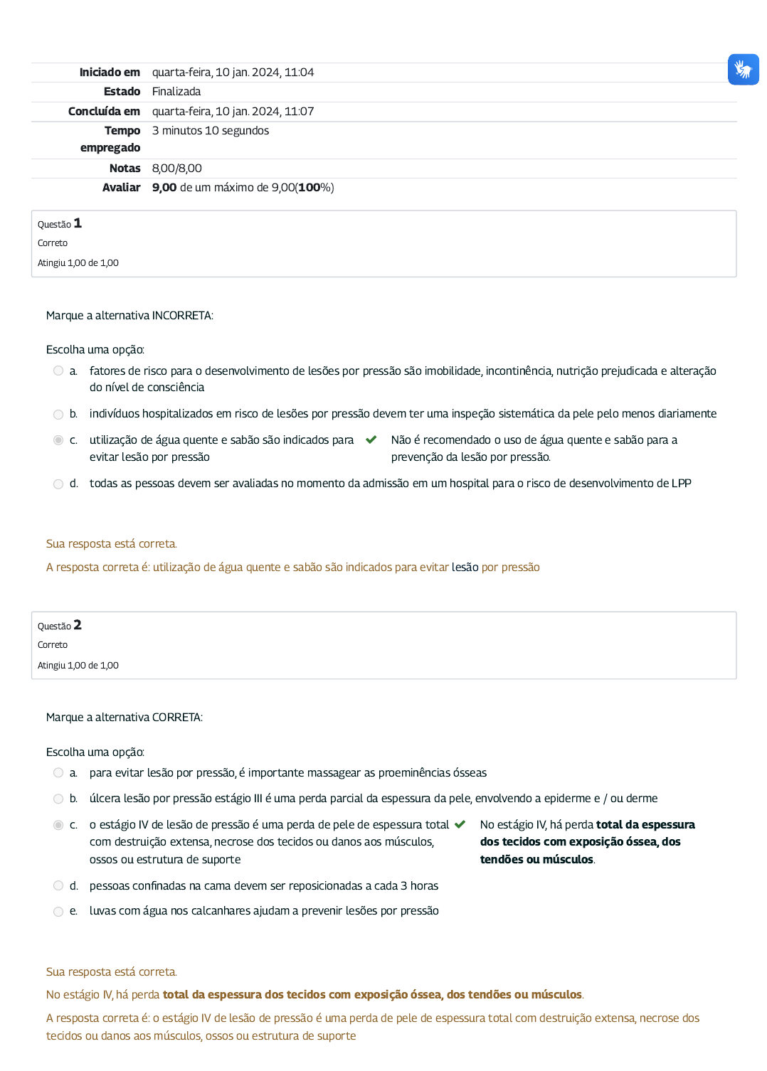 10/01/24, 11:08 Exercício Avaliativo Unidade 1 – Prevenção de Lesão por Pressão: Revisão da tentativa https://mooc41.escolavirtual.gov.br/mod/quiz/review.php?attempt=1270096&cmid=28607 1/4 Iniciado em quarta-feira, 10 jan. 2024, 11:04 Estado Finalizada Concluída em quarta-feira, 10 jan. 2024, 11:07 Tempo empregado 3 minutos 10 segundos Notas 8,00/8,00 Avaliar 9,00 de um máximo de 9,00(100%) Questão 1 Correto Atingiu 1,00 de 1,00 Questão 2 Correto Atingiu 1,00 de 1,00 Marque a alternativa INCORRETA: Escolha uma opção: a. fatores de risco para o desenvolvimento de lesões por pressão são imobilidade, incontinência, nutrição prejudicada e alteração do nível de consciência b. indivíduos hospitalizados em risco de lesões por pressão devem ter uma inspeção sistemática da pele pelo menos diariamente c. utilização de água quente e sabão são indicados para evitar lesão por pressão Não é recomendado o uso de água quente e sabão para a prevenção da lesão por pressão. d. todas as pessoas devem ser avaliadas no momento da admissão em um hospital para o risco de desenvolvimento de LPP Sua resposta está correta. A resposta correta é: utilização de água quente e sabão são indicados para evitar lesão por pressão Marque a alternativa CORRETA: Escolha uma opção: a. para evitar lesão por pressão, é importante massagear as proeminências ósseas b. úlcera lesão por pressão estágio III é uma perda parcial da espessura da pele, envolvendo a epiderme e / ou derme c. o estágio IV de lesão de pressão é uma perda de pele de espessura total com destruição extensa, necrose dos tecidos ou danos aos músculos, ossos ou estrutura de suporte No estágio IV, há perda total da espessura dos tecidos com exposição óssea, dos tendões ou músculos. d. pessoas con�nadas na cama devem ser reposicionadas a cada 3 horas e. luvas com água nos calcanhares ajudam a prevenir lesões por pressão Sua resposta está correta. No estágio IV, há perda total da espessura dos tecidos com exposição óssea, dos tendões ou músculos. A resposta correta é: o estágio IV de lesão de pressão é uma perda de pele de espessura total com destruição extensa, necrose dos tecidos ou danos aos músculos, ossos ou estrutura de suporte 10/01/24, 11:08 Exercício Avaliativo Unidade 1 – Prevenção de Lesão por Pressão: Revisão da tentativa https://mooc41.escolavirtual.gov.br/mod/quiz/review.php?attempt=1270096&cmid=28607 2/4 Questão 3 Correto Atingiu 1,00 de 1,00 Questão 4 Correto Atingiu 1,00 de 1,00 Com relação aos procedimentos a serem adotados para pacientes com LPP, julgue V ou F: 1. Uma ingestão adequada de proteínas e calorias deve ser mantida durante a doença. 2. A agenda de reposicionamento deve ser escrita e colocado à beira do leito. 3. Na posição de decúbito lateral, uma pessoa deve estar a um ângulo de 30 graus, exceto quando a condição do paciente ou outras necessidades não permitirem. 4. Pessoas restritas à cadeira devem ser colocadas sobre uma almofada de cadeira. Escolha uma opção: a. Todas as alternativas são verdadeiras Todas as quatro alternativas correspondem a procedimentos que devem ser adotados para evitar lesões por pressão. Sendo assim, todas as alternativas estão corretas. b. A alternativa "Na posição de decúbito lateral..." é falsa c. Todas as alternativas são falsas d. Apenas as alternativas "Na posição de decúbito lateral..." e "Pessoas restritas à cadeira devem...", são falsas e. A alternativa "Pessoas restritas à cadeira devem..." é falsa Sua resposta está correta. Todas as quatro alternativas correspondem a procedimentos que devem ser adotados para evitar lesões por pressão. Sendo assim, todas as alternativas estão corretas. A resposta correta é: Todas as alternativas são verdadeiras Com relação a LPP (Lesão por pressão) e sua prevenção, marque a alternativa CORRETA: Escolha uma opção: a. a orientação que deve ser dada a pacientes conscientes sobre reposicionamento para redistribuir o peso e evitar LPP é a mudança de decúbito a cada 30 minutos. b. a epiderme do paciente deve permanecer limpa e seca. Deve-se proteger a pele da exposição à umidade excessiva através do uso de produtos de barreira para diminuir o risco de lesão por pressão, como hidrocolóides e película semipermeável. c. um paciente avaliado com a Escala de Braden que recebe pontuação 13 é de alto risco para LPP. d. a Escala de Braden deve ser utilizada em pacientes com mais de 50 anos. Sua resposta está correta. Deve-se proteger a pele da exposição à umidade excessiva através do uso de produtos de barreira para diminuir o risco de lesão por pressão, como hidrocolóides e película semipermeável. A resposta correta é: a epiderme do paciente deve permanecer limpa e seca. 10/01/24, 11:08 Exercício Avaliativo Unidade 1 – Prevenção de Lesão por Pressão: Revisão da tentativa https://mooc41.escolavirtual.gov.br/mod/quiz/review.php?attempt=1270096&cmid=28607 3/4 Questão 5 Correto Atingiu 1,00 de 1,00 Questão 6 Correto Atingiu 1,00 de 1,00 Com relação a LPP e sua prevenção, marque a alternativa INCORRETA: Escolha uma opção: a. a incidência de lesões por pressão é tão grande que existem painéis internacionais para estudar riscos, prevenção e tratamento destas lesões b. para minimizar a exposição da pele à umidade por incontinência deve ser usado material absorvente c. proeminências ósseas não devem ter contato direto uma com a outra d. toda pessoa avaliada como estando em risco de desenvolver lesões por pressão deve ser colocada sobre uma cama de redistribuição de pressão e. uma bolha no calcanhar não é motivo para preocupação A avaliação completa da pele deve ser incluída na política de rastreio de avaliação de risco em todas as instituições de saúde. Uma bolha no calcanhar é motivo de preocupação. Sua resposta está correta. A avaliação completa da p