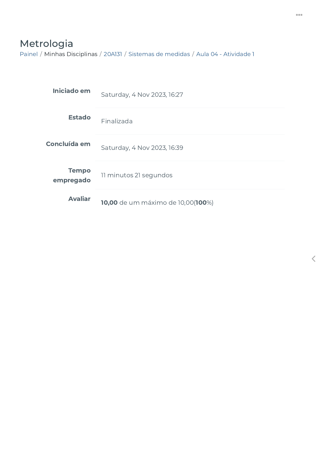 04/11/2023, 16:39 Aula 04 - Atividade 1 https://ava.politecnicabr.com.br/mod/quiz/review.php?attempt=5860275 1/9 Painel / Minhas Disciplinas / 20A131 / Sistemas de medidas / Aula 04 - Atividade 1 Metrologia Iniciado em Saturday, 4 Nov 2023, 16:27 Estado Finalizada Concluída em Saturday, 4 Nov 2023, 16:39 Tempo empregado 11 minutos 21 segundos Avaliar 10,00 de um máximo de 10,00(100%) https://ava.politecnicabr.com.br/my/ https://ava.politecnicabr.com.br/my/ https://ava.politecnicabr.com.br/course/view.php?id=968 https://ava.politecnicabr.com.br/course/view.php?id=968#section-5 https://ava.politecnicabr.com.br/mod/quiz/view.php?id=31514 https://ava.politecnicabr.com.br/ 04/11/2023, 16:39 Aula 04 - Atividade 1 https://ava.politecnicabr.com.br/mod/quiz/review.php?attempt=5860275 2/9 Questão 1 Correto Atingiu 1,50 de 1,50 Em 1875, foi criado em Paris, pela Convenção do Metro, o Bureau Internacional de Pesos e Medidas (BIPM). Qual a sua missão? Escolha uma opção: a. Assegurar a uni�cação de medidas. b. Propagar e aperfeiçoar o sistema métrico. c. Sancionar resoluções cientí�cas de caráter internacional d. Sancionar os resultados obtidos de novas determinações metrológicas fundamentais. e. Decidir sobre organização e desenvolvimento do BIPM. https://ava.politecnicabr.com.br/ 04/11/2023, 16:39 Aula 04 - Atividade 1 https://ava.politecnicabr.com.br/mod/quiz/review.php?attempt=5860275 3/9 Questão 2 Correto Atingiu 1,50 de 1,50 Um operador mediu o comprimento de uma peça com uma trena e obteve a medida de 3,4 metros. No entanto, ele deseja informar a medida para o chefe de usinagem na unidade de centímetros. Fazendo a conversão, qual é a medida correta em centímetros? Escolha uma opção: a. 340 cm. b. 0,34 cm. c. 3400 cm. d. 34000 cm. e. 34 cm. https://ava.politecnicabr.com.br/ 04/11/2023, 16:39 Aula 04 - Atividade 1 https://ava.politecnicabr.com.br/mod/quiz/review.php?attempt=5860275 4/9 Questão 3 Correto Atingiu 1,50 de 1,50 O CIPM (Comitê Internacional de Pesos e Medidas), em função da expansão das tarefas do BIPM, instituiu em 1972 Comitês Consultivos, que possuem autonomia de criar grupos de trabalho, temporário ou permanente, para o estudo de questões especí�cas. Quantos comitês foram criados? Escolha uma opção: a. Dez Comitês Consultivos. b. Sete Comitês Consultivos. c. Seis Comitês Consultivos. d. Oito Comitês Consultivos. e. Nove Comitês Consultivos. https://ava.politecnicabr.com.br/ 04/11/2023, 16:39 Aula 04 - Atividade 1 https://ava.politecnicabr.com.br/mod/quiz/review.php?attempt=5860275 5/9 Questão 4 Correto Atingiu 1,50 de 1,50 Existem diversos instrumentos de medição e eles são classi�cados por suas grandezas físicas e também por outras características. Quais são elas? Escolha uma opção: a. amanho, fornecedor e aspecto. b. Material, aspecto e tamanho. c. Fornecedor, precisão e sistema de unidade. d. Sistema de unidade, aspecto e precisão. e. Precisão, tamanho e sistema de unidade https://ava.politecnicabr.com.br/ 04/11/2023, 16:39 Aula 04 - Atividade 1 https://ava.politecnicabr.com.br/mod/quiz/review.php?attempt=5860275 6/9 Questão 5 Correto Atingiu 1,50 de 1,50 Quais são os métodos utilizados para a conversão de medidas? Escolha uma opção: a. Método da divisão, da multiplicação e da análise dimensional. b. Método da tabela, do grá�co e da análise dimensional. c. Método da tabela, da potência de 10 e da análise dimensional. d. Método da potência de 10, do grá�co e da divisão e. Método do grá�co, da divisão e da exponenciação. https://ava.politecnicabr.com.br/ 04/11/2023, 16:39 Aula 04 - Atividade 1 https://ava.politecnicabr.com.br/mod/quiz/review.php?attempt=5860275 7/9 Questão 6 Correto Atingiu 1,00 de 1,00 Sabe-se que o bloco padrão é um objeto fabricado para calibrar instrumentos. O bloco padrão é con�gurado em um kit com diversas medidas. Qual a medida do instrumento é garantida no bloco padrão e qual aspecto ele representa na medição? Escolha uma opção: a. Medida real, garantido a incerteza da medição. b. Medida aleatória, garantindo a incerteza ou o desvio na medição c. Medida imaginária, garantindo o desvio na medição. d. Medida real, garantindo o desvio na medição. e. Medida imaginária, garantindo a incerteza na medição. https://ava.politecnicabr.com.br/ 04/11/2023, 16:39 Aula 04 - Atividade 1 https://ava.politecnicabr.com.br/mod/quiz/review.php?attempt=5860275 8/9 Questão 7 Correto Atingiu 1,50 de 1,50 Pedro fez uma conta e veri�cou que estava consumindo muita água durante o mês em sua residência. Sabendo que ele pretende reduzir o consumo de água, em volume, de 10 m para 9,3 m no próximo mês, e que a densidade da água é de aproximadamente 1.000 kg/m , quanto de economia em litros ele terá e qual será a porcentagem dessa redução se ele atingir o consumo desejado? Escolha uma opção: 3 3 3 a. 7.000 litros e 7%. b. 3.500 litros e 7%. c. 700 litros e 7%. d. 0,7 litros e %. e. 350 litros e 14%. Entre em Contato https://www.politecnicabr.com.br 0800 084 2627 0800 084 2627 Links Úteis Dicas da nossa Diretora Acadêmica Planner de Estudos Declaração de Matrícula Orientações do AVA Abertura de Ticket Fale com o Tutor Cronograma de Estudos Manual de Estágio Manual de Competência https://www.politecnicabr.com.br/ https://soundcloud.com/user-501638417/sets/escola-politecnica-brasileira https://soundcloud.com/user-501638417/sets/escola-politecnica-brasileira https://storage.googleapis.com/sirius-pubstore/semestre_plannerdeestudo%20poli.pdf https://storage.googleapis.com/sirius-pubstore/semestre_plannerdeestudo%20poli.pdf https://storage.googleapis.com/sirius-pubstore/declaracao_matricula.pdf https://storage.googleapis.com/sirius-pubstore/declaracao_matricula.pdf https://storage.googleapis.com/sirius-pubstore/orientacoes_ava.pdf https://storage.googleapis.com/sirius-pubstore/orientacoes_ava.pdf https://storage.googleapis.com/sirius-pubstore/a