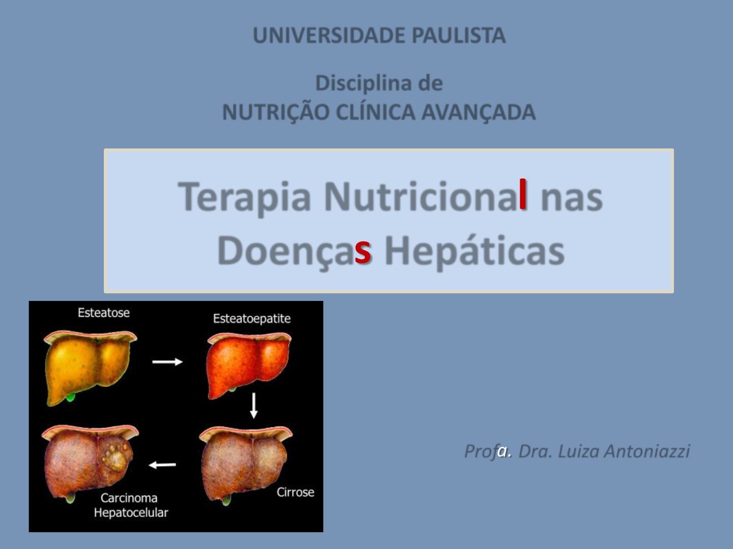 Terapia Nutricional nas Doenças Hepáticas Profa. Dra. Luiza Antoniazzi Disciplina de NUTRIÇÃO CLÍNICA AVANÇADA 2020 UNIVERSIDADE PAULISTA ➢ DHGNA: depósito de lipídios nos hepatócitos, SEM consumo excessivo de álcool (<20g de etanol); ➢ Distúrbios metabólicos, especialmente a síndrome metabólica DOENÇA HEPÁTICA GORDUROSA NÃO ALCOÓLICA (DHGNA) NASH: nonalcoholic steatohepatitis Escore de fator de risco para DHGNA: - IMC > 28 kg/m2 - Idade > 50 a - Aumento ALT ou (2x o normal) - TG> 150 mg/dL - * alanina aminotransferase (ALT) ou TGO (transaminase glutâmica oxalacética) Excesso da ingestão calórica Obesidade Excesso de gordura dietética Oxidação hepática de AG Fluxo de AG De novo lipogênese adiponectina RI e hiperinsulinemia Esteatose hepática DOENÇA HEPÁTICA GORDUROSA NÃO ALCOÓLICA (DHGNA) DOENÇA HEPÁTICA GORDUROSA NÃO ALCOÓLICA (DHGNA) Abordagem nutricional visa: ➢Redução do peso (controle das comorbidades→ CAUTELA) ➢Estímulo à detoxificação hepática ➢Controle da RI ➢Melhora do perfil lipídico ➢ Incentivo à alimentação saudável Recomendação TN: perda gradativa de 10% do peso corporal (em 6 meses): 25 kcal/kg/dia (ou - 500 a 1000 Kcal/d) + 6h de AF aeróbia/semana DOENÇA HEPÁTICA GORDUROSA NÃO ALCOÓLICA (DHGNA) Nutriente Ingestão recomendada Gordura total ≤ 30% VCT AG saturados 8-10% VCT AG monoinsaturados > 15% VCT AG poli-insaturados > 10% VCT Colesterol < 300 mg/dia Proteína Aproximadamente 15 % VCT Carboidrato Aproximadamente 55% VCT Cloreto de sódio Aproximadamente 6 g NaCl Cálcio 1000-1500 mg/dia Fibras 20-30 g/dia DOENÇA HEPÁTICA GORDUROSA NÃO ALCOÓLICA (DHGNA) Fibras Fontes Solúveis Pectina Maçã, casca de frutas cítricas, morango Gomas Aveia, leguminosas secas Algumas hemiceluloses Psylium Fruto-oligossacarídeos Alho, cebola, banana, tomate, alcachofra, produzido a partir da inulina, massas Insolúveis Celulose Farinha de trigo integral, feijões, ervilha, maçã, farelo, repolho, raízes, vegetais Hemicelulose tipo β Farelo, cereais, soja, grãos integrais Lignina Vegetais maduros, trigo Fontes de carboidrato: atenção com índice glicêmico dos alimentos DOENÇA HEPÁTICA GORDUROSA NÃO ALCOÓLICA (DHGNA) ➢ Alimentação rica em antioxidantes (não existem recomendações específicas para DHGNA) ➢ Uso de alimentos funcionais: SOJA (PTN, fibras e isoflavonóides), AVEIA (fibras solúveis) e compostos organossulfurados (como os vegetais brássicos), fontes de flavonóides. ➢ AG ômega-3: efeitos benéficos especulados ➢ Poucos estudos com uso de suplemento de ɯ-3 (óleo de peixe) → estímular o consumo de peixes ❖ Insuficiência hepática aguda (citotoxicidade ou colestase, infecção viral – hepatite B, hepatite C) ❖ Insuficiência hepática aguda fulminante (encefalopatia hepática em no máximo 15 dias após instalação da IH) ❖ Insuficiência hepática crônica (danos repetitivos ao parênquima hepático – doença de Wilson, Hemocromatose hereditária, galactosemia, cirrose, etanol, infecção viral, acúmulo de gordura citoplasmática ou doença autoimune) ❖ Insuficiência hepática aguda subcrônica (redução abrupta da função hepática em paciente com diagnóstico prévio de hepatopatia crônica) Insuficiência hepática (IH) = Lesão hepatocelular com redução da capacidade funcional ≥ 80% PACIENTE HEPATOPATA CRÔNICO ↑ risco de desnutrição Ingestão inadequada • Anorexia, náuseas, uso contínuo álcool, restrições dietéticas Má absorção/ má digestão • Colestase, doenças intestinas/pancreáticas, medicações Alterações metabólicas ↑ demanda energética • Hipermetabolismo, ↓ estoque glicogênio, alterações síntese proteica • Infecções, hemorragias, paracenteses Parâmetros nutricionais Fatores que alteram a avaliação Peso corporal Ascite, edema, diuréticos Antropometria Variações do estado de hidratação Bioimpedância Variações do estado de hidratação Proteínas séricas Dieta, drogas, má-absorção, inflamação Avaliação subjetiva global Necessidade de testar com indivíduos hepatopatas Child-Pugh, CONUT Inclui alterações das doenças hepáticas Relacionada ao prognóstico do hepatopata Índice de Risco Nutricional (IRN) • IRN = (1,519 x albumina plasmática [g/ dL]) + 41,7 x (peso atual/ peso usual). • O peso usual foi definido como o peso mais estável do paciente em seis ou mais meses anterior à avaliação. • Pontos de corte para o diagnóstico de desnutrição: • IRN > 100 - Indica ausência de desnutrição, ou seja, o paciente é bem nutrido; • IRN = 97,5 a 100 - Indica que o paciente é levemente desnutrido; • IRN = 83,5 a 97,4 - Indica que o paciente é moderadamente desnutrido; • IRN < 83,5 - Indica que o paciente é gravemente desnutrido. Índice de Maastricht (IM) • IM = 20,68 – (2,4 x albumina plasmática [g/dL]) – (0,1921 x pré-albumina [mg/dL]) – (0,00186 x linfócitos totais [células/mm3 ]) – (4 x [peso atual/peso ideal]) • O Peso Ideal (PI) para cálculo do percentual de peso ideal foi obtido pela equação: PI = 22 x (altura [m]2). • Pontos de corte para o diagnóstico de desnutrição: • IM > 0 a 3 - Indica que o paciente é levemente desnutrido; • IM > 3 a 6 - Indica que o paciente é moderadamente desnutrido; • IM > 6 - Indica que o paciente é gravemente desnutrido. Classificação de Child-Pugh INR = International Normalized Ratio Heidelbaugh e Sherbondy, 2006. Critérios de classificação de Child-Pugh Encefalopatia hepática Ausente Grau I - II Grau III - IV Albumina > 3,5 2,8- 3,5 < 2,8 Bilirrubina total < 2,0 2,0 – 3,0 > 3,0 Ascite Ausente Leve Moderada, grave ou refratária Tempo de protrombina ou INR <4 < 1,7 4-6 1,7 – 2,3 >6 > 2,3 Pontuação 1 2 3 Resultado da classificação Child A: 5-6 pontos Child B: 7-9 pontos Child C: 10-15 pontos CONUT (CONtrolling NUTritional status) Fukushima et al., 2011. Variáveis Albumina (mg/dL) ≥ 3,5 