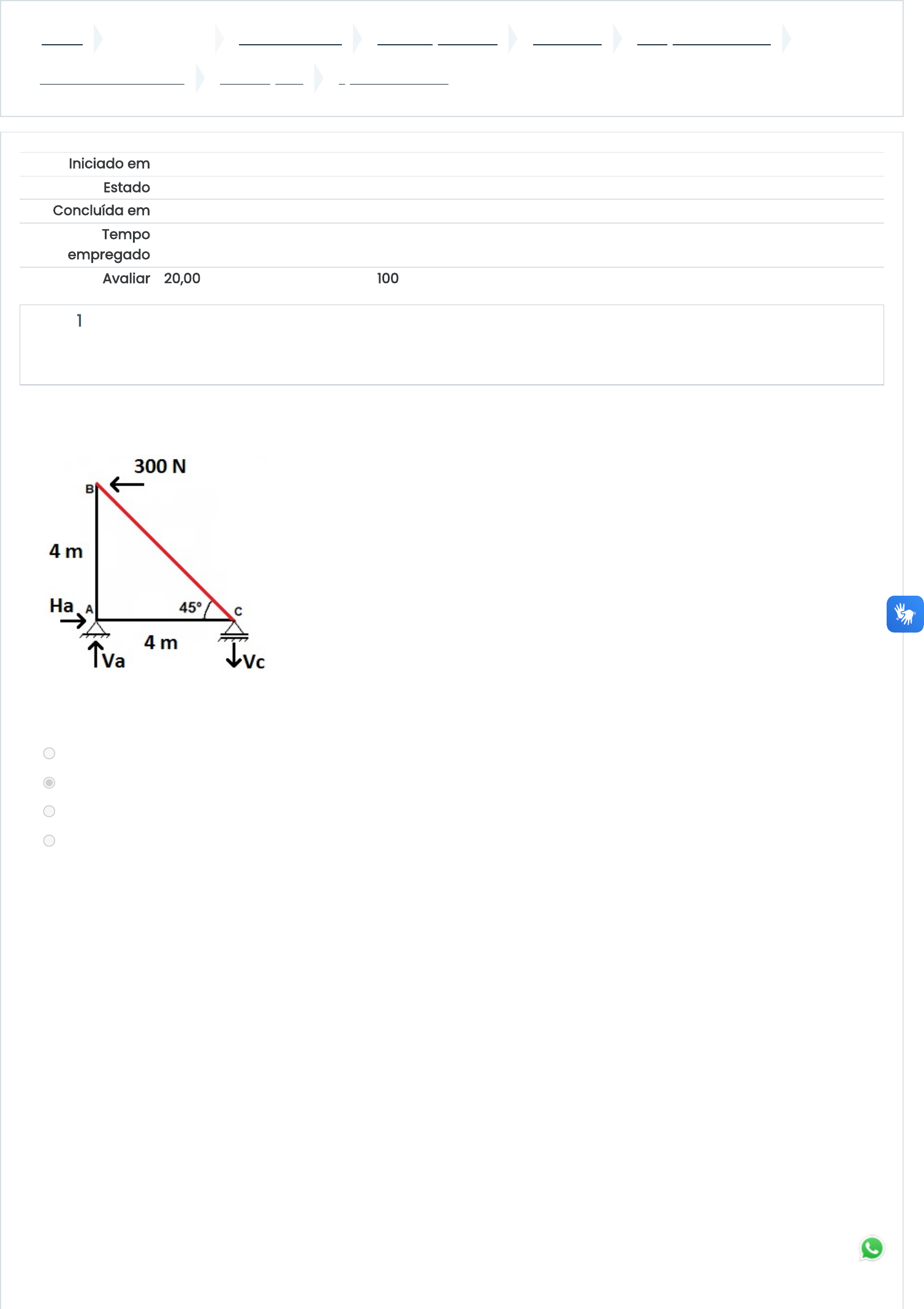 Painel Meus cursos CURSOS FUNEC Graduação - EAD Aluno EAD JUNÇÕES DE TURMA Teoria das Estruturas AVALIAÇÕES QUESTIONÁRIO 2 Iniciado em Thursday, 4 Jan 2024, 12:11 Estado Finalizada Concluída em Thursday, 4 Jan 2024, 12:26 Tempo empregado 14 minutos 23 segundos Avaliar 20,00 de um máximo de 20,00(100%) Questão 1 Completo Atingiu 2,00 de 2,00 Determine a força no membro BC da treliça mostrada na figura abaixo e indique se está sob tração ou compressão. Escolha uma opção: a. 321,726 N (Tração) b. 424,264 N (Tração) c. 424,264 N (Compressão) d. 321,726 N (Compressão) https://ava.funec.br/my/ https://ava.funec.br/course/index.php?categoryid=10 https://ava.funec.br/course/index.php?categoryid=17 https://ava.funec.br/course/index.php?categoryid=19 https://ava.funec.br/course/index.php?categoryid=77 https://ava.funec.br/course/view.php?id=1262 https://ava.funec.br/course/view.php?id=1262#section-6 https://ava.funec.br/mod/quiz/view.php?id=16996 Questão 2 Completo Atingiu 2,00 de 2,00 Questão 3 Completo Atingiu 2,00 de 2,00 Questão 4 Completo Atingiu 2,00 de 2,00 Assinale a alternativa que corresponde aos valores de X, Y e Z, representados na linha de influência referente ao Momento Fletor na seção S Escolha uma opção: a. X = -2,0; Y = +1,0; Z = -2,0. b. X = -3,0; Y = +9,0; Z = -1,5. c. X = -1,0; Y = +2,0; Z = -1,0. d. X = -1,0; Y = +2,0; Z = -2,0. Assinale a alternativa referente à definição de estrutura porticada? Escolha uma opção: a. É aquela composta por um ou mais pórticos, dispostos linearmente ou sobrepostos. b. Estruturas que não são estáveis, uma vez que apresentam número de reações de apoio menor do que o número de equações de equilíbrio. c. Estruturas em que o número de vínculos é maior do que o número de movimentos possíveis do corpo rígido. d. É aquela que apresenta apoios dispostos de modo a impedir completamente o mo-vimento de corpo rígido da estrutura. Calcule o grau de hiperestaticidade da viga abaixo: Escolha uma opção: a. 2 b. 4 c. 1 d. 3 https://ava.funec.br/mod/resource/view.php?id=20153 Questão 5 Completo Atingiu 2,00 de 2,00 Questão 6 Completo Atingiu 2,00 de 2,00 Assinale a alternativa que corresponde aos valores de X e Y, representados na linha de influência da reação de apoio vertical do apoio A. Escolha uma opção: a. X = +1,125; Y = -0,187. b. X = +1,125; Y = -1,125. c. X = -1,125; Y = +0,187. d. X = +0,187; Y = -1,125. Complete a frase a seguir e assinale a alternativa correta: os pórticos são estruturas rígidas formadas pela associação de ______________ Escolha uma opção: a. pilares e lajes b. vigas e pilares. c. vigas e lajes d. pilares, lajes e fundação. Questão 7 Completo Atingiu 2,00 de 2,00 Questão 8 Completo Atingiu 2,00 de 2,00 Assinale a alternativa que corresponde aos valores de X, Y e Z, representados na linha de influência referente ao esforço cortante na seção S Escolha uma opção: a. X = +0,25; Y = +0,375; Z = -0,24. b. X = +0,20; Y = +0,625; Z = -0,25. c. X = +0,30; Y = +0,375; Z = -0,3. d. X = +0,25; Y = +0,375; Z = -0,3. Determine a força no membro BC da treliça mostrada na figura abaixo. Dados: Sen𝛳 = 0,6; Cos𝛳 = 0,8 Escolha uma opção: a. 120 kN b. 500 kN c. 220 kN d. 0 kN Questão 9 Completo Atingiu 2,00 de 2,00 Questão 10 Completo Atingiu 2,00 de 2,00 Complete a frase a seguir e assinale a alternativa correta: Se a força tende a alongar o membro de uma treliça, ela é uma força de ___________; se ela tende a encurtar o membro de uma treliça, é uma força de ___________. Escolha uma opção: a. compressão; tração. b. torção; flexão. c. flexão; torção. d. tração; compressão. Uma estrutura é considerada estaticamente indeterminada, quando: Escolha uma opção: a. a estrutura a ser analisada tem menos reações externas e/ou menos forças internas a serem determinadas do que as incógnitas resolvidas pelas equações de equilíbrio da estática. b. a estrutura a ser analisada tem mais reações externas e/ou mais forças internas a serem determinadas do que as incógnitas resolvidas pelas equações de equilíbrio da estática. c. a estrutura a ser analisada tem mais reações externas e/ou mais forças internas a serem determinadas do que as incógnitas resolvidas pelas equações de equilíbrio da dinâmica. d. a estrutura a ser analisada tem menos reações externas e/ou mais forças internas a serem determinadas do que as incógnitas resolvidas pelas equações de equilíbrio da estática. Manter contato RA (33) 99986-3935 secretariaead@funec.br Obter o aplicativo para dispositivos móveis tel:RA (33) 99986-3935 mailto:secretariaead@funec.br https://www.facebook.com/caratingaunec https://twitter.com/caratingaunec https://download.moodle.org/mobile?version=2019052001.02&lang=pt_br&iosappid=633359593&androidappid=com.moodle.moodlemobile