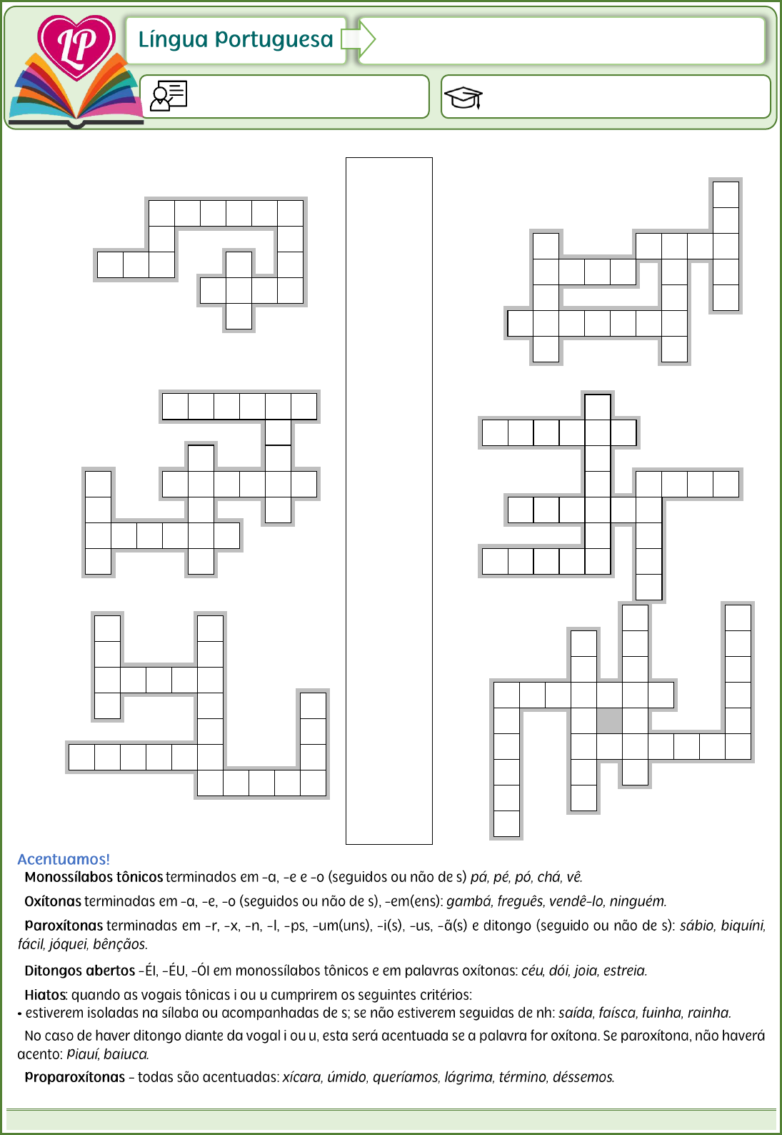 Acentuação gráfica “Você é único quando pensa diferente.” Pág. 1 Observe as palavras listadas, acentue-as se necessário e, a seguir, encaixe cada uma em sua respectiva regra. M on oss íla ba s t ôn ica s ◇Aneis ◇Belem ◇Chuchu ◇Conves ◇Corroi ◇Enjoo ◇Feiura ◇Graunha ◇Heroi ◇Heroico ◇Hifen ◇Humus ◇Ideia ◇Imãs ◇Impeto ◇Jupiter ◇Lampada ◇Leem ◇Logico ◇Meis ◇Mes ◇Moinho ◇Pes ◇Plateia ◇Po-los ◇Pus ◇Raul ◇Reis ◇Retros ◇Roido ◇Saci ◇Sindico ◇Sois ◇Tecnico ◇Veus ◇Xiita Pa ro xít on as Ox íto na s Hi ato s Di ton go s Pr op ar ox íto na s ▶ ▶ ▶ ▶ ▶ ▶ ▶ Gabarito – Cruzadinha Acentuação 2 Profª Scheila Acentuação gráfica http://www.licaopratica.com.br Acentuação gráfica “Você é único quando pensa diferente.” Pág. 2 Lição Prática – www.licaopratica.com.br M on oss íla ba s Pa ro xít on as Monossílabas tônicas Mês Pés Pô-los Pus Réis Sóis Oxítonas Belém Chuchu Convés Herói Retrós Saci Paroxítonas Enjoo Heroico Hífen Húmus Ímãs Leem Ditongos Anéis (oxítona) Corrói (oxítona) Ideia (paroxítona) Méis (monossílaba) Plateia (paroxítona) Véus (monossílaba) Hiatos Feiura Graunha Moinho Raul Roído Xiita Proparoxítonas Ímpeto Júpiter Lâmpada Lógico Síndico Técnico Ox íto na s Hi ato s Di ton go s Pr op ar ox íto na s *Graunha (semente da uva) ▶ ▶ ▶ ▶ ▶ ▶ ▶ 1 2 3 4 5 EclipseCrossword.com M Ê P U S Ô - R L P É S O I S Ó I S 1 2 3 4 5 6 EclipseCrossword.com H H Í F E N M R Ã O S I L C E N J O O E H Ú M U S 1 2 3 4 5 6 EclipseCrossword.com S A C I O N C R V H B E L É M U T S C R H E R Ó I U S 1 2 3 4 5 EclipseCrossword.com F X E M I I O I U I T G R A U N H A A H R O Í D O A U L 1 2 3 4 5 6 EclipseCrossword.com C M É I S O D R E R I Ó P L A T E I A N É I V É U S 1 2 3 4 5 EclipseCrossword.com L Ó G I C O Â M J Ú P I T E R A É S Í N D I C O A N I C Í M P E T O http://www.licaopratica.com.br/