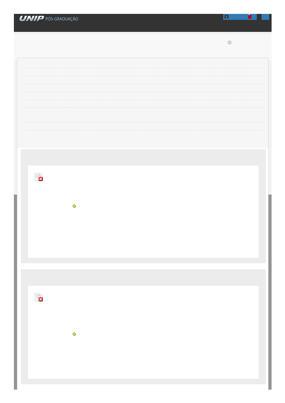 05/10/2021 08:31 Revisar envio do teste: Questionário - Unidade lV – ... https://ava.ead.unip.br/webapps/assessment/review/review.jsp?attempt_id=_69619768_1&course_id=_56611_1&content_id=_853849_1&return_… 1/4 Revisar envio do teste: Questionário - Unidade lV Metodologias Ativas e Avaliação da Aprendizagem 14330-40-ED11392_06_07-202132 Unidade IV Usuário Lilian Chagas da Silva Curso Metodologias Ativas e Avaliação da Aprendizagem Teste Questionário - Unidade lV Iniciado 05/10/21 08:31 Enviado 05/10/21 08:31 Status Completada Resultado da tentativa 0 em 0,75 pontos Tempo decorrido 0 minuto Resultados exibidos Todas as respostas, Respostas corretas, Comentários, Perguntas respondidas incorretamente Pergunta 1 Respostas: a. b. c. d. e. A chamada Pedagogia do Exame descrita por Luckesi trouxe impactos na trajetória de alunos, como: ampliar as condições de melhorar resultados pelo acompanhamento do professor transformar a avaliação em instrumento de controle favorecer maior concentração a partir dos resultados obtidos repensar os instrumentos de avaliação para que dialogue com o aluno reavaliar os processos de ensino/aprendizagem com instrumentos mais subjetivos e de menor rigor Pergunta 2 Respostas: a. b. c. d. e. Muitos são os problemas encontrados nas avaliações realizadas pelos professores, mais precisamente em seus instrumentos de avaliação. Depresbiteris e Tavares (2009) destacam alguns, entre eles: Provas de testes Propensão a pegadinhas Provas com produção de texto Enunciados extensos Conceitos complexos de se explicar PÓS EAD CONTEÚDOS ACADÊMICOS COMUNIDADES BIBLIOTECAS Mural do A 0 em 0,075 pontos 0 em 0,075 pontos Lilian Silva 1 https://ava.ead.unip.br/webapps/blackboard/execute/courseMain?course_id=_56611_1 https://ava.ead.unip.br/webapps/blackboard/content/listContent.jsp?course_id=_56611_1&content_id=_853835_1&mode=reset https://ava.ead.unip.br/webapps/portal/execute/tabs/tabAction?tab_tab_group_id=_66_1 https://ava.ead.unip.br/webapps/portal/execute/tabs/tabAction?tab_tab_group_id=_70_1 https://ava.ead.unip.br/webapps/portal/execute/tabs/tabAction?tab_tab_group_id=_69_1 https://ava.ead.unip.br/webapps/portal/execute/tabs/tabAction?tab_tab_group_id=_67_1 https://ava.ead.unip.br/webapps/portal/execute/tabs/tabAction?tab_tab_group_id=_68_1 https://ava.ead.unip.br/webapps/login/?action=logout 05/10/2021 08:31 Revisar envio do teste: Questionário - Unidade lV – ... https://ava.ead.unip.br/webapps/assessment/review/review.jsp?attempt_id=_69619768_1&course_id=_56611_1&content_id=_853849_1&return_… 2/4 Pergunta 3 Respostas: a. b. c. d. e. Entre os instrumentos indicados para a metodologia de aprendizagem baseada em projetos no ambiente virtual e presencial, respectivamente, encontram-se: blogs e chamada oral wikis e provas em grupo webconferências e provas de testes fóruns e maquetes fóruns e provas com produção de texto Pergunta 4 Respostas: a. b. c. d. e. A aprendizagem baseada na investigação tem na avaliação uma rica oportunidade de contribuir para o avanço do aluno. Nessa proposta destaca-se como prática de avaliação: a avaliação somativa e ocular a avaliação por norma e a somativa a avaliação diagnóstica e somativa a avaliação mediadora e processual a avaliação diagnóstica e formativa Pergunta 5 Respostas: a. b. c. d. e. Na proposta de metodologias ativas, a chamada “aprendizagem baseada em problemas” tem na avaliação a ideia de: motivação individual, pois a solução do problema se dá individualmente identificação de alunos mais esforçados que merecem melhor nota avaliação somativa, que se dá ao final do processo, após a resolução do problema controle da participação e assiduidade de cada aluno diante das tarefas atribuídas pelo professor critérios estabelecidos previamente com foco nos objetivos de aprendizagem Pergunta 6 0 em 0,075 pontos 0 em 0,075 pontos 0 em 0,075 pontos 0 em 0,075 pontos 05/10/2021 08:31 Revisar envio do teste: Questionário - Unidade lV – ... https://ava.ead.unip.br/webapps/assessment/review/review.jsp?attempt_id=_69619768_1&course_id=_56611_1&content_id=_853849_1&return_… 3/4 Respostas: a. b. c. d. e. Uma proposta de avaliação que promove a autonomia dos estudantes é a chamada “avaliação por pares”. Nesse modelo, o aluno tem como benefício o fato de que: é sujeito da avaliação, dividindo o posto de avaliador vai se deparar com a necessidade de empatia se expõe à avaliação de outro colega e pode avaliá-lo com o mesmo rigor com que foi avaliado não precisa se esforçar para uma atividade impecável, pois quem vai avaliar não é o professor a nota atribuída por um colega será sempre alta em relação a do professor Pergunta 7 Respostas: a. b. c. d. e. A década de 1980 vigorou a avaliação baseada no paradigma: objetivo racional equitativo subjetivo subjetivo emocional qualitativo e quantitativo rigoroso e subjetivo Pergunta 8 Respostas: a. b. c. d. e. Para superar equívocos na prática avaliativa que podem comprometer o resultado e o diagnóstico final da aprendizagem dos alunos, Depresbiteris e Tavares (2009) sugerem que o professor se faça alguns questionamentos ao elaborar um instrumento de avaliação, como por exemplo: quais as finalidades da avaliação que será aplicada? os critérios estão adequados ao perfil da turma? a prova apresenta questões de múltipla escolha? os itens foram elaborados tendo em consideração as dificuldades do grupo? a prova apresenta questões de resposta construída? Pergunta 9 0 em 0,075 pontos 0 em 0,075 pontos 0 em 0,075 pontos 05/10/2021 08:31 Revisar envio do teste: Questionário - Unidade lV – ... https://ava.ead.unip.br/webapps/assessment/review/review.jsp?attempt_id=_69619768_1&course_id=_56611_1&content_id=_853849_1&return_… 4/4 Terça-feira, 5 de Outubro de 2021 08h31min25s GMT-03:00 Respostas: a. b. c. d. e. A auto-avaliação é uma oportunidade de crescimento para o aluno, pois ela tem por 