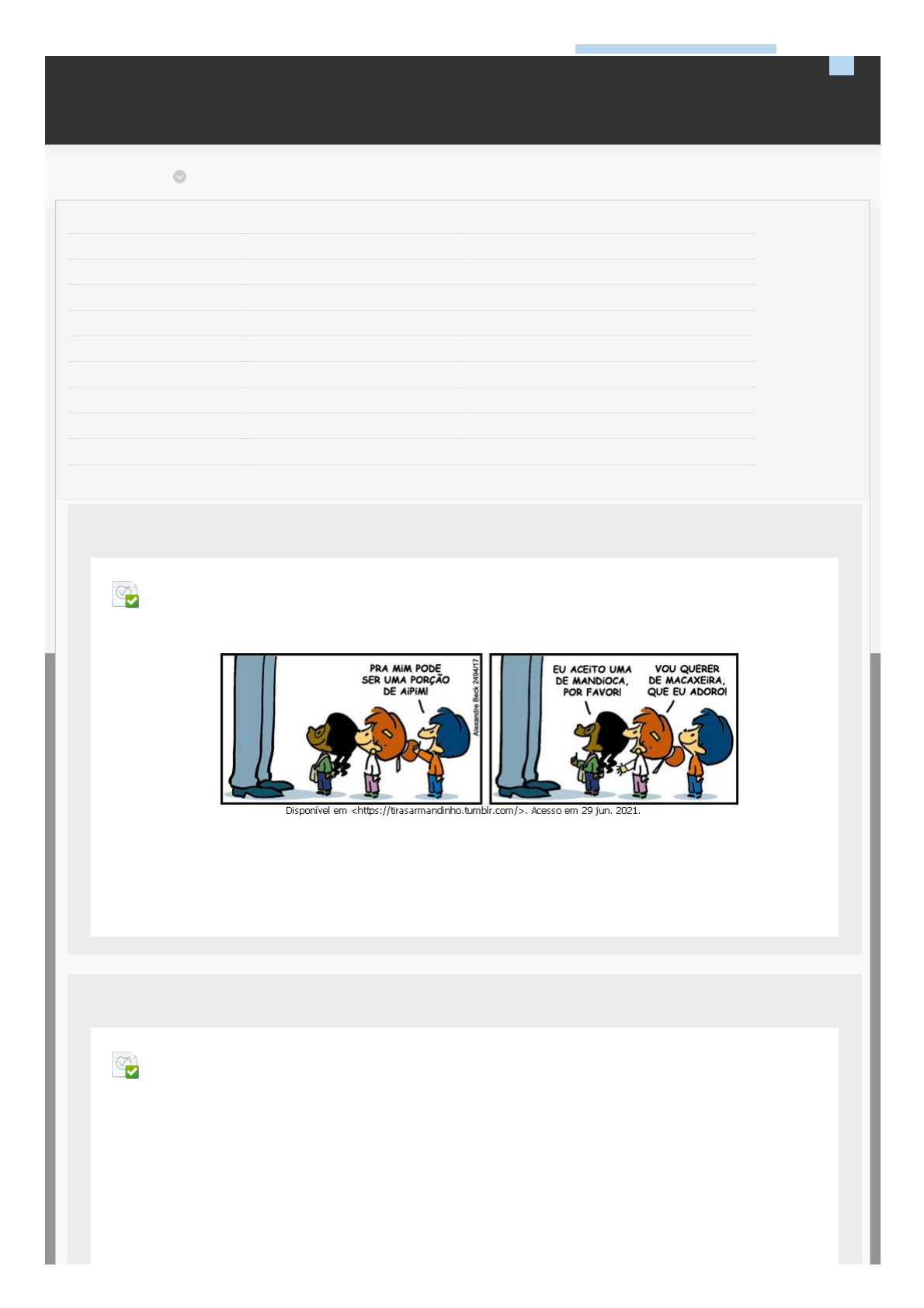 25/10/2021 12:45 Revisar envio do teste: PSA 2021/2 – PSA 6937-00 https://ava.ead.unip.br/webapps/assessment/review/review.jsp?attempt_id=_71085142_1&course_id=_28560_1&content_id=_2417896_1&outc… 1/19 Revisar envio do teste: PSA 2021/2PSA 6937-00 CONTEÚDO Usuário paula.castilho @aluno.unip.br Curso PSA Teste PSA 2021/2 Iniciado 25/10/21 11:24 Enviado 25/10/21 11:38 Data de vencimento 26/10/21 01:00 Status Completada Resultado da tentativa 10 em 10 pontos Tempo decorrido 14 minutos Autoteste O aluno responde e o resultado do aluno não é visível ao professor. Resultados exibidos Respostas enviadas, Perguntas respondidas incorretamente Pergunta 1 Resposta Selecionada: c. Analise a charge a seguir. Considerando as informações, é correto afirmar que a charge remete à reflexão sobre a riqueza do vocabulário brasileiro. Pergunta 2 Leia o meme e o texto a seguir. UNIP EAD CONTEÚDOS ACADÊMICOS BIBLIOTECAS MURAL DO ALUNO TUTO 0,5 em 0,5 pontos 0,5 em 0,5 pontos p p http://company.blackboard.com/ https://ava.ead.unip.br/webapps/blackboard/execute/courseMain?course_id=_28560_1 https://ava.ead.unip.br/webapps/blackboard/content/listContent.jsp?course_id=_28560_1&content_id=_439332_1&mode=reset https://ava.ead.unip.br/webapps/portal/execute/tabs/tabAction?tab_tab_group_id=_10_1 https://ava.ead.unip.br/webapps/portal/execute/tabs/tabAction?tab_tab_group_id=_25_1 https://ava.ead.unip.br/webapps/portal/execute/tabs/tabAction?tab_tab_group_id=_27_1 https://ava.ead.unip.br/webapps/portal/execute/tabs/tabAction?tab_tab_group_id=_47_1 https://ava.ead.unip.br/webapps/portal/execute/tabs/tabAction?tab_tab_group_id=_29_1 https://ava.ead.unip.br/webapps/login/?action=logout 25/10/2021 12:45 Revisar envio do teste: PSA 2021/2 – PSA 6937-00 https://ava.ead.unip.br/webapps/assessment/review/review.jsp?attempt_id=_71085142_1&course_id=_28560_1&content_id=_2417896_1&outc… 2/19 Disponível em <https://pt.dopl3r.com/memes/engra%C3%A7ado/as-pessoas-dev eriam-antes-de-compartilhar-pesquisar-se-as-frases-atribuidasa-pessoasfamosa s-realmente-pertencem-a-elas-d-pedro/102625/>. Acesso em 21 jul. 2021. Fake news são notícias e informações falsas — ou modi�cadas — veiculadas na internet com o propósito de manipular pessoas e eventos. Elas também estão ligadas ao sensacionalismo, que visa a chamar a atenção e a obter “likes” para gerar lucro. Segundo pesquisa do Instituto Reuters para o estudo do Jornalismo, as redes sociais são a maior fonte de notícias para os brasileiros. E isso só aumenta, já que o percentual de pessoas que usam as redes sociais como fonte de notícias foi de 47% em 2013 para 72% em 2016. Isso mostra que a repercussão de uma notícia falsa pode atingir inúmeras pessoas em poucos minutos e acarretar prejuízos morais e até mesmo �nanceiros. Algumas pessoas acreditam que as fake news prejudicam apenas pessoas públicas, mas isso não é uma regra. É o caso de uma mulher em São Paulo que foi espancada até a morte depois de ter sido acusada de sequestrar e matar crianças para fazer magia negra. Os boatos associavam seu nome e sua imagem ao crime; só após sua morte a verdade apareceu. Outra situação envolvendo fake news foi a da vereadora Marielle Franco, que teve seu nome vinculado a mentiras com o intuito de desquali�car sua imagem. Uma das notícias foi a de que ela seria casada com um tra�cante e eleita por uma das maiores facções criminosas do país, o Comando Vermelho. Contudo, tais informações eram inverídicas. 25/10/2021 12:45 Revisar envio do teste: PSA 2021/2 – PSA 6937-00 https://ava.ead.unip.br/webapps/assessment/review/review.jsp?attempt_id=_71085142_1&course_id=_28560_1&content_id=_2417896_1&outc… 3/19 Resposta Selecionada: c. Disponível em <https://foconoenem.com/fake-news-redacao-enem/>. Acesso em 20 jan. 2019. Com base na leitura e nos seus conhecimentos, avalie as a�rmativas. I. O meme, para criticar a propagação de fake news, apoia-se, ironicamente, em uma citação falsa. II. O meme e o texto apresentam discursos antagônicos, pois o primeiro mostra que as notícias falsas podem ser simples brincadeira. III. O texto alerta para a necessidade de se checar a fonte das informações, pois as fake news podem trazer prejuízo à sociedade. É correto o que se a�rma apenas em I e III. Pergunta 3 Leia a imagem e o texto a seguir. 0,5 em 0,5 pontos 25/10/2021 12:45 Revisar envio do teste: PSA 2021/2 – PSA 6937-00 https://ava.ead.unip.br/webapps/assessment/review/review.jsp?attempt_id=_71085142_1&course_id=_28560_1&content_id=_2417896_1&outc… 4/19 Resposta Selecionada: e. I. A difusão de fake news e de informações incoerentes sobre o processo pandêmico do Covid-19 colaboram para o acometimento da saúde física e mental da população. II. A suspeita de infecção pelo coronavírus pode favorecer o desenvolvimento de comportamentos obsessivo-compulsivos, como a verificação quase contínua da temperatura corporal. III. A redução do contato interpessoal, observado pelo fechamento de escolas e universidades e pelo isolamento social, tem contribuído para o aumento do estresse na população em geral. IV. O objetivo da figura é mostrar as atividades que podem melhorar a saúde mental, que foi afetada pela pandemia. A rápida disseminação do novo coronavírus por todo o mundo, as incertezas sobre como controlar a doença e sobre sua gravidade, além da imprevisibilidade acerca do tempo de duração da pandemia e dos seus desdobramentos, caracterizam- se como fatores de risco à saúde mental da população geral (Zandifar & Badrfam, 2020). Esse cenário parece agravado também pela difusão de mitos e informações equivocadas sobre a infecção e as medidas de prevenção, assim como pela dificuldade da população geral em compreender as orientações das autoridades sanitárias (Bao, Sun, Meng, Shi, & Lu, 2020). Nesse sentido, videoclipes e mensagens alarmantes sobre a Covid-19 têm circulado em mídias sociais