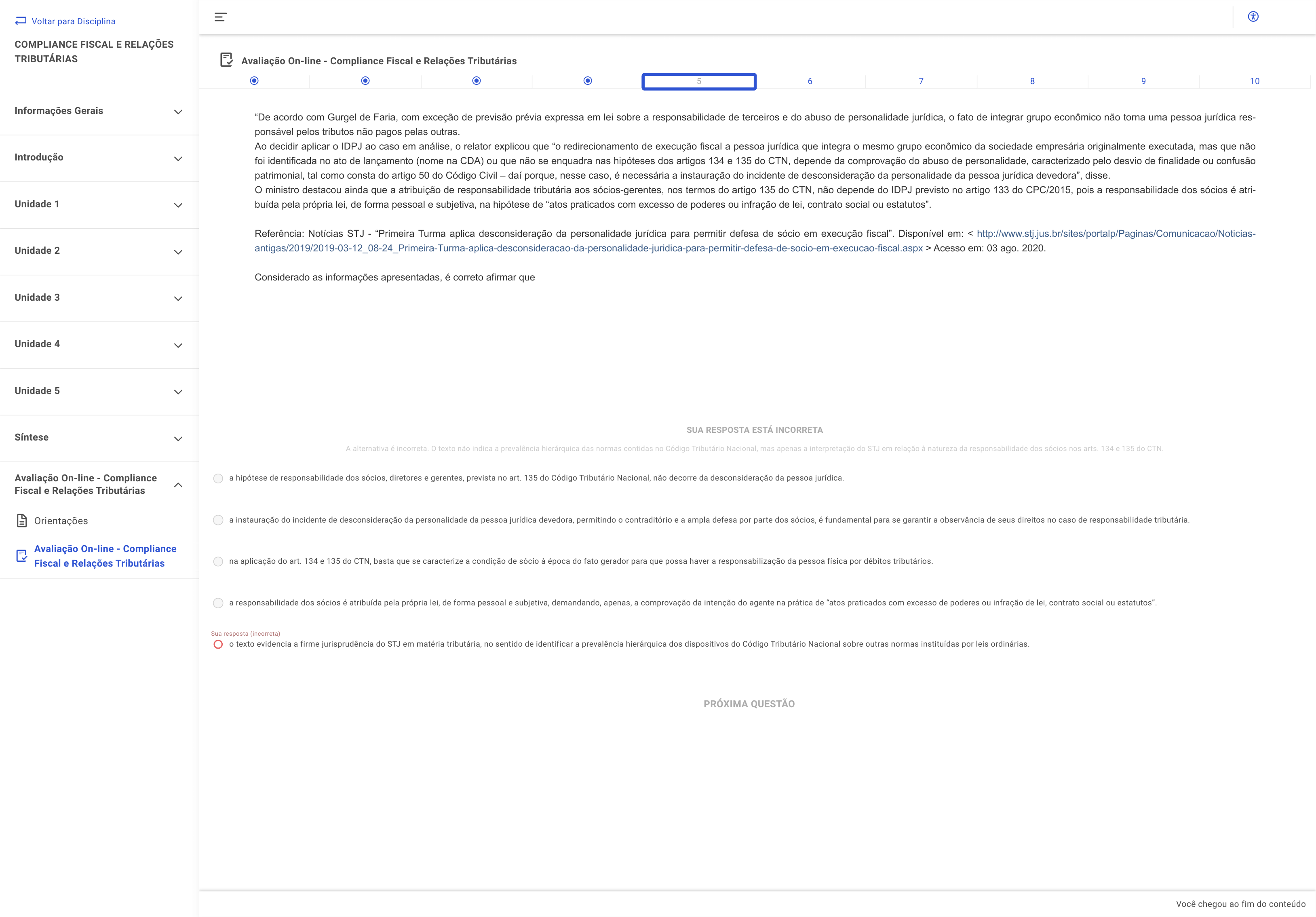 15/01/2024, 18:14 Anhembi Morumbi DL https://student.ulife.com.br/ContentPlayer/Index?cd=%2bhrLQmdbsQvLb6MnzTa6Bw%3d%3d&l=lfLTUpFHKbrkOqpJly%2bvyw%3d%3d&lc=SAD92WdepJqdCGm39qAKLg%3d%3d 1/1 Avaliação On-line - Compliance Fiscal e Relações Tributárias “De acordo com Gurgel de Faria, com exceção de previsão prévia expressa em lei sobre a responsabilidade de terceiros e do abuso de personalidade jurídica, o fato de integrar grupo econômico não torna uma pessoa jurídica res- ponsável pelos tributos não pagos pelas outras. Ao decidir aplicar o IDPJ ao caso em análise, o relator explicou que “o redirecionamento de execução fiscal a pessoa jurídica que integra o mesmo grupo econômico da sociedade empresária originalmente executada, mas que não foi identificada no ato de lançamento (nome na CDA) ou que não se enquadra nas hipóteses dos artigos 134 e 135 do CTN, depende da comprovação do abuso de personalidade, caracterizado pelo desvio de finalidade ou confusão patrimonial, tal como consta do artigo 50 do Código Civil – daí porque, nesse caso, é necessária a instauração do incidente de desconsideração da personalidade da pessoa jurídica devedora”, disse. O ministro destacou ainda que a atribuição de responsabilidade tributária aos sócios-gerentes, nos termos do artigo 135 do CTN, não depende do IDPJ previsto no artigo 133 do CPC/2015, pois a responsabilidade dos sócios é atri- buída pela própria lei, de forma pessoal e subjetiva, na hipótese de “atos praticados com excesso de poderes ou infração de lei, contrato social ou estatutos”. Referência: Notícias STJ - “Primeira Turma aplica desconsideração da personalidade jurídica para permitir defesa de sócio em execução fiscal”. Disponível em: < http://www.stj.jus.br/sites/portalp/Paginas/Comunicacao/Noticias- antigas/2019/2019-03-12_08-24_Primeira-Turma-aplica-desconsideracao-da-personalidade-juridica-para-permitir-defesa-de-socio-em-execucao-fiscal.aspx > Acesso em: 03 ago. 2020. Considerado as informações apresentadas, é correto afirmar que SUA RESPOSTA ESTÁ INCORRETA A alternativa é incorreta. O texto não indica a prevalência hierárquica das normas contidas no Código Tributário Nacional, mas apenas a interpretação do STJ em relação à natureza da responsabilidade dos sócios nos arts. 134 e 135 do CTN. a hipótese de responsabilidade dos sócios, diretores e gerentes, prevista no art. 135 do Código Tributário Nacional, não decorre da desconsideração da pessoa jurídica. a instauração do incidente de desconsideração da personalidade da pessoa jurídica devedora, permitindo o contraditório e a ampla defesa por parte dos sócios, é fundamental para se garantir a observância de seus direitos no caso de responsabilidade tributária. na aplicação do art. 134 e 135 do CTN, basta que se caracterize a condição de sócio à época do fato gerador para que possa haver a responsabilização da pessoa física por débitos tributários. a responsabilidade dos sócios é atribuída pela própria lei, de forma pessoal e subjetiva, demandando, apenas, a comprovação da intenção do agente na prática de “atos praticados com excesso de poderes ou infração de lei, contrato social ou estatutos”. o texto evidencia a firme jurisprudência do STJ em matéria tributária, no sentido de identificar a prevalência hierárquica dos dispositivos do Código Tributário Nacional sobre outras normas instituídas por leis ordinárias. Sua resposta (incorreta) PRÓXIMA QUESTÃO Você chegou ao fim do conteúdo 5 6 7 8 9 10 Voltar para Disciplina COMPLIANCE FISCAL E RELAÇÕES TRIBUTÁRIAS Informações Gerais Introdução Unidade 1 Unidade 2 Unidade 3 Unidade 4 Unidade 5 Síntese Avaliação On-line - Compliance Fiscal e Relações Tributárias Orientações Avaliação On-line - Compliance Fiscal e Relações Tributárias http://www.stj.jus.br/sites/portalp/Paginas/Comunicacao/Noticias-antigas/2019/2019-03-12_08-24_Primeira-Turma-aplica-desconsideracao-da-personalidade-juridica-para-permitir-defesa-de-socio-em-execucao-fiscal.aspx http://www.stj.jus.br/sites/portalp/Paginas/Comunicacao/Noticias-antigas/2019/2019-03-12_08-24_Primeira-Turma-aplica-desconsideracao-da-personalidade-juridica-para-permitir-defesa-de-socio-em-execucao-fiscal.aspx https://student.ulife.com.br/Lesson/index?cd=%2bhrLQmdbsQvLb6MnzTa6Bw%3d%3d#pageIndex=1 iabbr Realce iabbr Realce