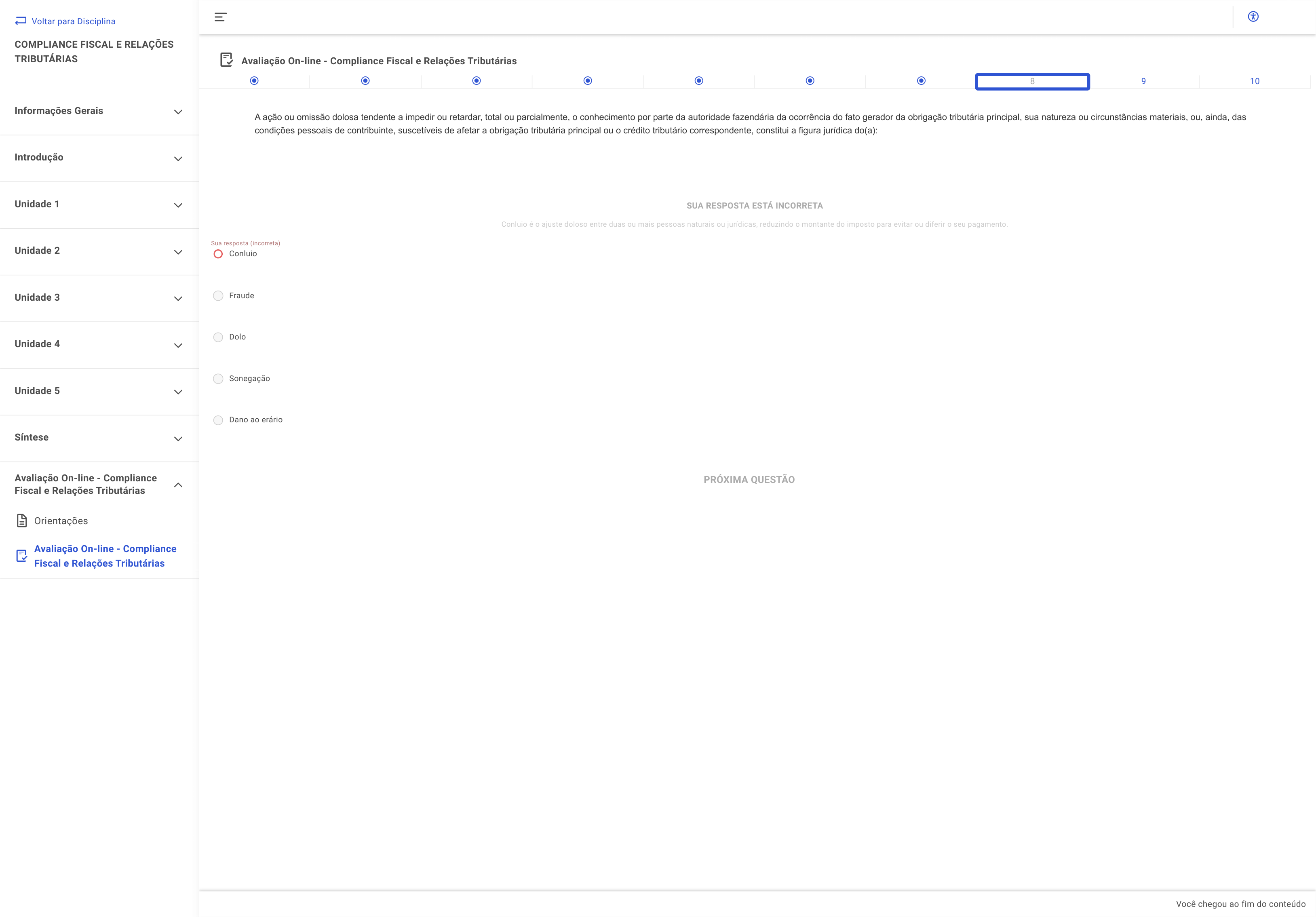 15/01/2024, 18:21 Anhembi Morumbi DL https://student.ulife.com.br/ContentPlayer/Index?cd=%2bhrLQmdbsQvLb6MnzTa6Bw%3d%3d&l=lfLTUpFHKbrkOqpJly%2bvyw%3d%3d&lc=SAD92WdepJqdCGm39qAKLg%3d%3d 1/1 Avaliação On-line - Compliance Fiscal e Relações Tributárias A ação ou omissão dolosa tendente a impedir ou retardar, total ou parcialmente, o conhecimento por parte da autoridade fazendária da ocorrência do fato gerador da obrigação tributária principal, sua natureza ou circunstâncias materiais, ou, ainda, das condições pessoais de contribuinte, suscetíveis de afetar a obrigação tributária principal ou o crédito tributário correspondente, constitui a figura jurídica do(a): SUA RESPOSTA ESTÁ INCORRETA Conluio é o ajuste doloso entre duas ou mais pessoas naturais ou jurídicas, reduzindo o montante do imposto para evitar ou diferir o seu pagamento. Conluio Sua resposta (incorreta) Fraude Dolo Sonegação Dano ao erário PRÓXIMA QUESTÃO Você chegou ao fim do conteúdo 8 9 10 Voltar para Disciplina COMPLIANCE FISCAL E RELAÇÕES TRIBUTÁRIAS Informações Gerais Introdução Unidade 1 Unidade 2 Unidade 3 Unidade 4 Unidade 5 Síntese Avaliação On-line - Compliance Fiscal e Relações Tributárias Orientações Avaliação On-line - Compliance Fiscal e Relações Tributárias https://student.ulife.com.br/Lesson/index?cd=%2bhrLQmdbsQvLb6MnzTa6Bw%3d%3d#pageIndex=1