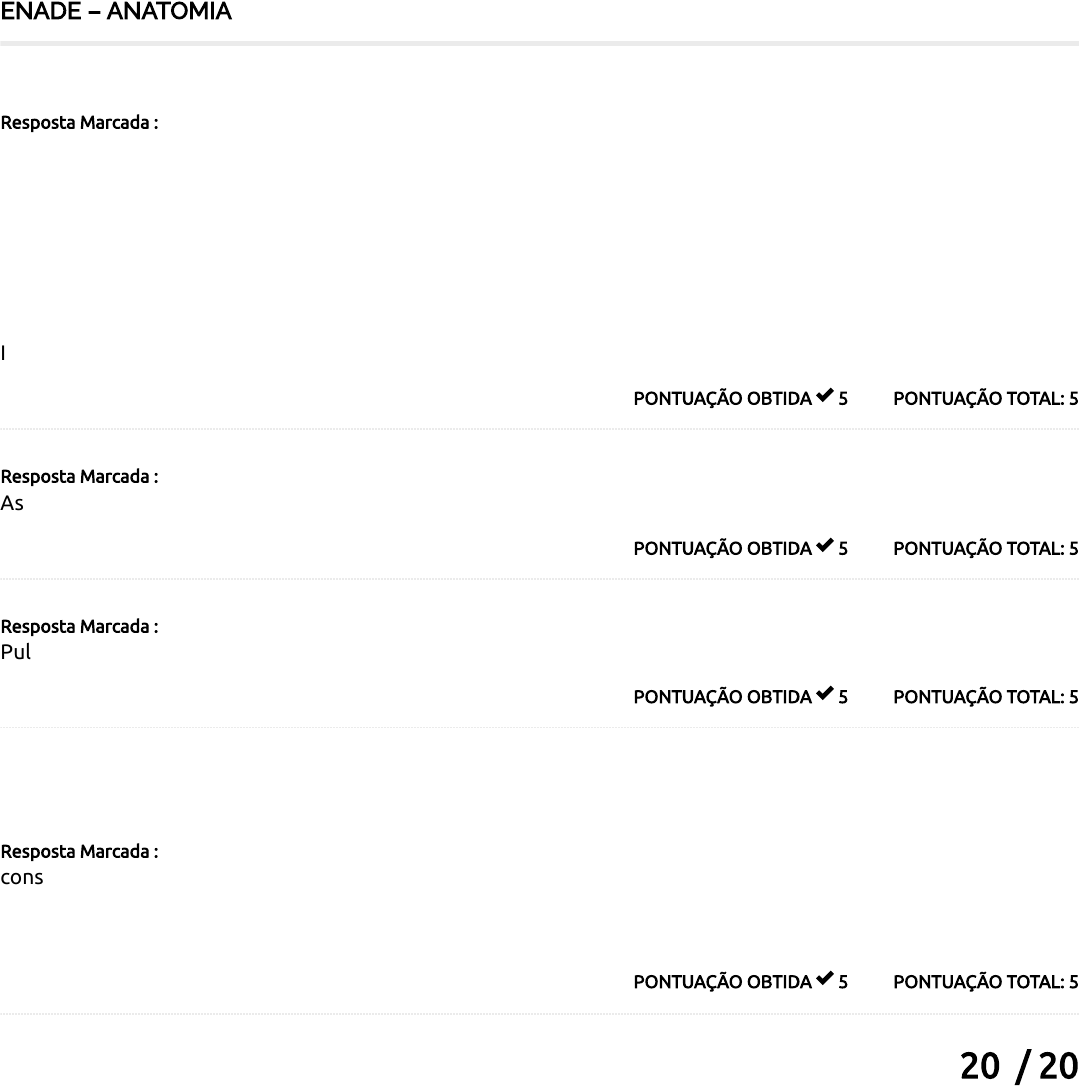 17/01/24, 14:08 Course Status – AVA Saúde Unifaveni https://ava.saude.unifaveni.com.br/course-status/ 1/1 20 / 20 ENADE – ANATOMIA EM RELAÇÃO À ANATOMIA E À FISIOLOGIA DO CORPO HUMANO, ANALISE AS AFIRMATIVAS. I – O SISTEMA NERVOSO É COMPOSTO POR DOIS TIPOS DE CÉLULAS: OS NEURÔNIOS E OS SARTÓRIOS. II – AS FUNÇÕES DA PELE INCLUEM, DENTRE OUTRAS, A PROMOÇÃO DO INÍCIO DA SÍNTESE DE VITAMINA D E O AUXÍLIO NAS RESPOSTAS IMUNOLÓGICAS. III – OS TESTÍCULOS SÃO GÔNADAS MASCULINAS QUE PRODUZEM O ESTROGÊNIO E A PROGESTERONA, HORMÔNIOS SEXUAIS QUE REGULAM A PRODUÇÃO DE ESPERMATOZOIDES. IV – A ABERTURA SUPERIOR DO ESTÔMAGO É CHAMADA DE CARINA. V – OS OSSOS ARMAZENAM MINERAIS COMO O CÁLCIO E O FÓSFORO QUE SÃO LIBERADOS NA CORRENTE SANGUÍNEA CONFORME A NECESSIDADE DO ORGANISMO. ESTÃO CORRETAS APENAS AS AFIRMATIVAS: PONTUAÇÃO TOTAL: 5PONTUAÇÃO OBTIDA 5 Resposta Marcada : II e V. QUAL DAS SEGUINTES AFIRMAÇÕES SOBRE OS VASOS SANGUÍNEOS É VERDADEIRA? PONTUAÇÃO TOTAL: 5PONTUAÇÃO OBTIDA 5 Resposta Marcada : As paredes arteriais são geralmente mais espessas do que as paredes das veias. A PLEURA VISCERAL REVESTE: PONTUAÇÃO TOTAL: 5PONTUAÇÃO OBTIDA 5 Resposta Marcada : Pulmão. “A PARTIR DE 1970, A MIGRAÇÃO PARA A AMAZÔNIA OCIDENTAL PASSOU A SER FORTEMENTE ORIENTADA PELO GOVERNO FEDERAL, ACRESCIDA POR PEQUENOS E MÉDIOS PRODUTORES E INVESTIDORES DO SUL DO PAÍS QUE SE DIRIGIAM PARA RONDÔNIA E MATO GROSSO.” BECKER, BERTHA. AMAZÔNIA. SÉRIE PRINCÍPIOS. SÃO PAULO: ÁTICA, 1990. SOBRE A CONSOLIDAÇÃO DO PROCESSO MIGRATÓRIO NA REGIÃO, PODE-SE AFIRMAR QUE ELE: PONTUAÇÃO TOTAL: 5PONTUAÇÃO OBTIDA 5 Resposta Marcada : constituiu condição não só de povoamento como também da formação da força de trabalho, tornando-se estratégia de ocupação adotada pelo Estado. Total de Pontos