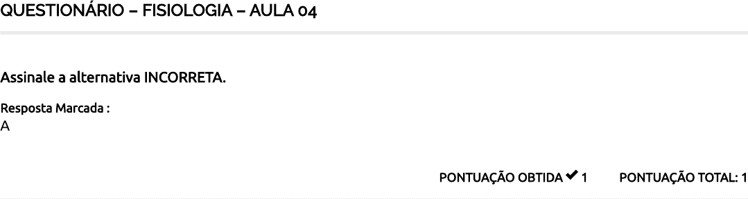 17/01/24, 16:40 Course Status – AVA Saúde Unifaveni https://ava.saude.unifaveni.com.br/course-status/ 1/5 QUESTIONÁRIO – FISIOLOGIA – AULA 04 PONTUAÇÃO TOTAL: 1PONTUAÇÃO OBTIDA 1 Assinale a alternativa INCORRETA. Resposta Marcada : A difusão facilitada utiliza proteínas carreadoras para o transporte através de membrana, constituindo, por essa razão, um processo de transporte ativo. 17/01/24, 16:40 Course Status – AVA Saúde Unifaveni https://ava.saude.unifaveni.com.br/course-status/ 2/5 Dentre os vários mecanismos de transporte em nível de membrana celular, podemos citar a osmose. De maneira simpli�cada, a �gura esquematiza as condições para a ocorrência da osmose. Com relação a esse processo, marque a alternativa correta: 17/01/24, 16:40 Course Status – AVA Saúde Unifaveni https://ava.saude.unifaveni.com.br/course-status/ 3/5 PONTUAÇÃO TOTAL: 1PONTUAÇÃO OBTIDA 1 Resposta Marcada : Passagem de solvente do meio menos concentrado para o meio mais concentrado. 17/01/24, 16:40 Course Status – AVA Saúde Unifaveni https://ava.saude.unifaveni.com.br/course-status/ 4/5 A proteína descrita assinalada na �gura faz parte do sistema de transporte de substância através da membrana sem gasto de energia. Assinale a alternativa que representa esse transporte: 17/01/24, 16:40 Course Status – AVA Saúde Unifaveni https://ava.saude.unifaveni.com.br/course-status/ 5/5 4 / 5 PONTUAÇÃO TOTAL: 1PONTUAÇÃO OBTIDA 1 Resposta Marcada : Difusão facilitada. PONTUAÇÃO TOTAL: 1PONTUAÇÃO OBTIDA 0 Um cotransportador é uma proteína que move mais de uma molécula simultaneamente. Se as moléculas são movidas na mesma direção, os cotransportadores são chamados de carreadores de ___________ . Resposta Marcada : Biporte. PONTUAÇÃO TOTAL: 1PONTUAÇÃO OBTIDA 1 A água é considerada o principal solvente do nosso organismo. Geralmente, ela se move de um meio a outro por osmose. Se ela passar de um meio a outro por osmose, ela irá se mover do compartimento ________ concentrado para o compartimento _________ concentrado. Esse processo será ___________ gasto de energia. Resposta Marcada : Menos / mais / sem. Total de Pontos