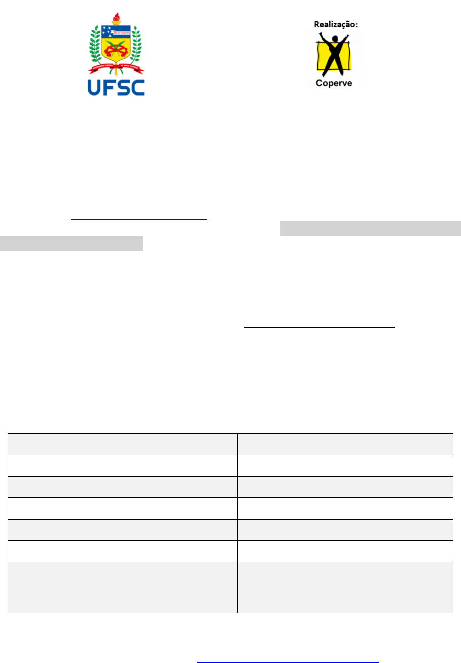 EDITAL Nº 15/2023/COPERVE A Coordenadora de Logística da Comissão Permanente do Vestibular – Coperve da Universidade Federal de Santa Catarina – UFSC, no uso de suas atribuições e considerando o que consta no Edital nº 11/2023/COPERVE, de 29 de agosto de 2023, declara que estará aberto no período de 2 a 25 de outubro de 2023 a inscrição de SERVIDORES DOCENTES E TÉCNICO- ADMINISTRATIVOS DA UFSC, visando à seleção de colaboradores para compor as equipes de coordenação de ala e de fiscalização que atuarão no Vestibular Unificado UFSC/IFSC/IFC 2024. 1. DA VALIDADE 1.1. O cadastramento de que trata este Edital será válido apenas para atuar no referido Vestibular, cujas provas ocorrerão nos dias 9 e 10 de dezembro de 2023, nos setores localizados nos campi da UFSC em Florianópolis, Araranguá, Blumenau, Curitibanos e Joinville. 2. DO PROCESSO DE INSCRIÇÃO 2.1. A inscrição no processo seletivo será gratuita e poderá ser feita somente via internet. 2.2. O processo seletivo cumprirá o seguinte cronograma: Início das inscrições 02 de outubro de 2023 (segunda-feira) Último dia das inscrições 25 de outubro de 2023 (quarta-feira) Resultado da primeira chamada 07 de novembro de 2023 (terça-feira) Período para confirmação OBRIGATÓRIA 07 e 08 de novembro de 2023 Resultado da segunda chamada 13 de novembro de 2023 (segunda-feira) Período para confirmação OBRIGATÓRIA 13, 14 e 15 de novembro de 2023 Reunião presencial de capacitação OBRIGATÓRIA (somente para os servidores que irão atuar em Florianópolis) As reuniões serão realizadas nos dias 27 e 28 de novembro de 2023 (segunda e terça-feira) 2.3. Para se inscrever, o candidato deverá proceder da seguinte maneira: a) acessar o site oficial da Coperve www.coperve.ufsc.br/colaboradores no período de 2 a 25 de outubro de 2023, preencher integralmente o cadastro e enviá-lo (clicando no botão “Enviar”) até as 23h59 do dia 25 de outubro de 2023; b) imprimir ou salvar o comprovante do cadastro. 2.3.1. As informações prestadas no cadastro são de total responsabilidade do servidor. 2.4. O servidor que não proceder rigorosamente de acordo com o estabelecido no item 2.3 deste Edital não terá sua inscrição efetivada. https://vestibularunificado2024.ufsc.br/files/2023/08/Edital-Vestibular-2024.pdf http://www.coperve.ufsc.br/colaboradores 2 2.5. A Coperve não se responsabilizará por solicitações de inscrição não efetivadas por falhas de comunicação, congestionamento de linhas de comunicação ou outros fatores de ordem técnica que impossibilitem a transferência dos dados ou a impressão dos documentos referidos no item 2.3 deste Edital. 2.6. A inscrição somente será efetivada após o envio do cadastro preenchido. 2.7. Poderão inscrever-se no processo seletivo servidores docentes e técnico-administrativos integrantes do quadro funcional da UFSC e do Hospital Universitário Polydoro Ernani de São Thiago – HU. 2.8. O servidor deverá, no momento da inscrição, indicar o campus da UFSC (Araranguá, Blumenau, Curitibanos, Joinville ou Florianópolis) onde tem interesse em atuar. 2.8.1. Caso o servidor opte por atuar em um campus da UFSC (cidade) diferente do seu campus de lotação, o deslocamento é de sua inteira responsabilidade. A Coperve não irá fornecer transporte ou ajuda de custo para o deslocamento. 2.9. A inscrição do candidato implicará ciência e tácita aceitação das condições estabelecidas no inteiro teor deste Edital, das quais não poderá alegar desconhecimento. 3. DOS REQUISITOS 3.1. Para realizar o cadastramento como DOCENTE, o servidor deve: a) ser docente na ativa, ou seja, não estar aposentado; b) ser docente do quadro efetivo, ou seja, não ser substituto; c) não estar atuando na UFSC cedido por outra instituição; d) não estar no gozo de férias ou de qualquer tipo de licença que implique em afastamento do trabalho, incluindo atestados médicos, no período de realização das provas, dias 9 e 10 de dezembro de 2023; e) dispor de no mínimo 15 horas de carga horária de Gratificação por Encargos de Curso e Concurso – GECC. 3.2. Para realizar o cadastramento como TÉCNICO-ADMINISTRATIVO, o servidor deve: a) ser técnico-administrativo na ativa, ou seja, não estar aposentado; b) possuir como nível de escolaridade mínima o Ensino Médio (2º grau ou equivalente); c) não estar atuando na UFSC cedido por outra instituição; d) não estar no gozo de férias ou de qualquer tipo de licença que implique em afastamento do trabalho, incluindo atestados médicos, no período de realização das provas, dias 9 e 10 de dezembro de 2023; e) dispor de no mínimo 15 horas de carga horária de Gratificação por Encargos de Curso e Concurso – GECC. 3.3. Todas as informações sobre a GECC estão disponíveis no site https://prodegesp.ufsc.br/gecc/ e a consulta das horas disponíveis é de inteira responsabilidade do servidor. 3.3.1. A Coperve efetua os pagamentos dos servidores da UFSC única e exclusivamente através da GECC, por esse motivo caso o servidor não possua as horas disponíveis, o pagamento não será realizado. https://prodegesp.ufsc.br/gecc/ 3 4. DAS VAGAS E FUNÇÕES 4.1. O número total de vagas a ser preenchido nesse processo dependerá da necessidade de colaboradores visando à aplicação das referidas provas nos setores, não podendo, portanto, ser estabelecido a priori. 4.2. As atividades a serem desenvolvidas pelos colaboradores compreenderão as seguintes funções: coordenação de ala, fiscalização de grupo, corredor e detector de metais. 5. DA REMUNERAÇÃO E HORÁRIOS DE ATUAÇÃO 5.1. A remuneração dos colaboradores selecionados, quando forem servidores UFSC, será incluída na folha de pagamento de janeiro (que é paga em fevereiro), de acordo com a função desempenhada. 5.2. A remuneração dos colaboradores selecionados, quando forem servidores do HU, será depositada na conta bancária em que o servidor recebe o