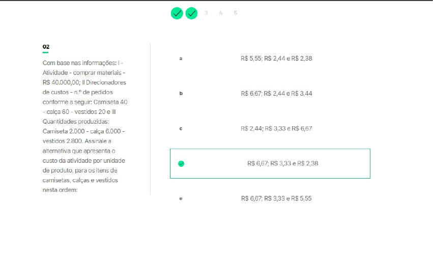 Gestão de custos; Método de custeio por atividades (ABC); Questão 2