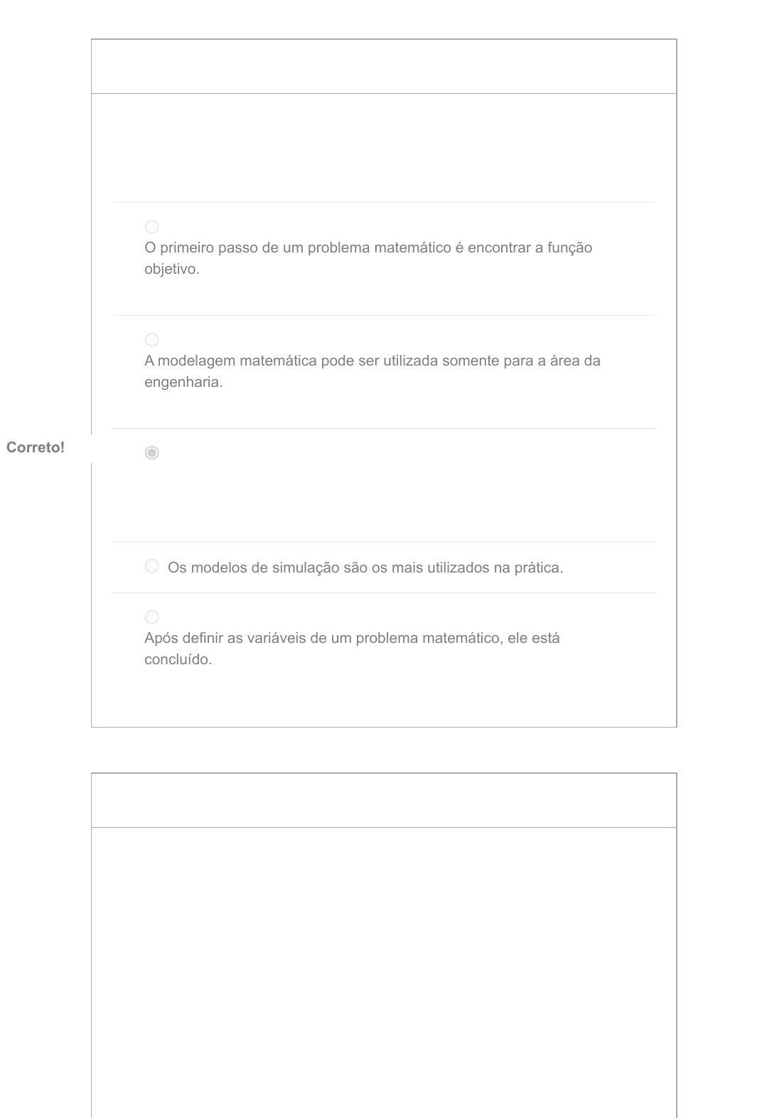 Esta tentativa levou Menos de 1 minuto. 0,1 / 0,1 ptsPergunta 1 Com relação às técnicas de modelagem matemática, assinale a alternativa correta. O primeiro passo de um problema matemático é encontrar a função objetivo. A modelagem matemática pode ser utilizada somente para a área da engenharia. O modelo matemático é uma representação simplificada (abstração) do problema real. Correto!Correto! Os modelos de simulação são os mais utilizados na prática. Após definir as variáveis de um problema matemático, ele está concluído. 0,1 / 0,1 ptsPergunta 2 Os modelos matemáticos ajudam no processo decisório das organizações, e são classificados segundo a natureza de sua contribuição para o processo decisório. Quanto aos modelos observe as afirmações abaixo. I. Modelo preditivo visa responder perguntas a exemplo de qual é a melhor coisa que pode ocorrer em relação a variáveis independentes X e dependente Y. II. Modelos descritivos produzem cenários futuros cuja possibilidade de concretização é determinada a partir de probabilidades subjetivas, aonde se tem incerteza sobre os valores futuros das variáveis independentes. III. Modelo prescritivo são baseados em todos os métodos estatísticos que formam os módulos analíticos de softwares de amplo uso pelas empresas. Quanto as afirmações podemos concluir que: Somente I e II estão corretos. Correto!Correto! Todas estão corretas. Somente II está correto. Somente I e III são verdadeiros. Somente II e III são verdadeiros. 0,1 / 0,1 ptsPergunta 3 Considerando dois tipos de erros de medição: o erro sistemático e o erro aleatório. Com base nos conhecimentos adquiridos, o conceito de erro aleatório está corretamente definido em: Estimativa do erro sistemático. Erro previsível ou parcela previsível do erro. Erro imprevisível ou parcela imprevisível do erro. Correto!Correto! Constante aditiva que, quando somada à indicação, compensa o erro sistemático de um sistema de medição. O resultado de uma medição menos o valor verdadeiro do mensurando. 0,1 / 0,1 ptsPergunta 4 Conhecendo a definição metrológica de erro e tendência, imagine que você trabalha no setor de metrologia e que, em um dos processos de medição realizados, o padrão possui a medida de 20 mm. Considerando que você mediu repetidas vezes com um paquímetro encontrando um resultado médio de 19,96 mm, qual é a tendência do instrumento e qual é a correção que deve ser aplicada? Tendência de +0,04 mm e correção de -0,04 mm. Tendência de -0,04 mm e correção de +0,04 mm. Correto!Correto! Tendência de +0,04 mm e correção de +0,04 mm. Tendência de -0,04 mm e correção de -0,04 mm. Tendência de 4 mm e correção de 8 mm. Pontuação do teste: 0,4 de 0,4