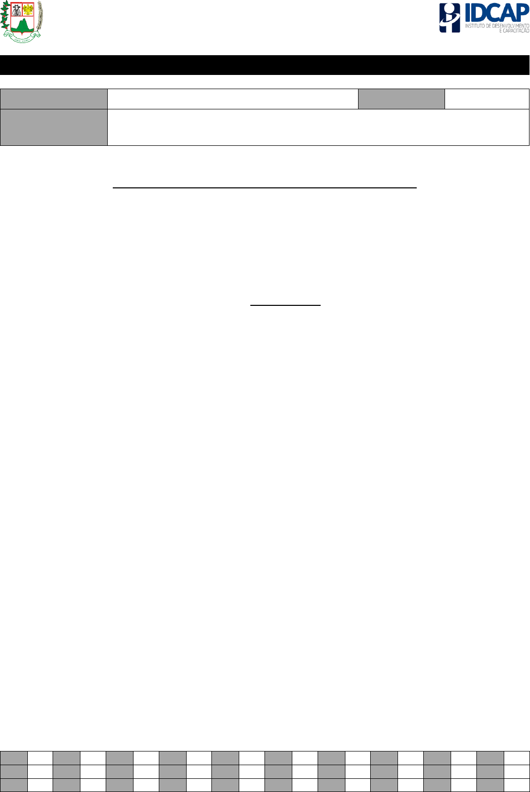 PREFEITURA MUNICIPAL DE ÁGUIA BRANCA/ES PROCESSO SELETIVO – 001/2018 - EDUCAÇÃO PROFESSOR – PROJETO LEITURA - PA Nome do Candidato: Nº de Inscrição: Assinatura: LEIA COM ATENÇÃO AS INSTRUÇÕES ABAIXO: 1. É proibido folhear o caderno de provas antes da autorização do fiscal. 2. Confira se este caderno de provas corresponde ao cargo (cabeçalho desta página) para o qual você se candidatou. 3. Confira os dados impressos no cartão resposta. Quaisquer problemas deverão ser comunicados ao fiscal de sala, para registro em ata. 4. Assine o cartão de respostas. 5. Verifique se este caderno de prova contém 30 questões. Não serão consideradas reclamações posteriores ao término da prova. 6. Cada questão da prova objetiva constitui-se de cinco alternativas, identificadas pelas letras A, B, C, D e E, das quais apenas uma será a resposta correta. 7. Preencha primeiramente o rascunho do cartão de respostas da prova objetiva, que se encontra no final desta página; em seguida, passe-o a limpo, com caneta esferográfica azul ou preta. Qualquer outra cor de tinta no cartão de respostas não será aceita pela leitora ótica. 8. Preencha o cartão de respostas da prova objetiva completando totalmente a opção, ao lado dos números, que corresponde à resposta correta. 9. Serão consideradas incorretas questões para as quais o candidato tenha preenchido mais de uma opção no cartão de respostas, bem como questões cuja opção apresente rasuras no cartão de respostas. 10. O cartão resposta não será substituído em hipótese alguma; portanto, evite rasuras. 11. Em sala, a comunicação entre os candidatos não será permitida, sob qualquer forma ou alegação. 12. Não será permitido o uso de calculadoras, dicionários, telefones celulares, pen drive ou de qualquer outro recurso didático, elétrico ou eletrônico, nem o uso de qualquer acessório que cubra as orelhas do candidato. 13. A prova objetiva terá duração máxima de 3h, incluído o tempo para preenchimento do cartão de respostas. 14. O candidato somente poderá retirar-se do local de prova após 1 (uma) hora de seu início e poderá levar o caderno de provas após 2 (duas) horas de seu início. 15. Os (3) três últimos candidatos somente poderão retirar-se da sala de prova simultaneamente e devem fazê-lo após a assinatura da ata de sala. 16. As saídas para: banheiro, tomar medicamento e água, só serão permitidas acompanhadas por um fiscal. 17. Os fiscais NÃO estão autorizados a prestar informações de interpretação das questões. Sua função é apenas fiscalizar e orientar quanto ao funcionamento do certame. 18. Ao concluir a prova, entregue ao fiscal de sala o cartão de respostas. Boa prova! 01 02 03 04 05 06 07 08 09 10 11 12 13 14 15 16 17 18 19 20 21 22 23 24 25 26 27 28 29 30 PREFEITURA MUNICIPAL DE ÁGUIA BRANCA/ES PROCESSO SELETIVO – 001/2018 - EDUCAÇÃO RASCUNHO PREFEITURA MUNICIPAL DE ÁGUIA BRANCA/ES PROCESSO SELETIVO – 001/2018 - EDUCAÇÃO LÍNGUA PORTUGUESA INSTRUÇÕES: As questões de 1 a 4 dizem respeito ao TEXTO 1. Leia-o atentamente antes de respondê-las. TEXTO 1 01. “Normalmente não dispensamos a esses fiéis escudeiros a atenção que merecem.” (linhas 1 e 2). Assinale o tempo e o modo verbal nos quais se encontra o verbo destacado: a) Presente do Indicativo PREFEITURA MUNICIPAL DE ÁGUIA BRANCA/ES PROCESSO SELETIVO – 001/2018 - EDUCAÇÃO b) Presente do Subjuntivo c) Pretérito Imperfeito do Subjuntivo d) Pretérito Perfeito do Indicativo e) Futuro do Presente do Indicativo 02. Assinale a alternativa em que a palavra retirada do Texto 1 é acentuada pela seguinte razão: Assinalam-se as palavras paroxítonas terminadas em ditongo, seguidas ou não de “s”. a) “está” (linha 6) b) “décadas” (linha 7) c) “diabéticos” (linha 8) d) “negligência” (linha 8) e) “precauções” (linha 12) 03. “...quando não os castigamos com excesso de peso e sapatos que são verdadeiros instrumentos de tortura.” (linhas 3 a 5). A correta divisão silábica da palavra destacada é: a) Ex-ces-so b) E-xces-so c) Ex-cess-o d) E-xcess-o e) Ex-ce-sso 04. “E aprenda a tratá-los com mais carinho, porque são fundamentais para nos manter ativos.” (linhas 16 a 18). É correto afirmar que o termo destacado exerce função morfológica de: a) Advérbio b) Adjetivo c) Substantivo d) Adjunto Adverbial e) Adjunto Adnominal 05. “Até agora não sabemos se eles virão ou não.”. É correto afirmar que a partícula “se”, no contexto em que está inserido, exerce função morfológica de: a) Conjunção subordinativa integrante b) Conjunção subordinativa causal c) Conjunção subordinativa conformativa d) Pronome reflexivo e) Pronome apassivador PREFEITURA MUNICIPAL DE ÁGUIA BRANCA/ES PROCESSO SELETIVO – 001/2018 - EDUCAÇÃO 06. Em relação à concordância verbal e nominal, assinale a alternativa incorreta: a) Com a expressão “Mais de um” o verbo deverá ficar no singular. b) Quando o sujeito é um “pronome de tratamento”, o verbo concordará obrigatoriamente na terceira pessoa. c) Quando o sujeito é um “pronome de tratamento”, o verbo concordará obrigatoriamente na terceira pessoa. d) Quando um único adjetivo, na função de adjunto adnominal, refere-se a mais de um substantivo, se o adjetivo vier anteposto, concordará obrigatoriamente com o substantivo mais próximo. e) Quando o substantivo vem acompanhado de numerais ordinais, desde que os numerais venham acompanhados de artigo, ele poderá ficar somente no singular. 07. “Ocorre quando se deseja pôr em relevo a informação contida no objeto direto. Para tanto, coloca-se o objeto direto no início da frase para depois retomá-lo — repeti-lo — com um pronome oblíquo.”. Trata-se do: a) Objeto direto pleonástico b) Objeto direto c) Objeto indireto d) Objeto direto e indireto e) Vocativo 08. “O fumo é prejudicial à saúde.”. É correto afirmar que os termos destacados