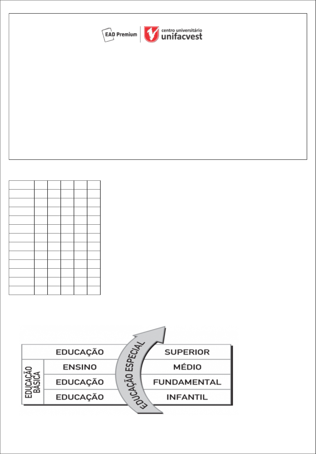 Prova presencial regular Curso: 48 MESES - LICENCIATURA HISTÓRIA - UNIFACVEST EAD Módulo: Grupo: Município: Disciplina(s): 101227 - FUNDAMENTOS DA EDUCAÇÃO ESPECIAL E INCLUSIVA Nome: Data: ___/___/_________ Hora:___|___|___ Assinatura do aluno: ________________________________________________________ Preencha o gabarito abaixo com X na coluna correta. Atente para a coluna de numeração e das alternativas. Questões A B C D E 1 2 3 4 5 6 7 8 9 10 11 12 1 ) Observe o quadro abaixo que ilustra e indica como a educação especial deve ser ofertada. Marque quais afirmativas são verdadeiras (V) e quais são falsas (F) e em seguida assinale a alternativa correta. x x x x x x x x x x x x ( ) A educação especial deve ser ofertada à parte do sistema educacional brasileiro, independente dos níveis de educação e ensino. ( ) A educação especial deve ser ofertada como parte integrante do sistema educacional brasileiro, em todos os níveis de educação e ensino. ( ) A educação especial deve ser ofertada como parte integrante dos níveis de ensino da Educação Básica. ( ) A educação especial deve ser ofertada em curva ascendente desde o nascimento até após o ensino superior. ( ) A educação especial deve ser ofertada integrada e articulada a todos os níveis de educação e ensino, da educação infantil ao ensino superior. A ) V, F, V, V, F. B ) V, F, F, F, V. C ) V, V, F, F, F. D ) F, V, F, F, V. E ) F, V, V, V, F. 2 ) Leia as afirmativas abaixo sobre a Libras e assinale com V para verdadeiro ou F para falso. ( ) Libras significa linguagem brasileira de sinais. ( ) Libras significa língua brasileira de sinais. ( ) Libras é a língua materna do surdo brasileiro. ( ) O Português é a única língua materna de todos os brasileiros, ouvintes ou surdos. ( ) Cada palavra possui um sinal próprio em Libras. ( ) Libras é uma ferramenta de inclusão social para as pessoas surdas. A ) V, V, V, F, V, F. B ) F, V, F, F, V, F. C ) V, V, V, F, V, V. D ) F, V, V, F, V, V. E ) V, F, F, V, V, V. 3 ) Relacione cada transtorno de aprendizagem a seguir à definição correspondente. 1. Dislexia 2. Disgrafia 3. Discalculia 4. TDAH ( ) Dificuldade em controlar emoções. ( ) Dificuldade para identificar/ler as letras. ( ) Confunde a sonoridade das letras ao escrever as palavras. ( ) Entre realizar a contagem e registrar no caderno pode se esquecer. Assinale a alternativa que apresenta a sequência correta: A ) 1, 4, 2, 3. B ) 4, 2, 1, 3. C ) 3, 2, 4, 1. D ) 2, 3, 1, 4. E ) 4, 1, 2, 3. 4 ) A discalculia é um distúrbio específico de aprendizagem relacionado às habilidades matemáticas. Analise as alternativas abaixo e assinale a resposta que apresenta corretamente quais delas são dificuldades mais comuns geradas por esse transtorno. I. Confundir números e letras. II. Escrever números invertidos. III. Produção escrita incompreensível. IV. Inabilidade para interpretar situações problema e definir soluções. V. Compor e decompor números corretamente. A ) Estão corretas as alternativas I, IV e V, apenas. B ) Está correta a alternativa V, apenas. C ) Estão corretas as alternativas I, II, IV e V, apenas. D ) Está correta a alternativa III, apenas. E ) Estão corretas as alternativas II, III e IV, apenas. 5 ) Assinale as alternativas corretas em relação ao conceito de acessibilidade. I. Forma de organizar e conceber espaços que possibilitem o acesso de todas as pessoas. II. Possibilita às pessoas com deficiência viver de maneira independente e participar plenamente de todos os aspectos da vida. III. Afirma a necessidade de acompanhantes e cuidadores para que as pessoas com deficiência possam usufruir dos espaços públicos. IV. Possibilidade e condição de alcance, percepção e entendimento para a utilização dos espaços e equipamentos. V. Garantia de acesso com segurança e autonomia a edificações, espaços, mobiliários, equipamentos urbanos e elementos. A ) I, II, III, IV e V. B ) I, III, IV e V, apenas. C ) I, II, IV e V, apenas. II, III e IV, apenas. E ) VI e V, apenas. 6 ) A educação é um direito social de todos! A essa máxima está conectada a necessidade de repensar práticas e concepções para que todos tenham garantia efetiva de aprendizagem. Nessa perspectiva, analise as seguintes afirmativas de acordo com a LDB. A. A LDB orienta que o ensino seja planejado com vistas às características individuais. B. A LDB estabelece normas classificatórias de ensino e aprendizagem. C. A LDB entende que todos que têm seu processo de escolarização dificultado merecem atenção. D. A LDB amplia a compreensão de educação inclusiva. E. A LDB determina que a inclusão é voltada apenas às pessoas com deficiência. Estão corretas as alternativas: A ) A, C, E, apenas. B ) B, C, D, apenas. C ) B, D, E, apenas. D ) A, C, D, E, apenas. E ) A, C, D, apenas. 7 ) É correto afirmar que a Constituição de 1988 foi um marco para a garantia de muitos direitos, inclusive o acesso à educação para as pessoas com deficiência. Apesar de defender a ideia de plena integração e inclusão educacional, o texto constitucional deixa brechas para outras formas de oferta ao indicar o atendimento educacional "preferencialmente na rede regular de ensino" e não obrigatoriamente na rede regular de ensino. Na prática isso significa que: A ) estudantes com características educacionais específicas deverão obrigatoriamente ser matriculados em escolas e classes especiais, só assim terão todas as suas necessidades atendidas. B ) as escolas especiais serão gradativamente extintas e todos obrigatoriamente passarão a frequentar as escolas regulares, que deverão se adaptar para atender adequadamente a todos os estudantes. C ) estudantes com características educacionais específicas, cujas necessidades não são atendidas pelo ensino regular, têm direito a outras formas de atendimento, como escolas e classes especiais. D ) as escolas regulares são a opção preferencial, mas as própria