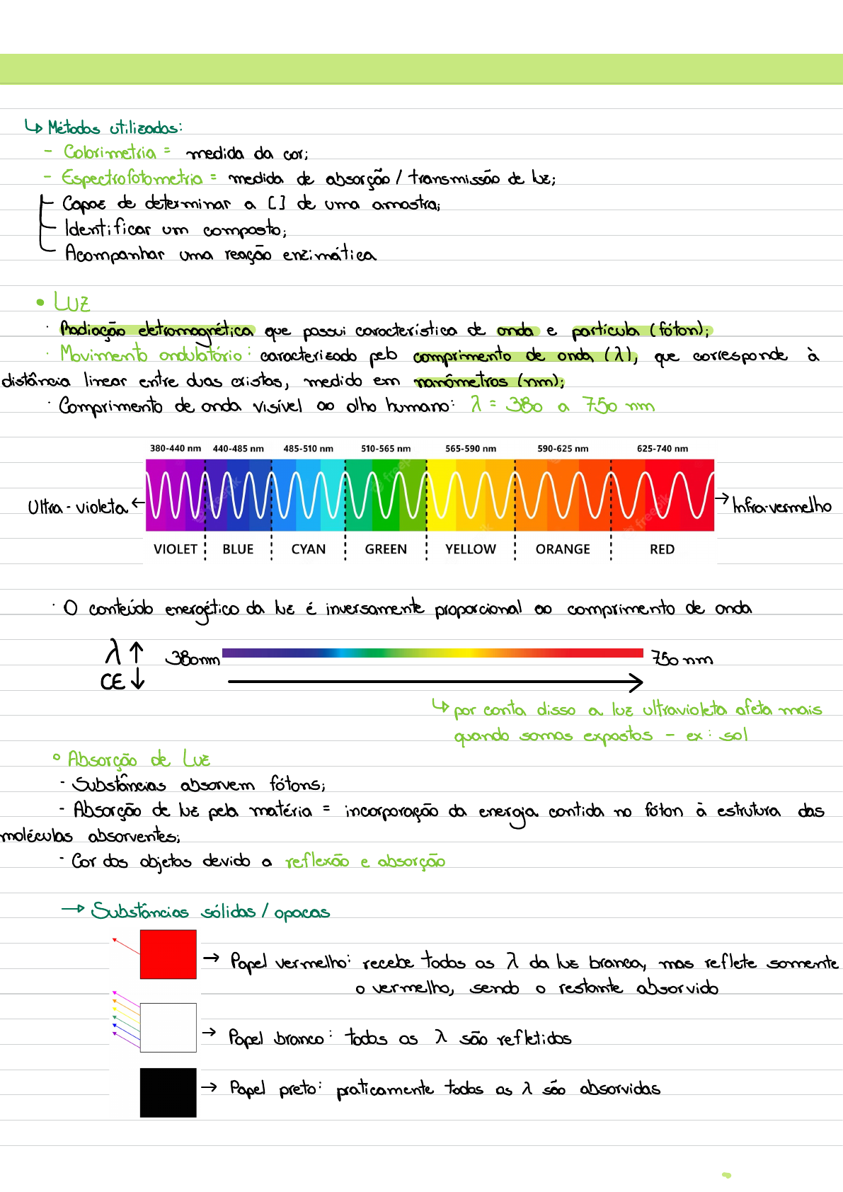 Colorimetria - Fotometria ↳ Métodos utilizados: - Colorimetria= medida da cor; - Espectrofotometria = medida de absorção transmissão de luz; ~Capez de determinar a 2) de uma amostra;LL Identificar um composto ; Acompanhar uma reação enzimática · LUZ nética que possui característica de anda e particula (fotoul :Radiação eletromag · Movimento andulatório : caracterizado pelo comprimento de onde /XI , que corresponde à distância linear entre duas cristas , medido em nanómetros (nm) ; · Comprimento de anda visível do olho humano : 7 = 380 a 750 um Ultra-violeta Infravermelho · O conteúdo energético da luz é inversamente proporcional ao comprimento de onde X 38onm 730um CE 4) por conta disso a luz ultravioleta afeta mais quando somos expostos - ex : sol · AbsorçdeLueservem fotons ; -Absorção de luz pela matéria = incorporação da energia contida no fóton à estrutura das↓ moléculas absorventes; -Cor dos objetos devido a reflexão e absorçãoS Substâncias sólidas/opacas >Papel vermelho: recebe todos os 7 da lue branca, mas reflete somente o vermelho, sendo o restante absorvido >Papel branco : todos os X são refletidos > Papel preto : praticamente todos os 1 são absorvidas -Relação de Lambert-Beer O Padrão da [] da Detecta a transmi- solução rem do laboratório tância e a absorvância ↳Ex : Aboomg/dL PADRÃO (P) Ex : T= 50% =Soomg/dL ..... 0 . 35 A = 1 , 0 ....... X = 0. 52 & tubo T= 75% p + R cor = 0 , 35 Amostra colorida A = 0, 3 A + R com = 0. 52 R = reagente A = amostra P= padrão PREPARAÇÃO DO TUBO BRANCO - Tubo branco = contém todos os reativos menos a substância a ser dosada ([] 0) & reagente + água - fundamental para o ajuste do fotocolorimetro A = 0 T = 100% - Deve ser feito antes de qualquer medida no fotocolorimetro R .C = Reagente cromogéneo + TUBO BRANCO R.C AMOSTRA + AMOSTRA R.C AMOSTRA DETERMINAÇÃO DE CONCENTRAÇÃO 3 - Utilizando um único padrão : Absorvância da amostra (2) conhecidal relaciona Absorvância da amostra ([]desconhecidal. Ca = [] da amostra Cp = [] padrão CA = AA CA = CP X AA Aa = Absorvância da amostra CP Ap Ap Ap = Absorvância do padrão -Uso de curva padrão : Corresponde à relação gráfica entre os valores de absorvancia e os de concentração : · Com base na analise gráfica é possível verificar a linearidade da reação e calcular um fator de conversão de valores de absorvância em concentração ;