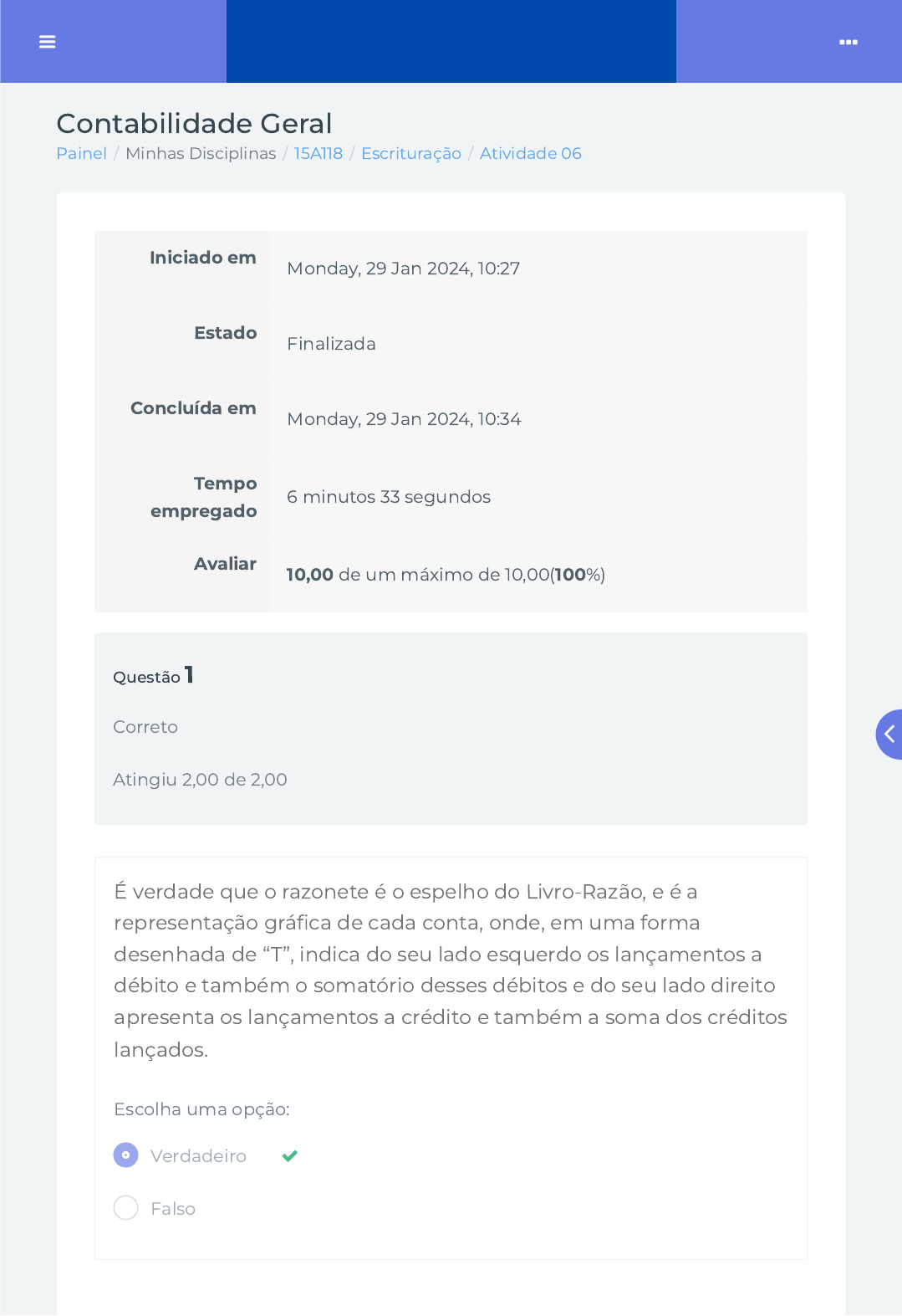 29/01/2024, 10:34 Atividade 06 https://ava.politecnicabr.com.br/mod/quiz/review.php?attempt=6245979 1/4 Painel / Minhas Disciplinas / 15A118 / Escrituração / Atividade 06 Contabilidade Geral Iniciado em Monday, 29 Jan 2024, 10:27 Estado Finalizada Concluída em Monday, 29 Jan 2024, 10:34 Tempo empregado 6 minutos 33 segundos Avaliar 10,00 de um máximo de 10,00(100%) Questão 1 Correto Atingiu 2,00 de 2,00 É verdade que o razonete é o espelho do Livro-Razão, e é a representação grá�ca de cada conta, onde, em uma forma desenhada de “T”, indica do seu lado esquerdo os lançamentos a débito e também o somatório desses débitos e do seu lado direito apresenta os lançamentos a crédito e também a soma dos créditos lançados. Escolha uma opção: Verdadeiro Falso https://ava.politecnicabr.com.br/my/ https://ava.politecnicabr.com.br/my/ https://ava.politecnicabr.com.br/course/view.php?id=877 https://ava.politecnicabr.com.br/course/view.php?id=877#section-7 https://ava.politecnicabr.com.br/mod/quiz/view.php?id=23901 https://ava.politecnicabr.com.br/ 29/01/2024, 10:34 Atividade 06 https://ava.politecnicabr.com.br/mod/quiz/review.php?attempt=6245979 2/4 Questão 2 Correto Atingiu 2,00 de 2,00 Na escrituração contábil das empresas, os razonetes ocupam uma posição de registro �nal. Escolha uma opção: Questão 3 Correto Atingiu 2,00 de 2,00 Escrituração é uma das técnicas utilizadas pela Contabilidade para controlar de forma permanente o patrimônio das empresas e entidades, além de ser o registro de todos os fatos contábeis e alguns atos administrativos em livros próprios. Escolha uma opção: Verdadeiro Falso Verdadeiro Falso https://ava.politecnicabr.com.br/ 29/01/2024, 10:34 Atividade 06 https://ava.politecnicabr.com.br/mod/quiz/review.php?attempt=6245979 3/4 Questão 4 Correto Atingiu 2,00 de 2,00 As contas de compensação são utilizadas para acumular valores provenientes de receitas e despesas ocorridas em uma empresa ou entidade. Escolha uma opção: Questão 5 Correto Atingiu 2,00 de 2,00 Livros de escrituração são vários os livros utilizados para monitorar e controlar a gestão de uma azienda, seja empresa ou entidade, pois há momentos que envolvem as mais variadas situações, a saber: do ponto de vista global e do ponto de vista especí�co. Escolha uma opção: Verdadeiro Falso Verdadeiro Falso https://ava.politecnicabr.com.br/ 29/01/2024, 10:34 Atividade 06 https://ava.politecnicabr.com.br/mod/quiz/review.php?attempt=6245979 4/4 © 2022 - Escola Politécnica Brasileira Entre em Contato https://www.politecnicabr.com.br 0800 084 2627 0800 084 2627 Links Úteis Dicas da nossa Diretora Acadêmica Planner de Estudos Declaração de Matrícula Orientações do AVA Abertura de Ticket Fale com o Tutor Cronograma de Estudos Manual de Estágio Manual de Competência Siga-nos nas redes sociais https://ava.politecnicabr.com.br/mod/quiz/0 https://ava.politecnicabr.com.br/mod/quiz/0 https://www.politecnicabr.com.br/ https://soundcloud.com/user-501638417/sets/escola-politecnica-brasileira https://soundcloud.com/user-501638417/sets/escola-politecnica-brasileira https://storage.googleapis.com/sirius-pubstore/semestre_plannerdeestudo%20poli.pdf https://storage.googleapis.com/sirius-pubstore/semestre_plannerdeestudo%20poli.pdf https://storage.googleapis.com/sirius-pubstore/declaracao_matricula.pdf https://storage.googleapis.com/sirius-pubstore/declaracao_matricula.pdf https://storage.googleapis.com/sirius-pubstore/orientacoes_ava.pdf https://storage.googleapis.com/sirius-pubstore/orientacoes_ava.pdf https://storage.googleapis.com/sirius-pubstore/abertura_ticket.pdf https://storage.googleapis.com/sirius-pubstore/abertura_ticket.pdf https://storage.googleapis.com/sirius-pubstore/fale_com_tutor.pdf https://storage.googleapis.com/sirius-pubstore/fale_com_tutor.pdf https://storage.googleapis.com/sirius-pubstore/cronograma_estudos.pdf https://storage.googleapis.com/sirius-pubstore/cronograma_estudos.pdf https://storage.googleapis.com/sirius-pubstore/manual_estagio.pdf https://storage.googleapis.com/sirius-pubstore/manual_estagio.pdf https://storage.googleapis.com/sirius-pubstore/manual_competencia.pdf https://storage.googleapis.com/sirius-pubstore/manual_competencia.pdf https://www.facebook.com/politecnicabr https://www.instagram.com/politecnicabr_oficial https://ava.politecnicabr.com.br/