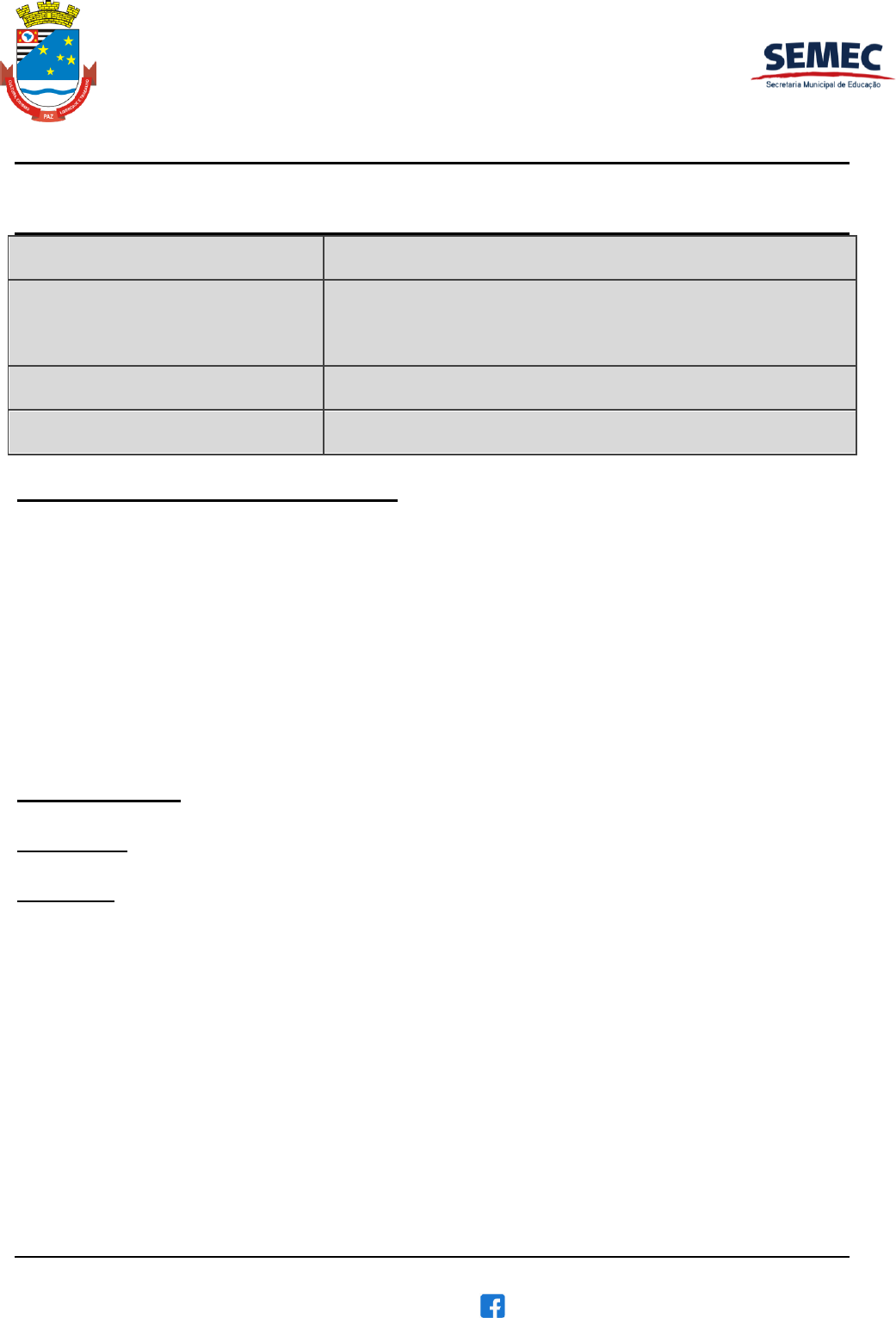 SECRETARIA MUNICIPAL DE EDUCAÇÃO E. M. PROFª MARIA GERALDINA RAMALHO GOSLING SISTEMA MUNICIPAL DE ENSINO LEI N. 3.548 DE 11 DE OUTUBRO DE 2002 Avenida Cruzeiro, 500, Bairro Vila Romana - Cruzeiro/SP – CEP: 12.722-000 – Tel.: (12) 2285-8250 facebook.com/EM-Maria-Geraldina-110728723914147 PLANO DE ENSINO – 2º SEMESTRE - 2023 Nome da Escola E.M. “PROFª MARIA GERALDINA RAMALHO GOSLING”. Nome do Professor Profª Lúcia Profª Letícia Disciplina CIÊNCIAS HUMANAS- HISTÓRIA E GEOGRAFIA Turma 3º ano A / 3º Ano B I – CARACTERIZAÇÃO DO COMPONENTE Na Educação Básica, o ensino das Ciências Humanas indica caminhos para o desenvolvimento de explorações sociocognitivas, afetivas e lúdicas, procedimentos de investigação, pensamento ético, criativo e crítico, resolução de problemas e interfaces com diferentes linguagens (oral, escrita, cartográfica, estética, técnica, entre outras), de modo a propiciar aos estudantes possibilidades para interpretar o mundo, compreender processos e fenômenos sociais, políticos, econômicos, culturais e ambientais e propor ações de intervenção a partir da sua realidade. Assim, essa área visa contribuir para a formação integral dos estudantes, para que possam reconhecer suas responsabilidades na produção do espaço social, político, cultural e geográfico, e no cuidado consigo, com o outro e com o planeta. II- HABILIDADES: 3º Bimestre: HISTÓRIA- (EF03HI06) Identificar os registros de memória na cidade (nomes de ruas, monumentos, edifícios etc.), discutindo os critérios que ao longo do tempo explicam a escolha e a alteração desses nomes. A produção dos marcos da memória: os lugares de memória (ruas, praças, escolas, monumentos, museus etc.). As pessoas e os grupos que compõem a cidade e o município (EF03HI03) Identificar e comparar pontos de vista em relação a eventos significativos do local em que vive, aspectos relacionados a condições sociais e à presença de diferentes grupos sociais e culturais, com especial destaque para as culturas africanas, a de povos originários e a de migrantes. O “Eu”, o “Outro” e os diferentes grupos sociais e étnicos que compõem as cidades: os desafios sociais, culturais e ambientais do lugar onde vive. A noção de espaço público e privado (EF03HI11) Identificar diferenças entre formas de trabalho realizadas na cidade e no campo, considerando também o uso da tecnologia nesses diferentes contextos. A cidade e suas atividades: trabalho, cultura e lazer. A noção de espaço público e privado. SECRETARIA MUNICIPAL DE EDUCAÇÃO E. M. PROFª MARIA GERALDINA RAMALHO GOSLING SISTEMA MUNICIPAL DE ENSINO LEI N. 3.548 DE 11 DE OUTUBRO DE 2002 Avenida Cruzeiro, 500, Bairro Vila Romana - Cruzeiro/SP – CEP: 12.722-000 – Tel.: (12) 2285-8250 facebook.com/EM-Maria-Geraldina-110728723914147 (EF03HI10) Identificar as diferenças entre o espaço doméstico, os espaços públicos e as áreas de conservação ambiental, compreendendo a importância dessa distinção. A cidade, seus espaços públicos e privados e suas áreas de conservação ambiental. 4º Bimestre : HISTÓRIA- (EF03HI09A) Identificar os espaços públicos e serviços essenciais na cidade (tais quais escolas, hospitais, Câmara dos Vereadores, Prefeitura, estações de tratamento e distribuição de água e esgoto), bem como suas respectivas suas funções. A cidade, seus espaços públicos e privados e suas áreas de conservação ambiental. A noção de espaço público e privado. (EF03HI09B) Analisar os problemas decorrentes da falta de acesso ou da completa ausência dos serviços públicos na cidade. A cidade, seus espaços públicos e privados e suas áreas de conservação ambiental. As pessoas e os grupos que compõem a cidade e o município (EF03HI04A) Pesquisar e identificar os patrimônios históricos e culturais de sua cidade ou região e discutir as razões culturais, sociais e políticas para que assim sejam considerados. Os patrimônios históricos e culturais da cidade e/ou do município em que vive. As pessoas e os grupos que compõem a cidade e o município. (EF03HI04B) Reconhecer a importância da preservação dos patrimônios históricos para conservar a identidade histórica do município. 3º BIMESTRE: GEOGRAFIA- (EF03GE09) Investigar os usos dos recursos naturais, com destaque para os usos da água em atividades cotidianas (alimentação, higiene, cultivo de plantas entre outros), e discutir os problemas socioambientais provocados por esses usos. (EF03GE08A) Associar consumo à produção de resíduos, reconhecendo que o consumo excessivo e o descarte inadequado acarretam problemas socioambientais, em diferentes lugares. (EF03GE08B) Propor ações para o consumo consciente e responsável, considerando a ampliação de hábitos, atitudes e comportamentos de redução, reuso e reciclagem de materiais consumidos em casa, na escola, bairro e/ou comunidade entre outros. SECRETARIA MUNICIPAL DE EDUCAÇÃO E. M. PROFª MARIA GERALDINA RAMALHO GOSLING SISTEMA MUNICIPAL DE ENSINO LEI N. 3.548 DE 11 DE OUTUBRO DE 2002 Avenida Cruzeiro, 500, Bairro Vila Romana - Cruzeiro/SP – CEP: 12.722-000 – Tel.: (12) 2285-8250 facebook.com/EM-Maria-Geraldina-110728723914147 4º BIMESTRE: GEOGRAFIA- (EF03GE10A) Reconhecer a importância da água para múltiplos usos, em especial para agricultura, pecuária, abastecimento urbano e geração de energia e discutir os impactos socioambientais dessa utilização, em diferentes lugares. (EF03GE10B) Identificar grupos e/ou associações que atuam na preservação e conservação de nascentes, riachos, córregos, rios e matas ciliares, e propor ações de intervenção, de modo a garantir acesso à água potável e de qualidade para as populações de diferentes lugares. (EF03GE07) Reconhecer e elaborar legendas com símbolos de diversos tipos de representações em diferentes escalas cartográficas III– UNIDADES TEMÁTICAS E OBJETOS DE CONHECIMENTOS: 3º BIME