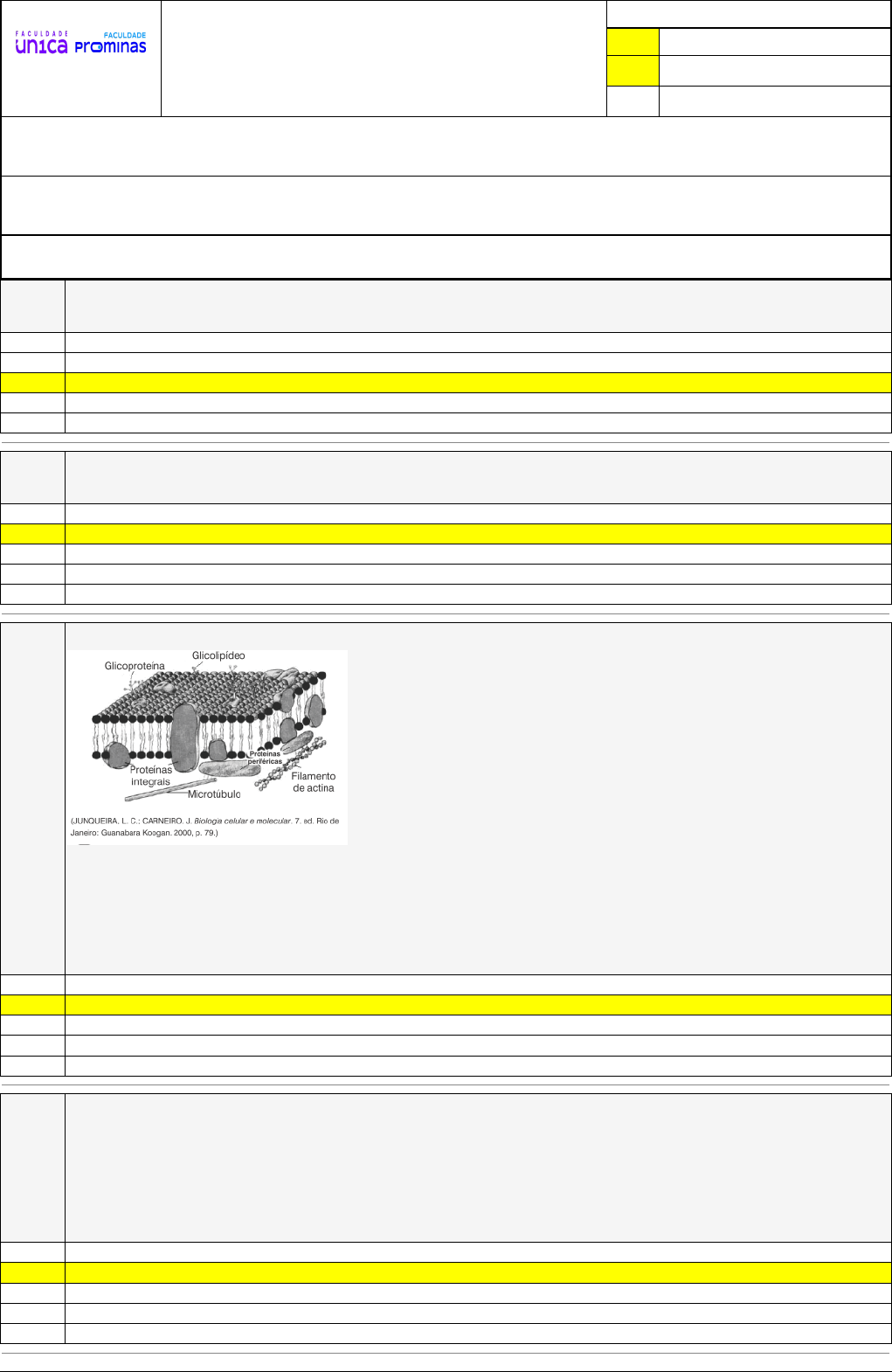 Pincel Atômico - 30/01/2024 11:53:03 1/2 JOVANA MATEUS RODRIGUES Exercício Caminho do Conhecimento - Etapa 6 (16868) Atividade finalizada em 26/01/2024 16:55:18 (1553052 / 1) LEGENDA Resposta correta na questão # Resposta correta - Questão Anulada X Resposta selecionada pelo Aluno Disciplina: PRÁTICA PEDAGÓGICA INTERDISCIPLINAR: FUNDAMENTOS E METODOLOGIA DE BIOLOGIA CELULAR, TECIDUAL E GENÉTICA [948691] - Avaliação com 8 questões, com o peso total de 1,67 pontos [capítulos - 3] Turma: Segunda Graduação: Segunda Graduação 6 meses - Licenciatura em Ciências Biológicas - Grupo: FPD-OUTUBRO/2023 - SGegu0A241023 [103382] Aluno(a): 91198043 - JOVANA MATEUS RODRIGUES - Respondeu 8 questões corretas, obtendo um total de 1,67 pontos como nota [355707_54629] Questão 001 (Perito Criminal - Polícia Civil DF - IADES – 2016) Considere hipoteticamente que, em uma amostra de DNA retirada de tecido humano encontrado em uma cena de crime, a adenina constitui 16% do total. Nesse caso, a proporção relativa às bases nitrogenadas esperada nessa amostra de DNA é de: 32% de citosina. 34% de uracila. X 68% de guanina e citosina. 16% de adenina e uracila. 16% de guanina. [355706_54625] Questão 002 (IBFC 2020/CBM-BA) A divisão celular pode ocorrer por meio dos processos de mitose e meiose. Na mitose a ploidia da célula se mantém constante, já na meiose a ploidia se reduz à metade. Assinale a alternativa que apresenta corretamente as células que são originadas do processo de meiose em humanos. Neurônios e glóbulos vermelhos. X Espermatozoide e óvulo. Célula tronco e espermatozoide. Neurônio e célula tronco. Célula tronco e glóbulos brancos. [355706_54620] Questão 003 Analise a figura a seguir: Com base na figura e nos conhecimentos sobre o tema, analise as afirmativas a seguir: I - graças a seus receptores específicos, a membrana tem a capacidade de reconhecer outras células e diversos tipos de moléculas como, por exemplo, hormônios e alguns fármacos. II - a membrana celular é permeável à água. Colocadas em uma solução hipertônica, as células aumentam de volume devido à penetração de água por osmose. Se o aumento de volume for acentuado, a membrana plasmática se rompe e o conteúdo da célula extravasa. III – na membrana plasmática existem canais proteicos que auxiliam na entrada de moléculas na célula. Baseado nas afirmativas acima se pode afirmar: estão corretas as afirmativas I, II e III. X estão corretas as afirmativas I e III. estão corretas as afirmativas II e III. nenhuma das afirmativas está correta. estão corretas as afirmativas I e II. [355707_54616] Questão 004 (COMPEC IFPB - Biologia/2015) Os átomos e as moléculas dos seres vivos são continuamente trocados, e a maioria das substâncias celulares é constantemente degradada e substituída por outras recém-fabricadas. Essa atividade intensa de montagem e desmontagem requer energia, que a célula obtém pela degradação de certos tipos de moléculas orgânicas. Além de fornecer a energia necessária à manutenção da vida, os nutrientes orgânicos fornecem matéria-prima para a fabricação de novas moléculas. Toda a atividade de transformação química no interior da célula constitui o _______________, dividido em _______________, que se refere aos processos com produção de novas substâncias a partir de substâncias mais simples, e o ________________, que se refere à degradação de substâncias complexas em outras mais simples, como a quebra da glicose (C6H12O6) em gás carbônico (CO2) e H2O, com liberação de energia. Em sequência, as palavras que completam corretamente essas lacunas são: catabolismo, anabolismo e metabolismo. X metabolismo, anabolismo e catabolismo. metabolismo, catabolismo e anabolismo. anabolismo, catabolismo e metabolismo. anabolismo, metabolismo e catabolismo. Pincel Atômico - 30/01/2024 11:53:03 2/2 [355706_54622] Questão 005 (ADM&TEC - 2019 - Prefeitura de Pedra - PE) Pesquisadores analisaram a dieta e a qualidade do sêmen de 155 homens. Eles descobriram que os indivíduos que comiam mais peixe, especialmente peixes ricos em ômega-3, como salmão ou atum, apresentavam espermatozoides mais saudáveis com melhor motilidade (movimentação), devido à energia gerada na peça intermediária dessa célula, conforme ilustrado na figura a seguir. Assim sendo, uma dieta rica em ômega-3 age diretamente sobre X as mitocôndrias da célula. a membrana plasmática da célula. os centríolos da célula. o núcleo da célula. o acrossoma da célula. [355707_54614] Questão 006 Secretaria de Estado da Saúde do Acre - AC (SESACRE/AC) 2019 A célula eucarionte tem diversas organelas que possuem funções distintas, mas que juntas formam um complexo sistema. Uma dessas organelas é o Complexo de Golgi. Quanto a melhor descrição das funções do Complexo de Golgi, assinale a alternativa correta. O Complexo de Golgi é uma organela com formato tubular e com cavidades que podem ser chamadas de lúmen ou cisternas e que participam no processo de síntese proteica. O Complexo de Golgi exerce uma importante função nas células: são responsáveis pelo processo de respiração celular. O Complexo de Golgi é um sistema de túneis responsável pela síntese proteica e secreção de hormônios esteroides. O Complexo de Golgi tem tamanho muito variável, frequentemente medindo 0,5-3,0 µm de diâmetro. Possui o interior ácido e contém diversas enzimas hidrolíticas que possuem atividade em pH ácido. O Complexo de Golgi é um depósito de enzimas utilizadas pelas células para digerir moléculas introduzidas por fagocitose. X O Complexo de Golgi é uma organela constituída por vesículas esféricas, com múltiplas funções, tem muita importância na separação e endereçamento das moléculas sintetizadas nas células, encaminhando às para as vesículas de secreção. [355706_54621] Questão 007 (FGV - 2010 – FIOCRUZ) A capacidade das células eucari