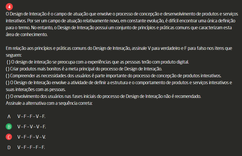 Design de interação se preocupa com a experiências que as pessoas terão com produto digital. Criar produtos mais bonitos é a meta principal do processo de Design de Interação. Compreender as necessidades dos usuários é parte importante do processo de concepção de produtos interativos. O Design de Interação envolve a atividade de definir a estrutura e comportamento de produtos e serviços interativos e suas interações com as pessoas. O envolvimento dos usuários nas fases iniciais do processo de Design de Interação não é recomendado. A) V-F-F-V-F B) V-F-V-V-F C) V-F-F-F-F D) V-V-F-V-F