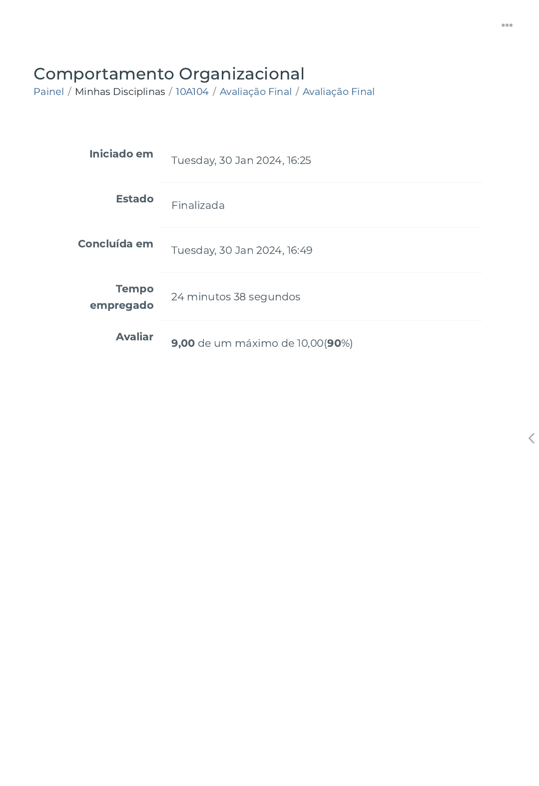 01/02/2024, 10:23 Avaliação Final https://ava.politecnicabr.com.br/mod/quiz/review.php?attempt=6255380 1/12 Painel / Minhas Disciplinas / 10A104 / Avaliação Final / Avaliação Final Comportamento Organizacional Iniciado em Tuesday, 30 Jan 2024, 16:25 Estado Finalizada Concluída em Tuesday, 30 Jan 2024, 16:49 Tempo empregado 24 minutos 38 segundos Avaliar 9,00 de um máximo de 10,00(90%) https://ava.politecnicabr.com.br/my/ https://ava.politecnicabr.com.br/my/ https://ava.politecnicabr.com.br/course/view.php?id=831 https://ava.politecnicabr.com.br/course/view.php?id=831#section-13 https://ava.politecnicabr.com.br/mod/quiz/view.php?id=21172 https://ava.politecnicabr.com.br/ 01/02/2024, 10:23 Avaliação Final https://ava.politecnicabr.com.br/mod/quiz/review.php?attempt=6255380 2/12 Questão 1 Completo Atingiu 1,00 de 1,00 O que se refere aos valores relativos ao ambiente do trabalho, Qual a diferença entre quantidade de vida e qualidade de vida? Escolha uma opção: a. A quantidade de vida diz respeito à cultura de cada região. Qualidade de vida refere-se ao grau em que as pessoas se alimentam de forma adequada e principalmente se administram bem as questões voltadas à espiritualidade. b. A qualidade de vida refere-se aos relacionamentos pro�ssionais e afetivos. A quantidade de vida se refere à violência que ocorre na sociedade e principalmente nas pressões do ambiente de trabalho. c. A quantidade de vida diz respeito à idade cronológica das pessoas. Já a qualidade de vida refere-se ao grau em que as pessoas valorizam sua saúde e como lidam com o estresse. d. A quantidade de vida diz respeito a como as pessoas observam os valores e qual a dimensão da agressividade, da violência, da busca pelo dinheiro e bens materiais, a competitividade e outros. Já a qualidade de vida refere-se ao grau em que as pessoas valorizam os relacionamentos e mostram sensibilidade e preocupação com o próprio bem-estar e também dos outros. https://ava.politecnicabr.com.br/ 01/02/2024, 10:23 Avaliação Final https://ava.politecnicabr.com.br/mod/quiz/review.php?attempt=6255380 3/12 Questão 2 Completo Atingiu 1,00 de 1,00 Quais são os três estilos pessoais no que se refere à autoconsciência? Escolha uma opção: a. A pessoa experiente, a amargurada e a resignada. b. A pessoa autoconsciente, a amarga e a resignada. c. A pessoa experiente, a mergulhada e a resignada. d. A pessoa autoconsciente, a mergulhada e a resignada. https://ava.politecnicabr.com.br/ 01/02/2024, 10:23 Avaliação Final https://ava.politecnicabr.com.br/mod/quiz/review.php?attempt=6255380 4/12 Questão 3 Completo Atingiu 1,00 de 1,00 O Modelo Coalizão Dominante aborda as seguintes questões: Escolha uma opção: a. que a empresa é vista como uma coalizão de diferentes interesses, onde a tomada de decisão ocorre por compromissos, barganhas e negociações entre dirigentes de diferentes funções e áreas. Qualquer solução escolhida tem a aprovação da coalizão dominante. O estilo de tomada de decisão é racional no sentido de que os dirigentes agem intencionalmente para encontrar a melhor solução para os objetivos almejados. b. que a empresa é vista como um time de trabalho com interesses iguais, onde a tomada de decisão ocorre por votação, barganhas e principalmente por con�itos entre dirigentes de diferentes funções e áreas. Qualquer solução escolhida é acatada pela pessoa dominante. O estilo de tomada de decisão é radical no sentido de que os dirigentes agem intencionalmente para encontrar a melhor solução para os objetivos almejados. c. que a empresa não se preocupa muito com a tomada de decisão, ocorrendo de forma natural sem estresse e sem con�itos. No momento adequado as situações acontecem de forma clara e precisa sem uma liderança efetiva. Qualquer situação que surja no cotidiano será bem vinda. Os colaboradores sentem-se con�antes na tomada de decisão e procuram não perder tempo com discussões desnecessárias. O clima organizacional interno é excelente, todos se relacionam de forma efetiva e assertiva. d. que a empresa é vista com diferentes interesses, onde a tomada de decisão ocorre por compromissos e negociações entre os colaboradores de diferentes funções e áreas. Qualquer solução escolhida tem a aprovação do líder do grupo. O estilo de tomada de decisão é puramente emocional no sentido de que os dirigentes agem de forma impulsiva sem controle da situação e normalmente não atingem os objetivos almejados. https://ava.politecnicabr.com.br/ 01/02/2024, 10:23 Avaliação Final https://ava.politecnicabr.com.br/mod/quiz/review.php?attempt=6255380 5/12 Questão 4 Completo Atingiu 1,00 de 1,00 Como é possível lidar com o con�ito? Escolha uma opção: a. Podemos administrar de forma efetiva, colocando limites e parâmetros em todas as situações. b. Existem inúmeras alternativas para indivíduos e grupos lidarem com o con�ito. Estes podem ser ignorados ou abafados ou, até mesmo, sanados e transformados num elemento auxiliar na evolução de uma sociedade ou organização. c. Só existe uma forma de lidar com o con�ito, punindo a pessoa que deu início a esse processo. d. Não é possível lidar com os con�itos, eles fazem parte do cotidiano e são importantes para a dinâmica pro�ssional. https://ava.politecnicabr.com.br/ 01/02/2024, 10:23 Avaliação Final https://ava.politecnicabr.com.br/mod/quiz/review.php?attempt=6255380 6/12 Questão 5 Completo Atingiu 0,00 de 1,00 Qual o signi�cado de cultura organizacional? Escolha uma opção: a. Cultura institucional diz respeito a um �uxo de signi�cados comuns aos membros de uma organização, unindo uma organização a outras, pode, ainda, ser de�nida como um conjunto de derivados fundamentais considerados essenciais pela organização. b. Cultura organizacional diz respeito a um sistema de signi�cados comuns aos membros de uma organização, distinguindo uma organização das outras, p