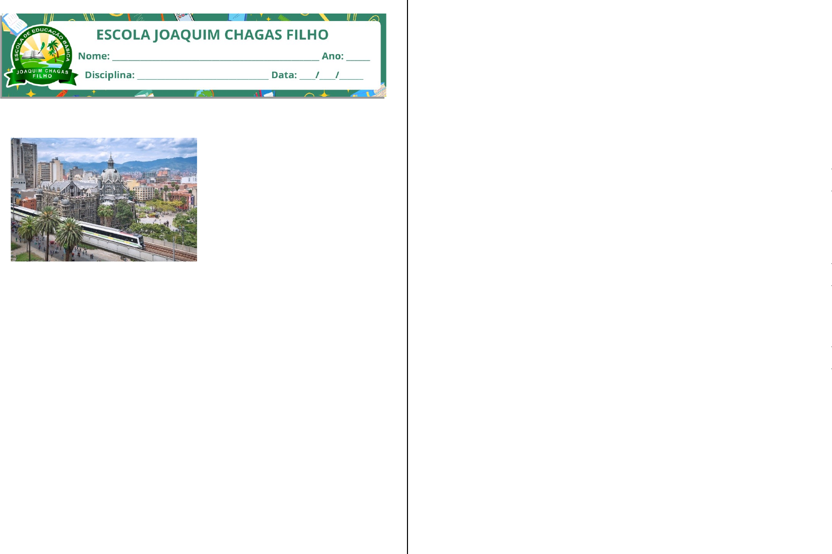 PROVA BIMESTRAL – 1º B - 2023 Text 1 for questions 1-4 How Medellin went from murder capital to hipster holiday destination Twenty-five years ago, Time magazine dubbed Colombia’s Medellin “the most dangerous city on earth”. […] Even 10 years ago, Medellin was a “bad-ass town”. Violence reigned, civil society had been destroyed and no one seemed to know how to put Medellin back together again. Fast-forward to the present, and Medellin is a delightful place of law-abiding entrepreneurial folk. With an economy that is among the fastest growing on the continent, it is one of the great success stories of Latin America. In 2013, Medellin was hailed as “the most innovative city in the world” by the Urban Land Institute, brimming with creative ideas for urban living, like the eco-árbol, a tree-like structure that acts as an air-purifier, and the spectacular Orquideorama for growing orchids. In Barefoot Park, where passers-by are encouraged to discard their shoes to wriggle their toes in pebbles, mud, and soft grass before finally soaking their feet in pools of water, I asked my guide, Julian, what had happened, how Medellin had gone from gangs and gunfire to zen-like experiences for bare feet. “Public transport,” he said. It was a moment before I realised he was serious. “Don’t laugh,” he chided me. “The metro was the beginning of all the good stuff. It was like a bridge to a different world. We suddenly realised that things could change. It was the beginning of a revolution in Medellin.” […] GLOSSARY law-abiding: que obedece à lei entrepreneurial: empreendedor(a) folk: gente, povo hailed: chamada, considerada brimming: transbordando, fervilhando pebble: cascalho chide: censurar 1. Read the news article’s extract and mark the true statement according to it. a) Medellin has always been a safe and pleasant place. b) Medellin’s transformation started approximately in 2000. c) A poor transport system is the biggest problem in Medellin. d) Medellin is a model of urban regeneration in Latin America. 2. Read the article again and answer the questions according to it. a) Which organization considered Medellin as “the most innovative city in the world”? b) Where can the visitors take off their shoes and enjoy walking through grass and water? c) What is the name of Stanley Stewart’s guide in Medellin? 3. Check the alternative with the correct order of the following topics in the text. a) IV, III, I, II b) IV, III, II, I c) I, II, III, IV d) IV, II, III, I I. Examples of innovations and nice places in Medellin. II. Conversation with the guide about what have transformed Medellin. III. The city’s economic growth and tranquility nowadays. IV. Medellin’s past as a very dangerous city. 4. Releia os três últimos parágrafos do texto. De acordo com Julian, o que desencadeou a transformação de Medellín foi o transporte público (public transport). Em sua opinião, como um transporte público de qualidade pode ajudar a combater a violência em uma cidade? 5. Complete as frases com os pronomes pessoais em inglês: he, she, it, we e they. a) Mike is ten years old. ______ is ten years old. b) Tim and I are friends. ______ are friends. c) Elena is a teacher. _____ is a teacher. d) The house is old. ______ is old. e) Carol and Pedro are from Spain. ______ are from Spain. f) The boys are in the kitchen. _______ are in the kitchen. 6. Escolha wasn’t ou weren’t: a) I _______________ at the museum last friday. b) We _____________ thirsty. c) You ____________here the day before yesterday. d) The book ___________ on the desk last week. e) Your hands _____________ dirty last class. 7. Reescreva as frases usando a forma interrogativa: Ex: They were absent yesterday _ Were they absent yesterday? a) You were at work. ___________________________________________________________ b) It was in the garden. ___________________________________________________________ c) They were worried. ___________________________________________________________ d) Lucy was present. ___________________________________________________________ e) His friend were late. ___________________________________________________________ 8. Complete com respostas curtas (short answers). Ex: A) Was Nick at your college? B) No, he wasn’t. A) Were they at the zoo? B) Yes, __________ A) Was the test easy? B) Yes, __________ A) Was Sam with you? B) No, __________ A) Were you angry? B) Yes, __________ A )Were the tickets cheap? B) No, __________ 9. Re-arrange the sentence. a) I / not / a teacher. / am ______________________________________________________ b) She / my mother. / is ______________________________________________________ c) The boys / playful. / are ______________________________________________________ d) The girl / in the room. / is ______________________________________________________ e) We / not / are / at home. ______________________________________________________ f) My dad / smart. / is ______________________________________________________ g) My mother / a housewife. / is ______________________________________________________ h) She / not / my sister. / is ______________________________________________________ i) The teacher / angry. / is ______________________________________________________ j) The dog / in the kennel. / is ______________________________________________________ 10. Write the names of the professions below on the respective pictures. BAKER – MECHANIC – HAIRDRESSER – DENTIST - VETERINARIAN - DOCTOR