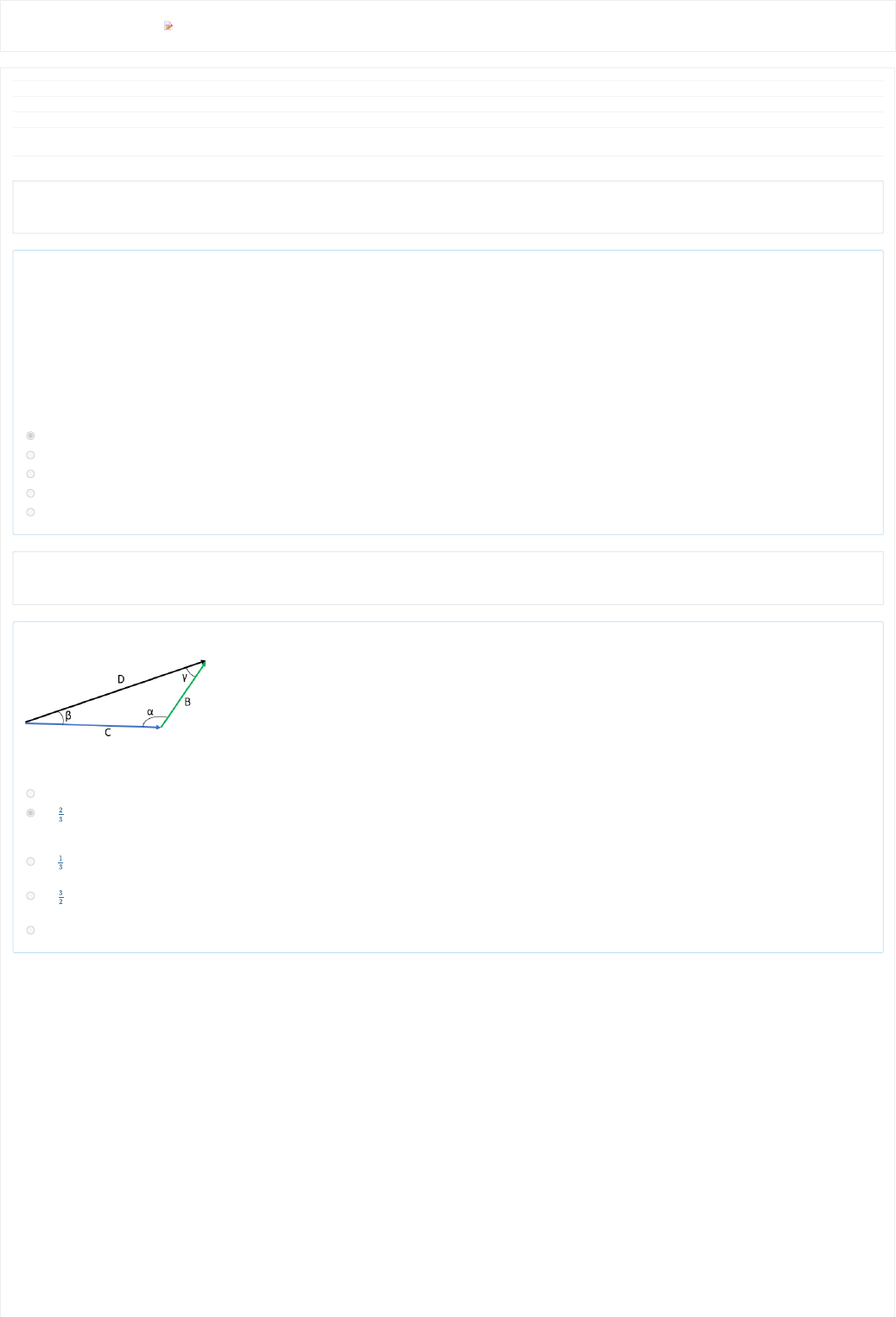 01/02/2024, 07:36 ATIVIDADE ONLINE 1 - AV12024/1 https://moodle.ead.unifcv.edu.br/mod/quiz/review.php?attempt=3379631#q4 1/4 Painel / Meus cursos / FGENGP / 📝 AVALIAÇÕES 2024/1 / ATIVIDADE ONLINE 1 - AV12024/1 Iniciado em segunda, 22 jan 2024, 07:32 Estado Finalizada Concluída em quinta, 1 fev 2024, 07:36 Tempo empregado 10 dias Avaliar 1,60 de um máximo de 2,00(80%) Questão 1 Correto Atingiu 0,20 de 0,20 Na Física, considerando todas as diversas grandezas com as quais trabalhamos, pode-se dividí-las em dois grandes grupos: as grandezas vetoriais, que podem ser representadas por vetores, e as escalares, que não podem ser representadas vetorialmente. A seguir estão apresentadas quatro grandezas. I – Tempo. II – Velocidade. III – Massa. IV – Temperatura. Assinale a alternativa que apresenta quais destas grandezas são consideradas escalares. Escolha uma opção: a. I, III e IV, apenas. b. I, II, III e IV. c. I e II, apenas. d. II e IV, apenas. e. II, III e IV, apenas. Questão 2 Correto Atingiu 0,20 de 0,20 Os vetores apresentados abaixo são representados pelas letras B, C e D, formando os ângulos α, β e γ. Sabe-se que o ângulo α é duas vezes maior do que o ângulo γ e três vezes maior do que o ângulo β. Com base nessas informações, assinale a alternativa que apresenta a relação entre os módulos B/C. Escolha uma opção: a. 2 b. c. d. e. 1 2 3 1 3 3 2 https://moodle.ead.unifcv.edu.br/my/ https://moodle.ead.unifcv.edu.br/my/ https://moodle.ead.unifcv.edu.br/course/view.php?id=1552 https://moodle.ead.unifcv.edu.br/course/view.php?id=1552#section-5 https://moodle.ead.unifcv.edu.br/mod/quiz/view.php?id=160837 01/02/2024, 07:36 ATIVIDADE ONLINE 1 - AV12024/1 https://moodle.ead.unifcv.edu.br/mod/quiz/review.php?attempt=3379631#q4 2/4 Questão 3 Correto Atingiu 0,20 de 0,20 Uma partícula se move em linha reta, sendo sua posição, S, podendo ser determinada com base no tempo, t, considerando-se a equação horária S = 5 + 3.t² + 5.t³, com todas as unidades no S.I.. Com base nestes dados, são feitas as seguintes afirmações: I – A velocidade média entre os instantes 0 e 5 s é igual a 141 m/s. II – A posição 170 m será atingida em menos de 3 segundos. III – O movimento em questão é retilíneo e uniforme. IV – A velocidade instantânea no instante t = 2 s é igual a 57 m/s. É correto o que se afirma em: Escolha uma opção: a. II e III, apenas. b. I e IV, apenas. c. II, III e IV, apenas. d. I, II, III e IV. e. I e II, apenas. Questão 4 Incorreto Atingiu 0,00 de 0,20 Na figura a seguir estão apresentados os vetores B e C junto ao vetor A, que é resultado da soma entre ambos os vetores. Os ângulos são representados pelas letras α, β e γ. Sabe-se que o módulo de A é igual ao sêxtuplo do módulo de C e igual ao triplo do módulo de B. Com base nisso, analise as afirmativas a seguir. I – O ângulo α é 6 vezes maior do que o ângulo γ. II – O ângulo γ é igual a metade do ângulo β. III – O ângulo α é igual a 120º. IV – Pode-se determinar o módulo de A usando o teorema de Pitágoras. É correto o que se afirma em: Escolha uma opção: a. I e II, apenas. b. I, II, III e IV. c. II, III e IV, apenas. d. I, apenas. e. I, II e III, apenas. Questão 5 Correto Atingiu 0,20 de 0,20 Como forma de simplificar a escrita, muitas vezes nós usamos prefixos junto às siglas das unidades. Por exemplo, o prefixo k em frente a uma sigla significa que teremos aquela unidade multiplicada por mil. Considere os seguintes valores: 10 µg, 7 ms e 4 hm. Assinale a alternativa que apresenta estes valores, respectivamente, com suas unidades dadas seguindo o Sistema Internacional. Escolha uma opção: a. 0,00001 kg, 0,0007 s e 400 m. b. 0,00001 g, 0,007 s e 40 m. c. 0,000001 g, 0,0000019 s e 40 m. d. 0,00000001 kg, 0,07 s e 0,4 m. e. 0,00000001 kg, 0,007 s e 400 m. 01/02/2024, 07:36 ATIVIDADE ONLINE 1 - AV12024/1 https://moodle.ead.unifcv.edu.br/mod/quiz/review.php?attempt=3379631#q4 3/4 Questão 6 Correto Atingiu 0,20 de 0,20 Uma mola ideal é presa verticalmente a um suporte e, em seguida, um objeto A é preso à ponta livre dela. Nota-se que a mola acaba se estendendo em 8 cm. Em seguida, o objeto A é retirado e em seu lugar é colocado o objeto B, o qual tem o dobro da massa de A, e a mola novamente é estendida. Por último, sem retirar o objeto B, posiciona-se o objeto C junto a ele, fazendo com que a mola se estenda em 20 cm. Com base nas situações expostas, são feitas as seguintes afirmações: I – Caso os objetos A e B fossem presos à mola simultaneamente, a mesma se deformaria em 16 cm. II – Caso o objeto A fosse adicionado ao sistema final, a mola ficaria estendida em 28 cm. III – As informações são insuficientes para determinar a constante elástica da mola. IV – A massa do objeto C é igual à massa do objeto A. É correto o que se afirma em: Escolha uma opção: a. I e II, apenas. b. II e III, apenas. c. II, III e IV, apenas. d. I e IV, apenas. e. I, II, III e IV. Questão 7 Incorreto Atingiu 0,00 de 0,20 As equações relacionadas a movimentos, as quais foram estudadas no decorrer da disciplina, também são válidas para a prática. Entretanto, há diversos fatores externos que podem influenciar a realização do experimento. A respeito de práticas referentes a movimentos retilíneos, são feitas as seguintes afirmações: I – Se dois corpos de mesma massa iniciarem um movimento simultâneo e sob a mesma velocidade, ambos terão resultados idênticos. II – O cronômetro manejado por um ser humano indicará resultados iguais ao cronômetro controlado por um computador. III – A descrição da metodologia utilizada permite a realização de estudos com resultados similares, mas não necessariamente idênticos. IV – Os dados referentes à distância e ao tempo necessários podem ser organizados num gráfico, o que permite calcular a velocidade do corpo em determinados instantes. É correto o que se afirma em