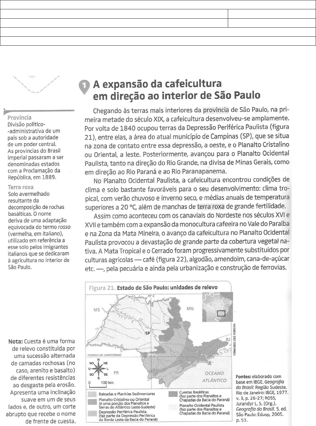 Atividades Nome: Série: 7º Ano Professor: Disciplina: GEOGRAFIA Orientações: Leia os textos e responda as questões. Observações: Responda a caneta. Olá Aluno!!! Bem-vindo ao tema Região Sudeste: a organização do espaço. Leia atentamente o texto, conjuntamente, faça associações mentais entre as imagens e os conceitos apresentados. Anote em seu caderno palavras-chave, conceitos e dicas para uma maior fixação do que você aprendeu. Faça as atividades com atenção e se tiver dúvidas volte ao texto, certamente você encontrará a resposta. Exercícios 1 - A expansão da economia do café para o Oeste Paulista, na segunda metade do século XIX, e a grande imigração para a lavoura de café trouxeram modificações na história do Brasil, como: a) o fortalecimento da economia de subsistência e a manutenção da escravidão. b) a diversificação econômica e o avanço do processo de urbanização. c) a divisão dos latifúndios no Vale do Paraíba e a crise da economia paulista. d) o fim da república oligárquica e o crescimento do movimento camponês. 2 - A economia cafeeira foi a principal atividade econômica no século 19, sendo desenvolvido seu cultivo em grande escala primeiramente: a) no Oeste paulista b) no Sul da Bahia c) no Norte paranaense d) na Região amazônica 3 - A região conhecida como Oeste Paulista conseguiu destacar-se na produção cafeeira, no século XIX, após a queda nas condições de cultivo na Baixada Fluminense. Dentre as alternativas abaixo, assinale a que possui informações incorretas sobre os motivos da preponderância da produção paulista. a) Inspeção sistemática das lavouras. b)Renovação constante das técnicas de plantio. c) Utilização de maquinário na colheita do café. d) Criação de uma infraestrutura necessária à produção cafeeira. 4 - A economia cafeeira sustentou financeiramente o Brasil durante o Segundo Império, sendo ainda a fonte de acumulação de capitais necessários ao posterior processo de industrialização da economia nacional. Mas qual outro setor foi estimulado com a economia cafeeira? a) Setor de transportes marítimos. b) Setor de transportes fluviais. c) Setor de transporte ferroviário. d) Setor de transporte rodoviário. 5 - O Sudeste brasileiro é a região mais urbanizada e possui a maior concentração industrial do país. Explique os fatores que proporcionaram esse desenvolvimento industrial nos estados do Sudeste. ________________________________________________________________________________ ________________________________________________________________________________ ________________________________________________________________________________ ________________________________________________________________________________ Bons estudos!!! Um abraço do professor.