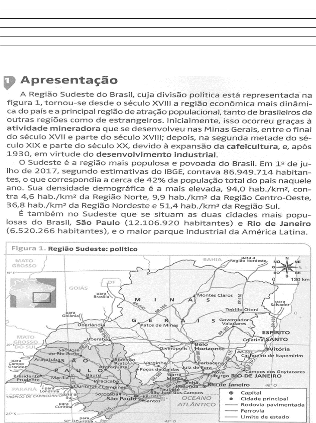 Atividades Nome: Série: 7º Ano Professor: Disciplina: GEOGRAFIA Orientações: Leia os textos e responda as questões. Observações: Responda a caneta. Olá Aluno!!! Bem-vindo ao tema Região Sudeste: o meio natural. Leia atentamente o texto, conjuntamente, faça associações mentais entre as imagens e os conceitos apresentados. Anote em seu caderno palavras- chave, conceitos e dicas para uma maior fixação do que você aprendeu. Faça as atividades com atenção e se tiver dúvidas volte ao texto, certamente você encontrará a resposta. Exercícios 1 – Identifique a região Sudeste no mapa do Brasil. a) 1 b) 2 c) 3 d) 4 e) 5 2 - A área do Sudeste ocupada pelo clima semiárido situa-se: a) norte de São Paulo. b) sul de Minas Gerais. c) norte de Minas Gerais. d) norte do Espírito Santo. e) sul de São Paulo. 3 - Área de floresta Tropical da Região Sudeste quase totalmente devastada, restando apenas 7% de sua extensão original: a) Mata Atlântica. b) Floresta Amazônica. c) Mata de Araucária. d) Floresta Temperada. e) Caatinga. 4 - O texto abaixo descreve um dos domínios morfoclimáticos do Brasil. Leia com atenção e assinale a opção que o indica corretamente: “Esse domínio paisagístico localiza-se na porção litorânea do país, desde o Nordeste até o Sul, penetrando mais para o interior no Sudeste, particularmente em São Paulo. Corresponde à unidade de relevo denominada planaltos e serras do Atlântico leste-sudeste. Têm origem em serras erodidas principalmente pelas chuvas, e isso ocorre porque esse domínio se localiza sobre terrenos cristalinos onde predominam os granitos e gnaisses. Pelo fato de se localizar relativamente próximo ao litoral, essa paisagem natural vem sendo intensamente ocupada desde a época colonial, razão pela qual abriga hoje as maiores densidades demográficas do país, sediando grandes metrópoles.” a) Domínio das Pradarias; b) Domínio da Araucária; c) Domínio dos Mares de Morros; d) Domínio da Caatinga; 5 - A Mata Atlântica, que originalmente se estendia por todo o litoral brasileiro, do Rio Grande do Norte ao Rio Grande do Sul, ostenta hoje o triste título de uma das florestas mais devastadas do mundo. Com mais de 1 milhão de quilômetros quadrados, hoje restam apenas 7% da vegetação original, como mostram as figuras abaixo. Descreva os fatores responsáveis por essa degradação. ________________________________________________________________________________ ________________________________________________________________________________ ________________________________________________________________________________ ________________________________________________________________________________ ________________________________________________________________________________ ________________________________________________________________________________ Bons estudos!!! Um abraço do professor.
