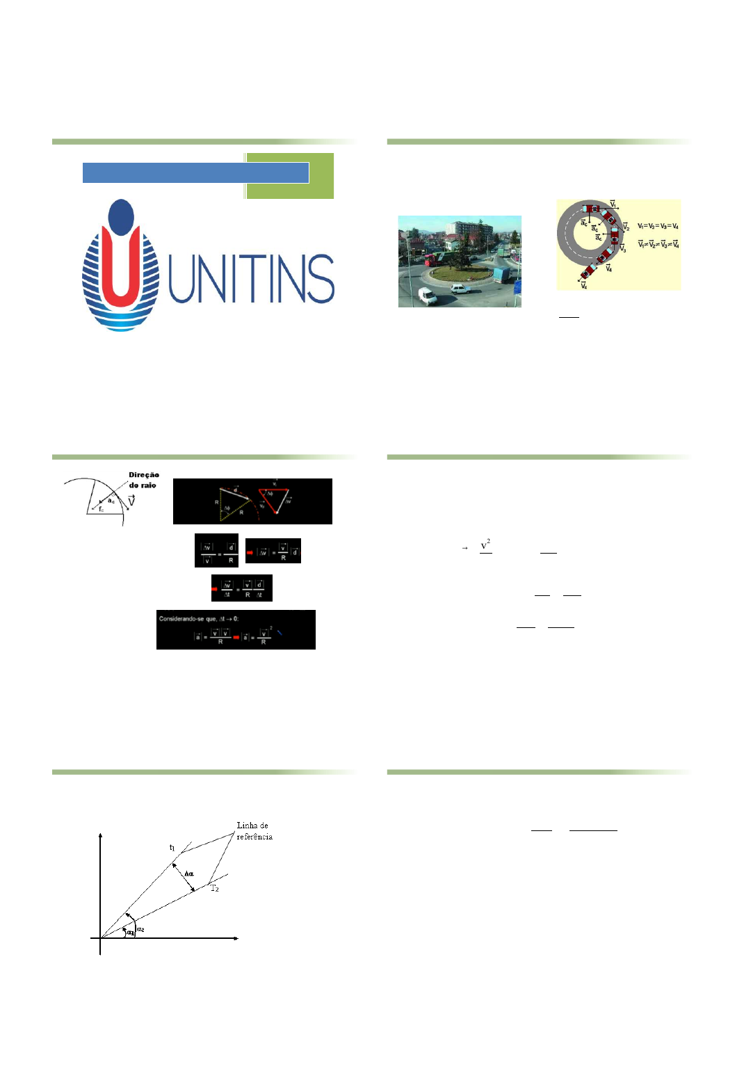 24/03/2020 1 2012 Prof: Joelson de Araújo Delfino FÍSICA GERAL PALMAS - 2010 Prof: Dr. Joelson de Araújo Delfino MOVIMENTO CIRCULAR UNIFORME: A ACELERAÇÃO É SEMPRE DIRIGIDA PARA O CENTRO DA TRAJETÓRIA E A VELOCIDADE É SEMPRE TANGENTE A ESSA TRAJETÓRIA. r v a 2 MOVIMENTO CIRCULAR UNIFORME: EXEMPLO 1 Um ciclista corre ao redor de uma pista circular com velocidade de 10 m/s e com aceleração centrípeta de 4 m/s2. (a) qual o raio da pista? (b) quanto tempo o ciclista leva para dar uma volta completa na pista com essa velocidade? 2 2v 10 a) a 4 r 25 m r r x 2 r b) v t t 2 r 2 25 t 15,7 s v 10 Movimento de rotação Deslocamento Angular = 2 - 1 Movimento de rotação Velocidade angular 12 12 média ttt onde sua unidade de medida SI é rad/s ou ver/s. 24/03/2020 2 Movimento de rotação velocidade angular instantânea dt d t lim 0t f.2 T 1 2 T 2 t média Seja igual a um ângulo de volta inteira ou seja 2 rad a variação de tempo por t = T. temos: Movimento de rotação Relacionando a velocidade escalar circular, com a velocidade angular temos: f.R2 T 1 R2 T R2 t s vm f2 T 1 2 T 2 t média R v ouR.v Exemplo1: Um corpo se movimenta em trajetória circular no sentido anti-horário. Nos instante 4 s e 8 s suas posições são, respectivamente, 40° e 160°. Determine o ângulo descrito nesse intervalo de tempo e a velocidade angular média. Deslocamento Angular Velocidade angular 3 2 ou120 40160 12 s/rad 6 4 3 2 t m m Movimento de rotação Aceleração angular 12 12 ttt onde sua unidade de medida SI é rad/s2 ou ver/s2. relação entre a aceleração escalar a e a aceleração angular . m Acel. angular t V. escal. V. ang. v v .R ou R Movimento de rotação Aceleração angular X Aceleração escalar acel. esc v 1 vR . t R t a a R. R Uma partícula está a uma velocidade de 3 rad/s, após 20s ele se encontra a uma velocidade 8 rad/s. Determine a aceleração dessa partícula no intervalo de tempo dado. 22 1 2 1 8 rad / s 3 rad / s 0,25 rad / s t t t 20 EXEMPLO 2 24/03/2020 3 Dadas duas partículas x e y, que se deslocam sobre uma circunferência concêntricas de raios R1 e R2, com R2 = 3R1, as quais se encontram ás velocidade angulares 1 e 2 respectivamente. Qual a razão entre 1 e 2 (1/ 2), sabendo que as partículas têm a mesma velocidade escalar v. R v ouR.v R2 R1 1 1 2 1.R .3R 2 1Como R 3R Mesma velocidade 11 2 3 R 1R 3 EXEMPLO 3 MACK-SP) Devido ao movimento de rotação da Terra, uma pessoa sentada sobre a linha do Equador tem velocidade escalar, em relação ao centro da Terra, igual a: Adote: Raio equatorial da Terra = 6 300 km e π = 22/7 R v ouR.v 2 v R T 22 2 7v 6300 24 v 1650 km / h EXEMPLO 4 BOM ESTUDO QUE DEUS ABENÇOE A VOCÊS E TODA SUA FAMÍLIA HOJE E SEMPRE