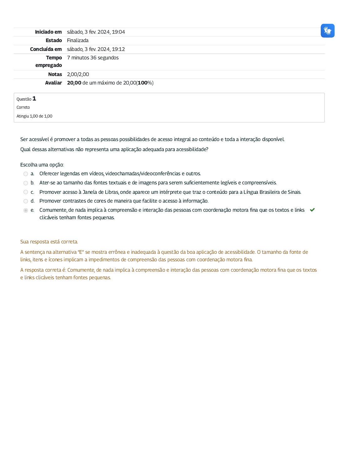 03/02/2024, 19:12 Exercício Avaliativo - Módulo 2: Revisão da tentativa https://mooc41.escolavirtual.gov.br/mod/quiz/review.php?attempt=1746288&cmid=40853 1/2 Iniciado em sábado, 3 fev. 2024, 19:04 Estado Finalizada Concluída em sábado, 3 fev. 2024, 19:12 Tempo empregado 7 minutos 36 segundos Notas 2,00/2,00 Avaliar 20,00 de um máximo de 20,00(100%) Questão 1 Correto Atingiu 1,00 de 1,00 Ser acessível é promover a todas as pessoas possibilidades de acesso integral ao conteúdo e toda a interação disponível. Qual dessas alternativas não representa uma aplicação adequada para acessibilidade? Escolha uma opção: a. Oferecer legendas em vídeos, videochamadas/videoconferências e outros. b. Ater-se ao tamanho das fontes textuais e de imagens para serem su�cientemente legíveis e compreensíveis. c. Promover acesso à Janela de Libras, onde aparece um intérprete que traz o conteúdo para a Língua Brasileira de Sinais. d. Promover contrastes de cores de maneira que facilite o acesso à informação. e. Comumente, de nada implica à compreensão e interação das pessoas com coordenação motora �na que os textos e links clicáveis tenham fontes pequenas. Sua resposta está correta. A sentença na alternativa “E” se mostra errônea e inadequada à questão da boa aplicação de acessibilidade. O tamanho da fonte de links, itens e ícones implicam a impedimentos de compreensão das pessoas com coordenação motora �na. A resposta correta é: Comumente, de nada implica à compreensão e interação das pessoas com coordenação motora �na que os textos e links clicáveis tenham fontes pequenas. 03/02/2024, 19:12 Exercício Avaliativo - Módulo 2: Revisão da tentativa https://mooc41.escolavirtual.gov.br/mod/quiz/review.php?attempt=1746288&cmid=40853 2/2 Questão 2 Correto Atingiu 1,00 de 1,00 Considere a relevância da previsibilidade dos sistemas para analisar as sentenças abaixo. Marque a alternativa mais adequada: Escolha uma opção: a. A previsibilidade da interface não pode ser concebida como padrão a ser seguido na tecnologia. b. Estrategicamente, é recomendável entregar uma interface inesperada ao usuário, assim, aguça o entusiasmo durante a interação digital e se obtém mais interesse e motivação para concluir a atividade. c. Para o usuário, uma interface previsível é a oportunidade de compreender previamente o que acontecerá após o próximo passo. d. É de baixa relevância que componentes e templates para as interfaces dos diversos sistemas tenham a mesma lógica de navegação. e. Padronização e previsibilidade das interfaces implicam em curvas de aprendizado dispares a cada interação com o sistema. Sua resposta está correta. A alternativa “A” está incorreta. Na verdade, as interfaces podem sim buscar cada vez mais serem padronizadas, previsíveis e intuitivas. Isso se dá pelo reconhecimento das experiências anteriores dos seus usuários, mantendo, assim, a padronização dos sistemas. A alternativa “B” está incorreta. Na verdade, uma interface previsível promove a possibilidade de antecipar a próxima ação, ou seja, entender previamente o que acontecerá após o próximo passo. A alternativa “C” está correta! A alternativa “D” está incorreta. É uma iniciativa plausível apresentar componentes, templates e padrões para que as interfaces dos diversos sistemas tenham a mesma lógica de navegação. Isso possibilita uma interação cada vez mais e�ciente para o cidadão. A alternativa “E” está incorreta. Na verdade, a ausência de padronização e previsibilidade nas interfaces, por exigir maior re�exão dos usuários a cada nova interação com o sistema, implicam novas curvas de aprendizado. A resposta correta é: Para o usuário, uma interface previsível é a oportunidade de compreender previamente o que acontecerá após o próximo passo.